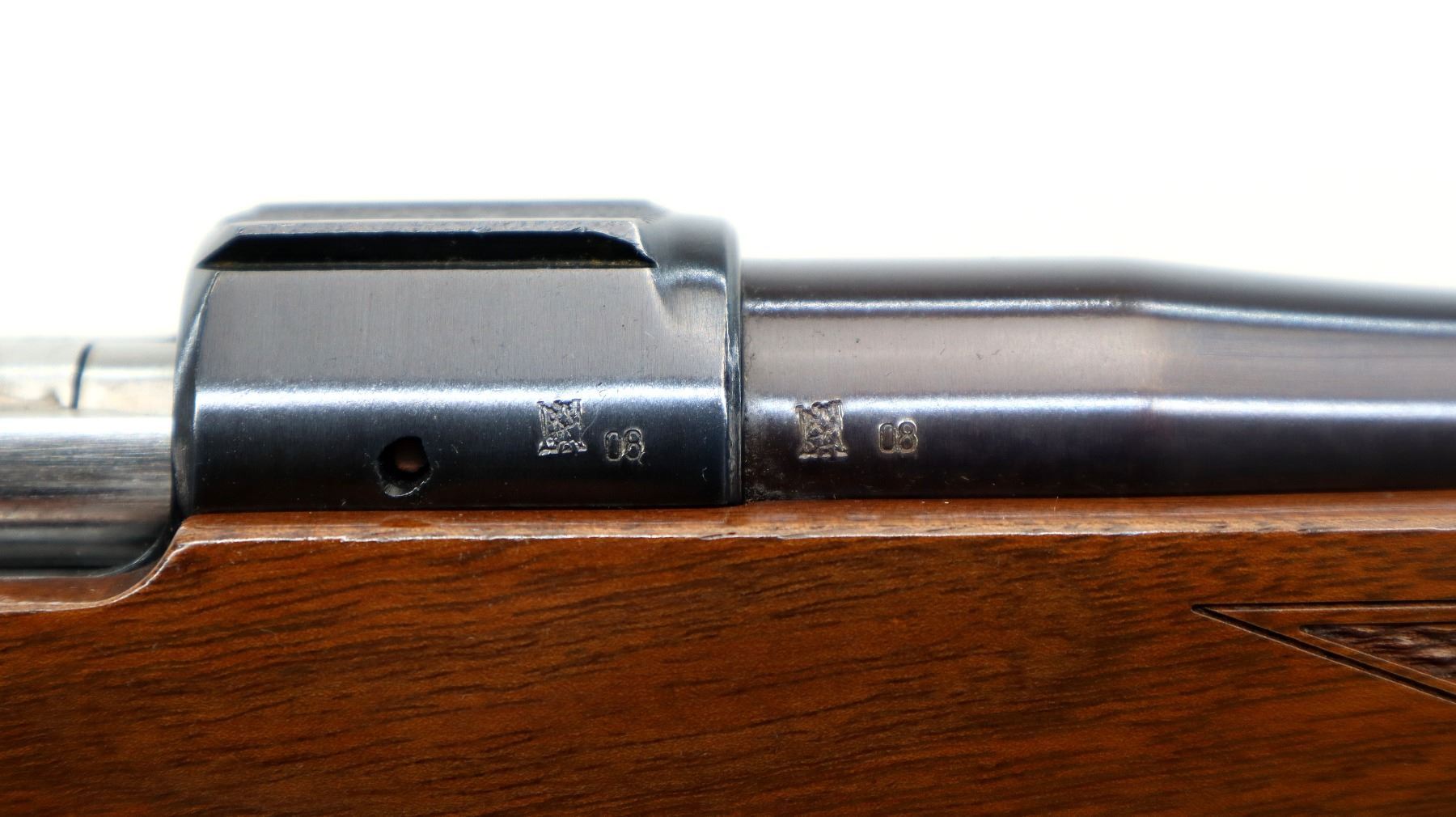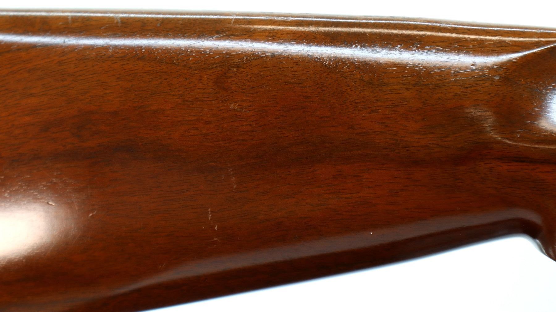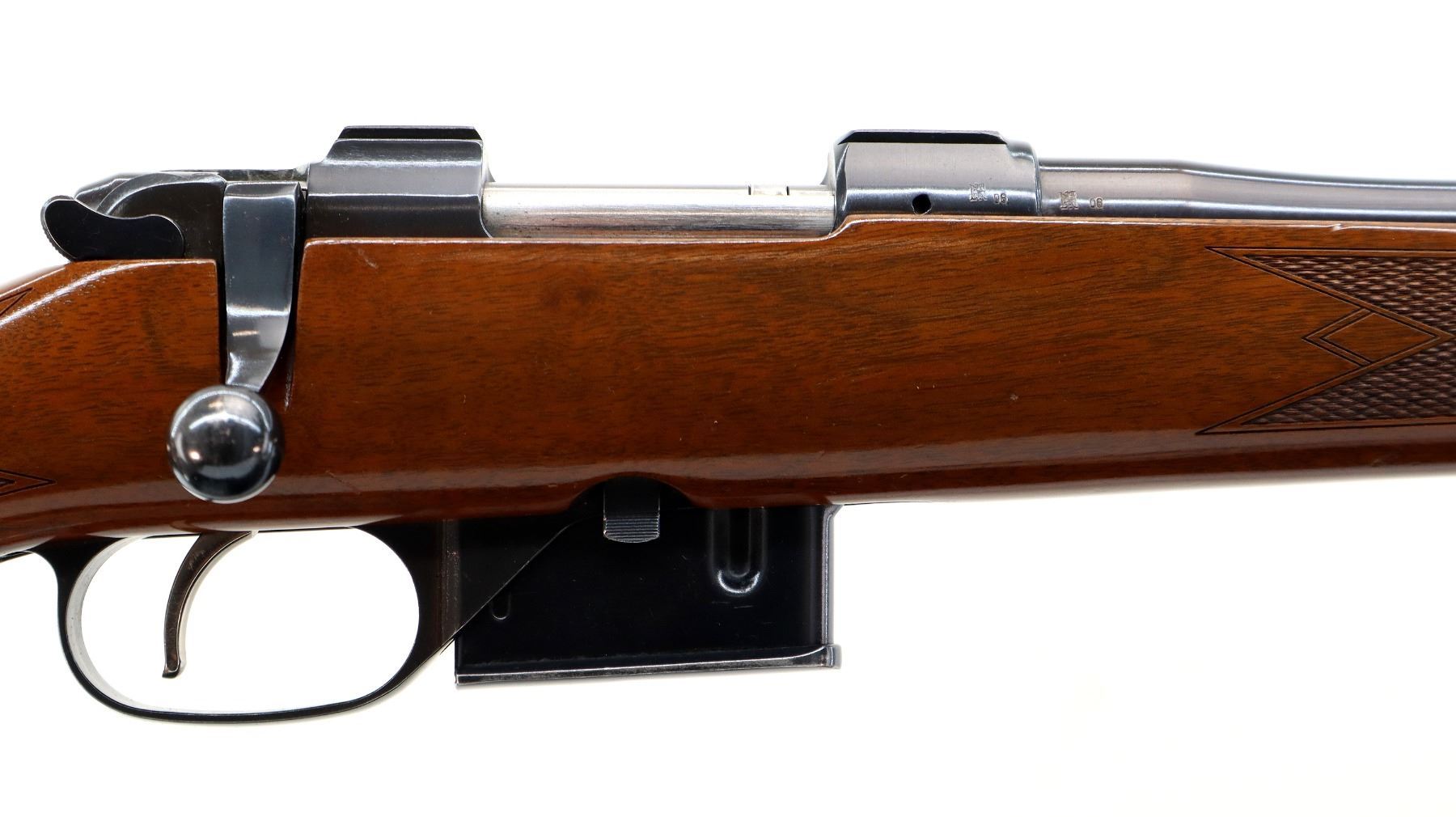 Main Description: No sights, blued finish, tapered round barrel, receiver has integral scope bases, smooth bolt knob. One piece wood stock, checkered forearm and pistol grip, black rubber recoil pad, swivel studs.