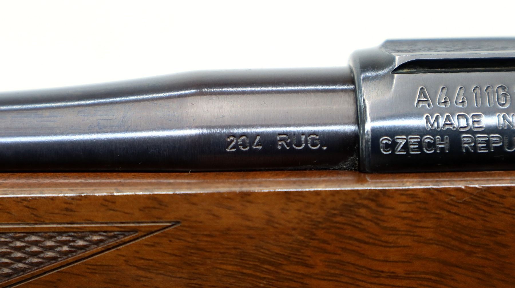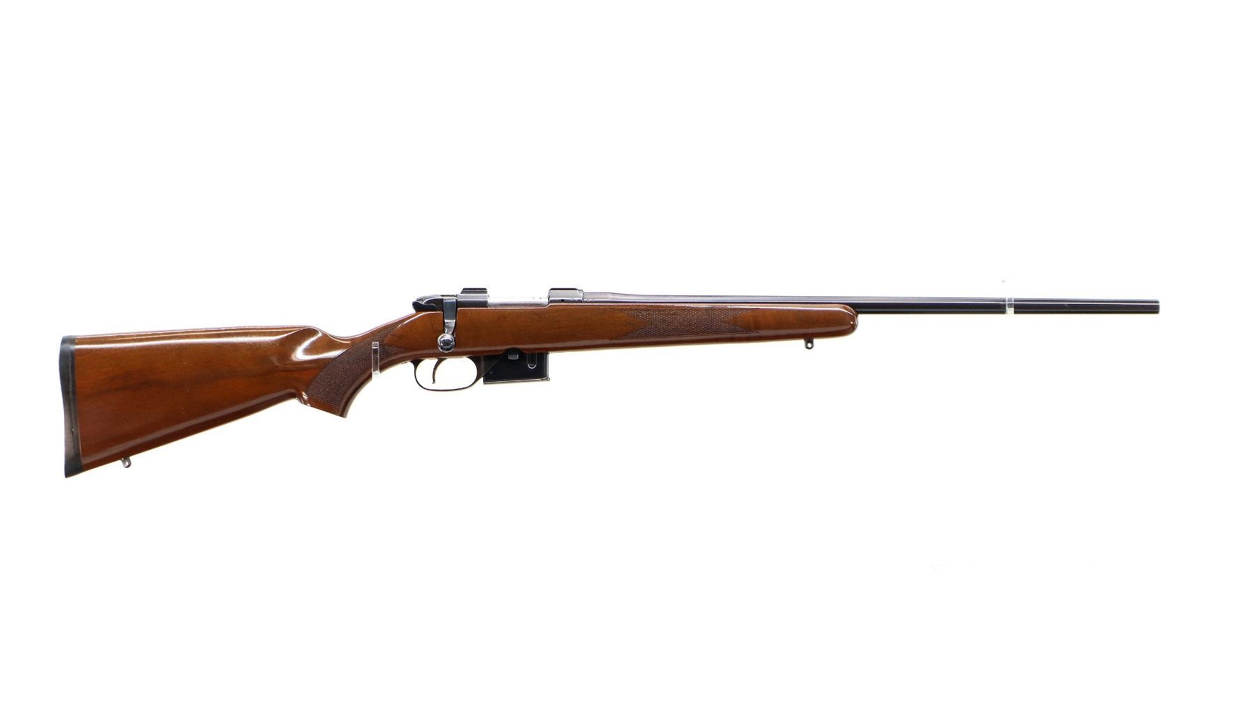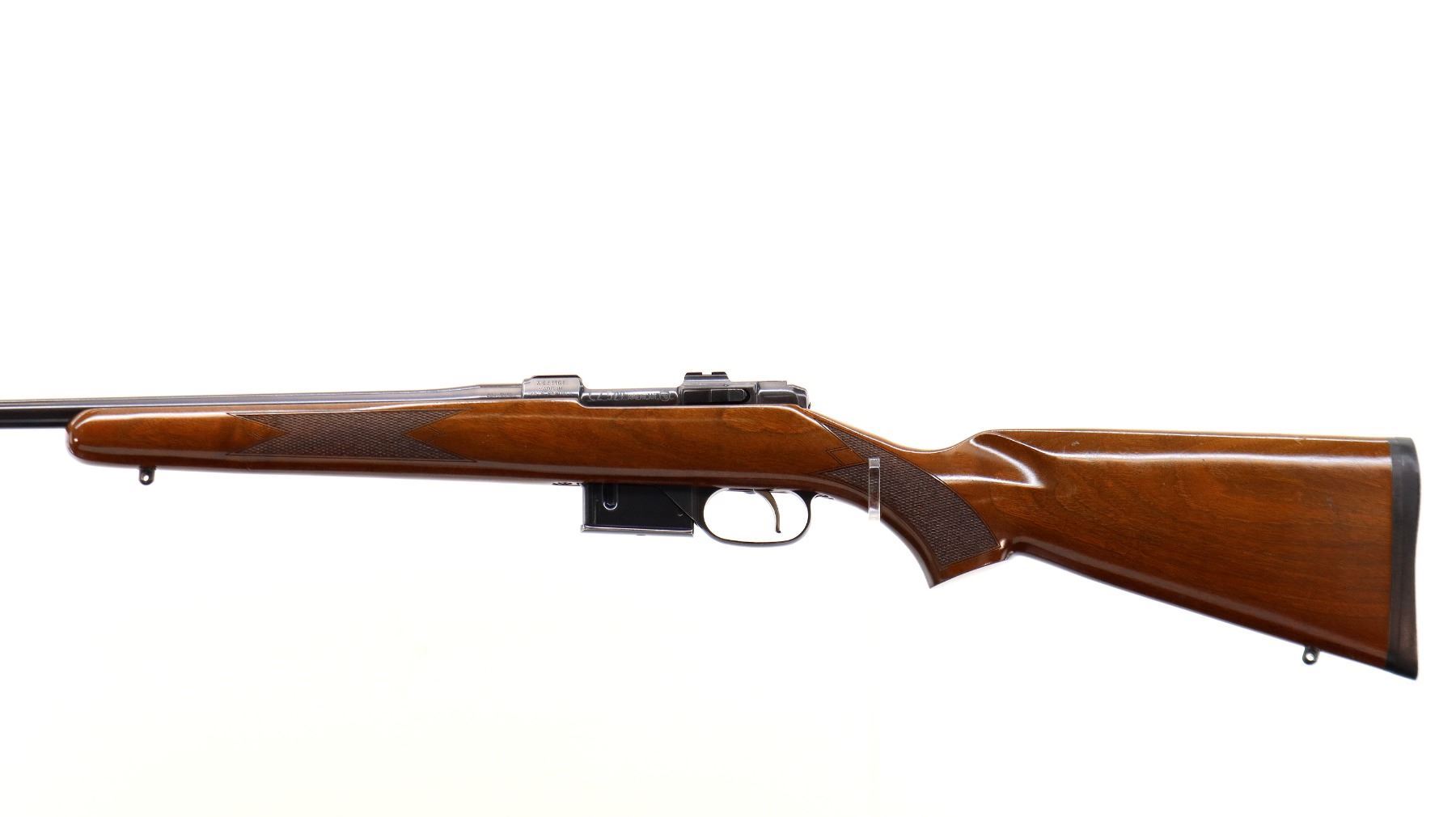 Main Description: No sights, blued finish, tapered round barrel, receiver has integral scope bases, smooth bolt knob. One piece wood stock, checkered forearm and pistol grip, black rubber recoil pad, swivel studs.