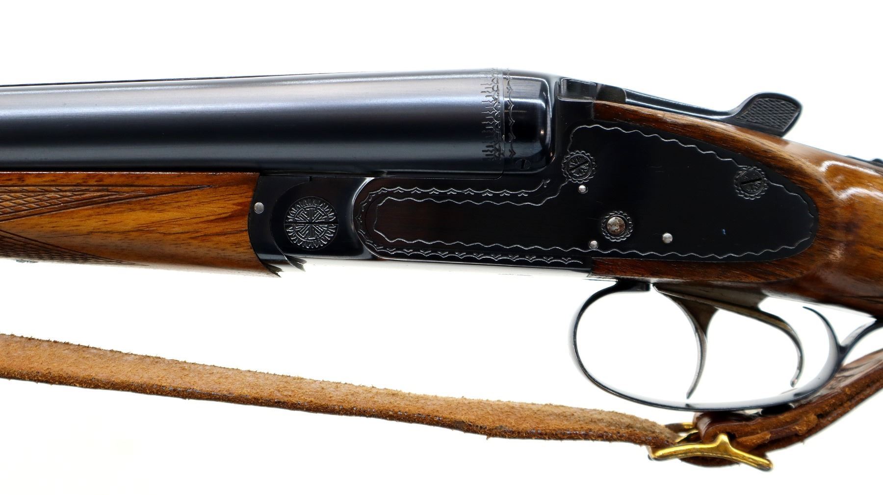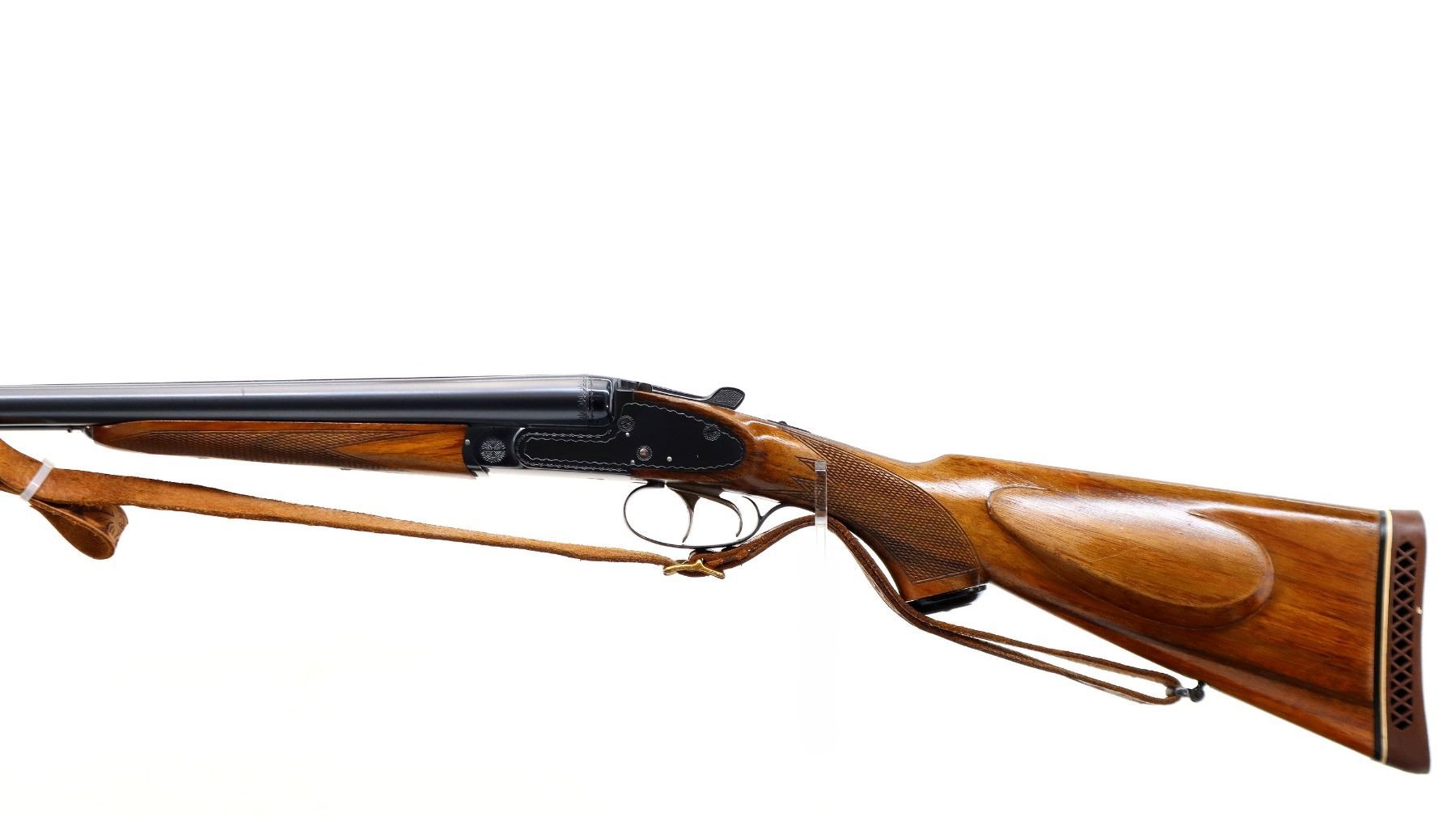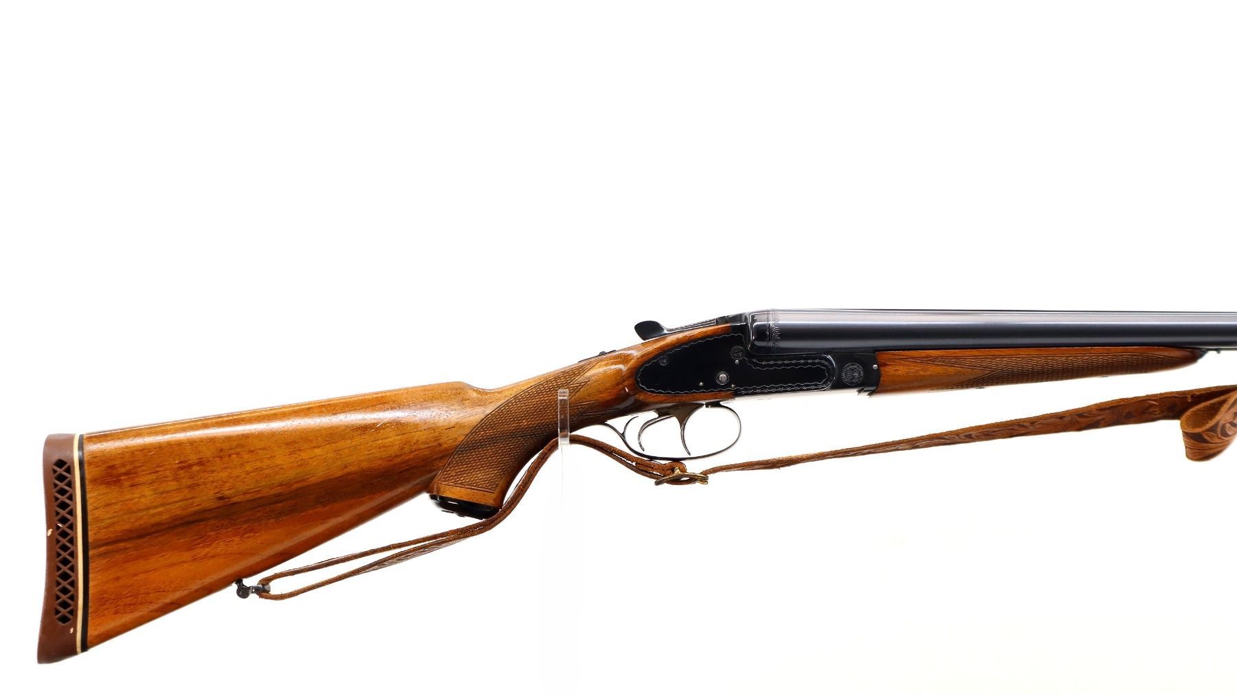 Main Description: Brass bead, metal has been polished and reblued, raised rib, engraved receiver and side locks, automatic safety, ejectors, double triggers. Two piece wood stocks, checkered forearm and pistol grip, European cheek rest, brown vented rubber recoil pad, 15.25" LOP, grip cap, sling swivels with brown leather sling.