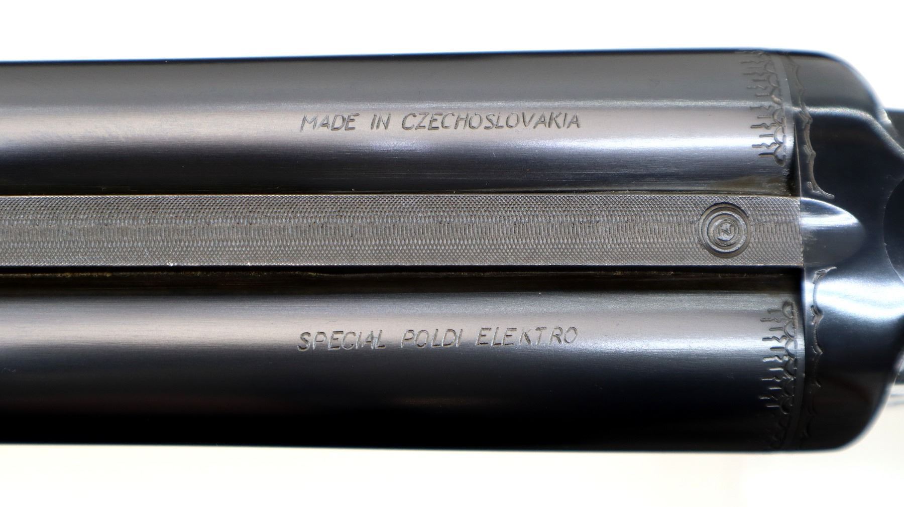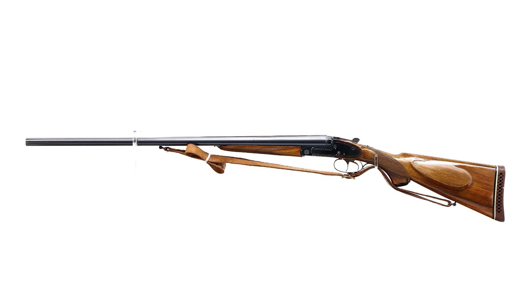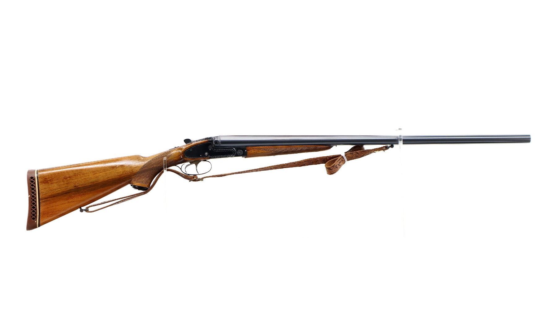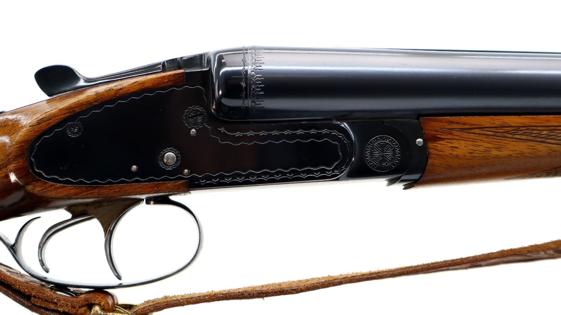 Main Description: Brass bead, metal has been polished and reblued, raised rib, engraved receiver and side locks, automatic safety, ejectors, double triggers. Two piece wood stocks, checkered forearm and pistol grip, European cheek rest, brown vented rubber recoil pad, 15.25" LOP, grip cap, sling swivels with brown leather sling.