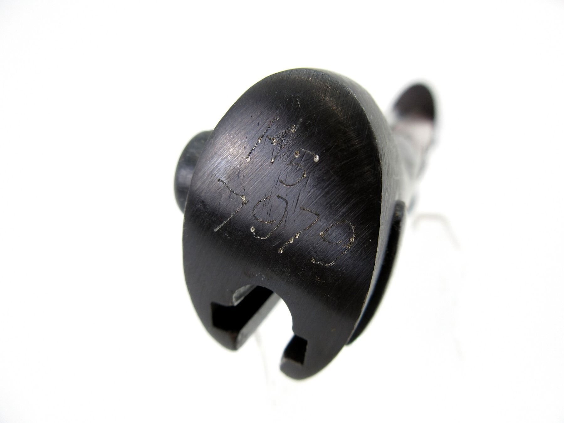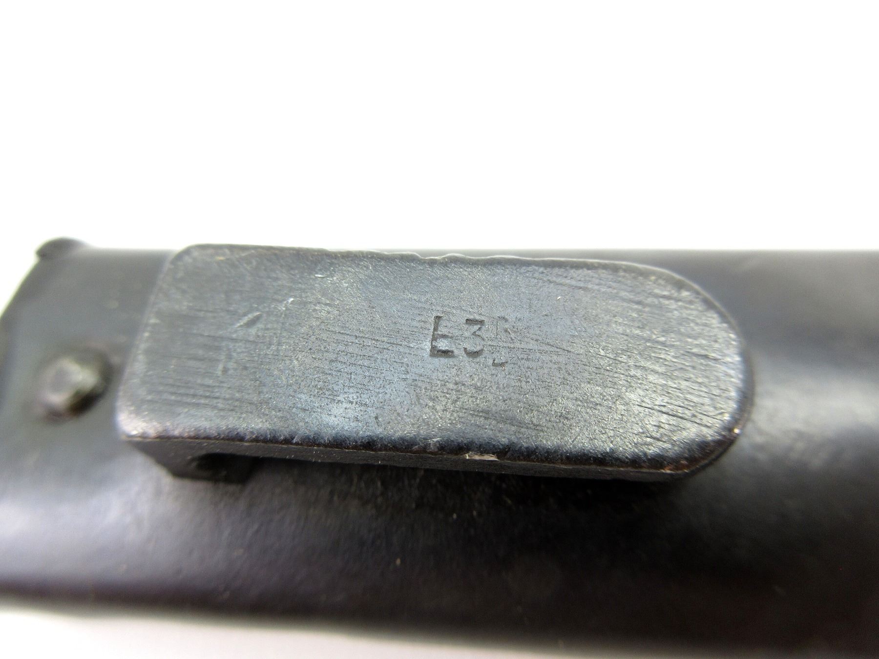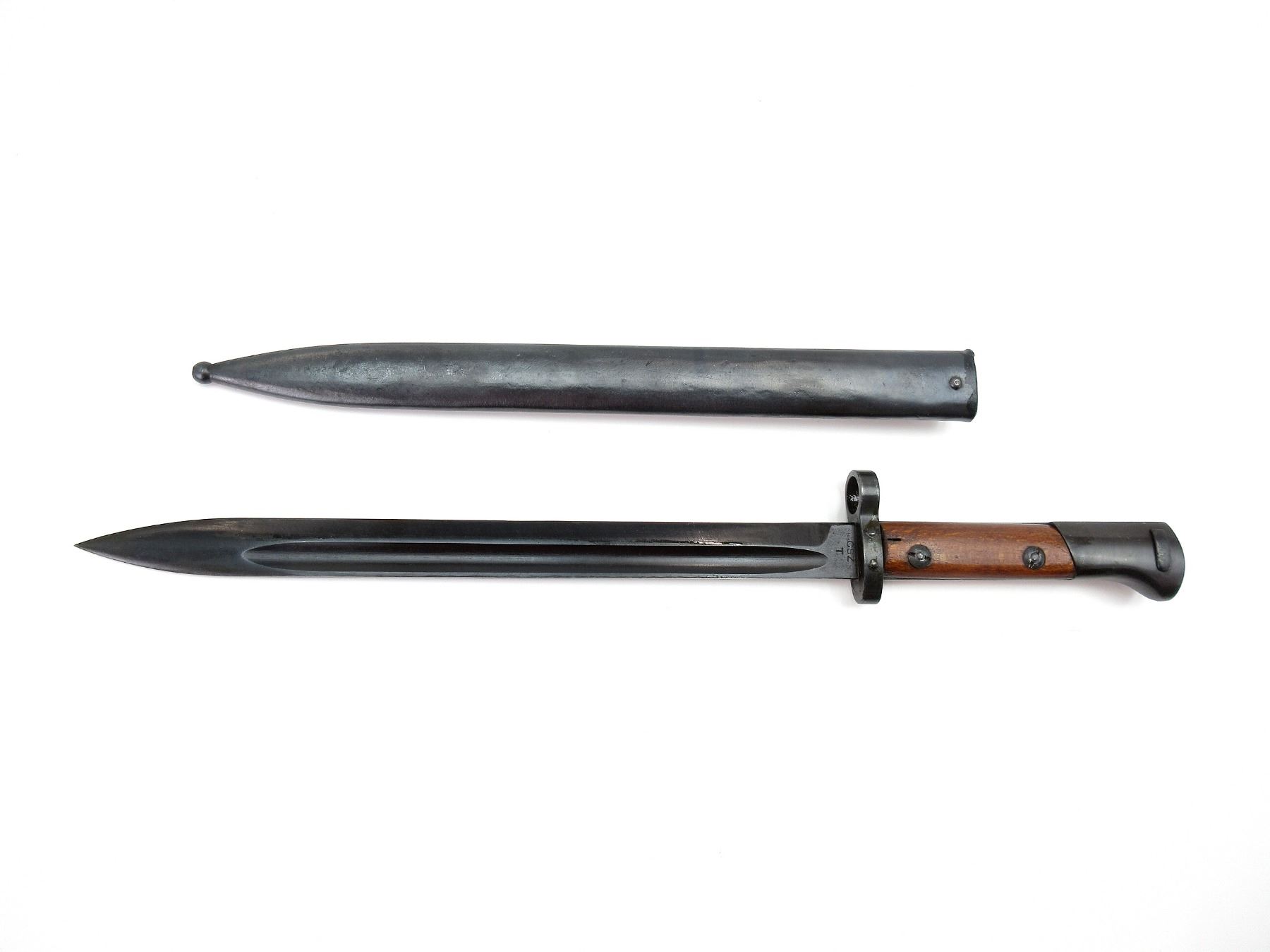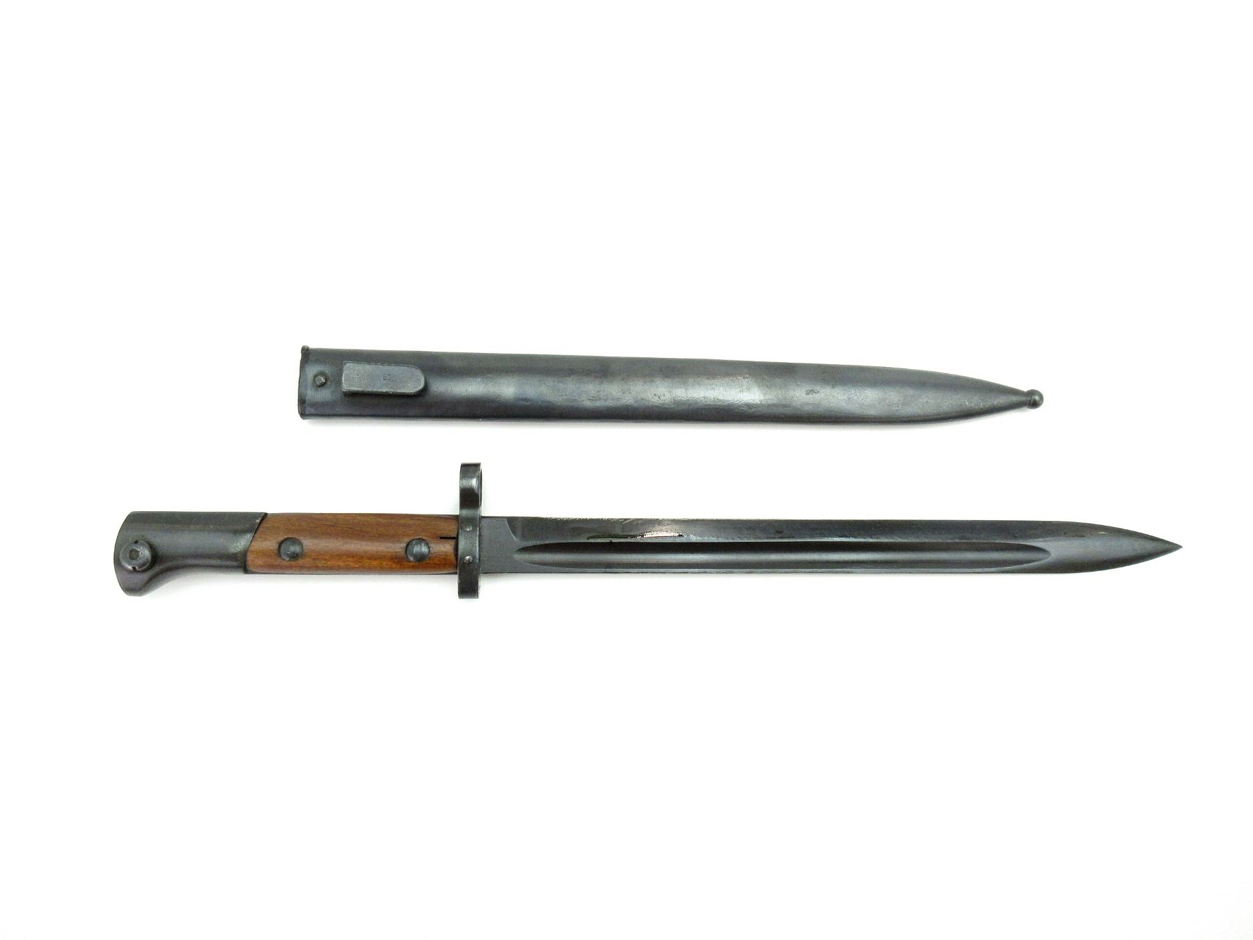 (1) FITS 1924 8MM RIFLES, RICASSO MARKED: "CSZ" OVER "T", 2-PIECE WOOD GRIPS, NO VISIBLE MARKINGS, METAL POMMEL ETCHED: "H5, 7979", METAL SCABBARD, FAINT PROOF MARK ON STUD, BLADE APPROX. 11.75" & OAL APPROX. 17". SEE PHOTOS.