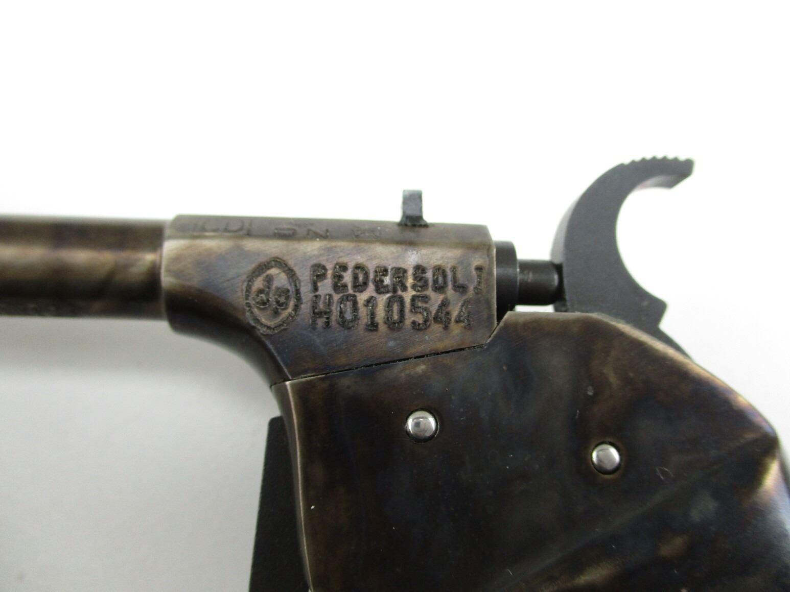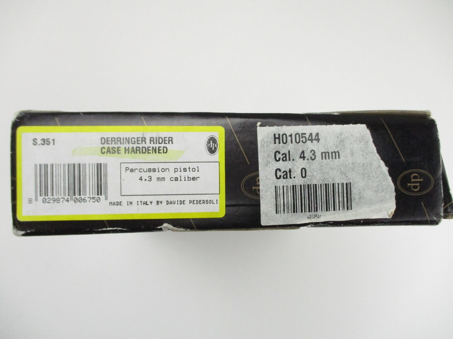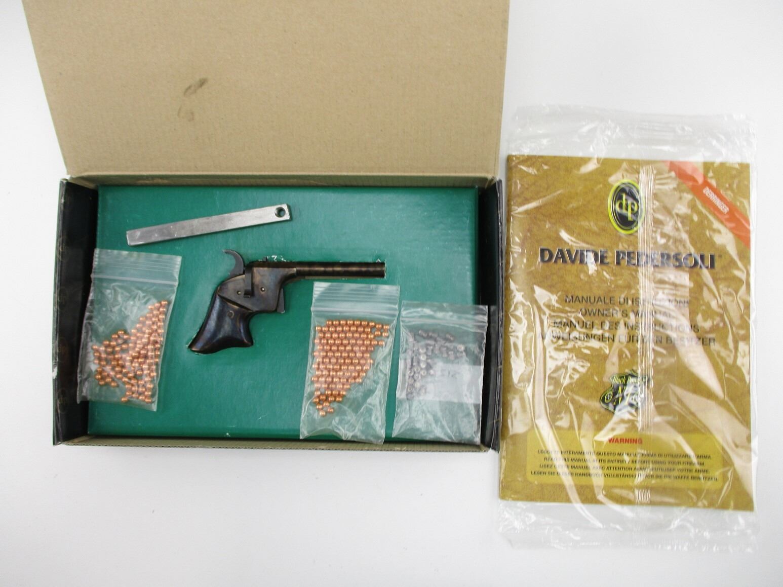 DAVIDE PEDERSOLI PELLET PISTOL, .177 CAL PELLET. (4.5MM) BBs. SINGLE SHOT PERCUSSION CAP OPERATION. MUST 18 YEARS OR OLDER TO PURCHASE PERCUSSION CAPS. HAMMER COCKS (WORKS). INCLUDES, BOX, INSTRUCTIONS.
