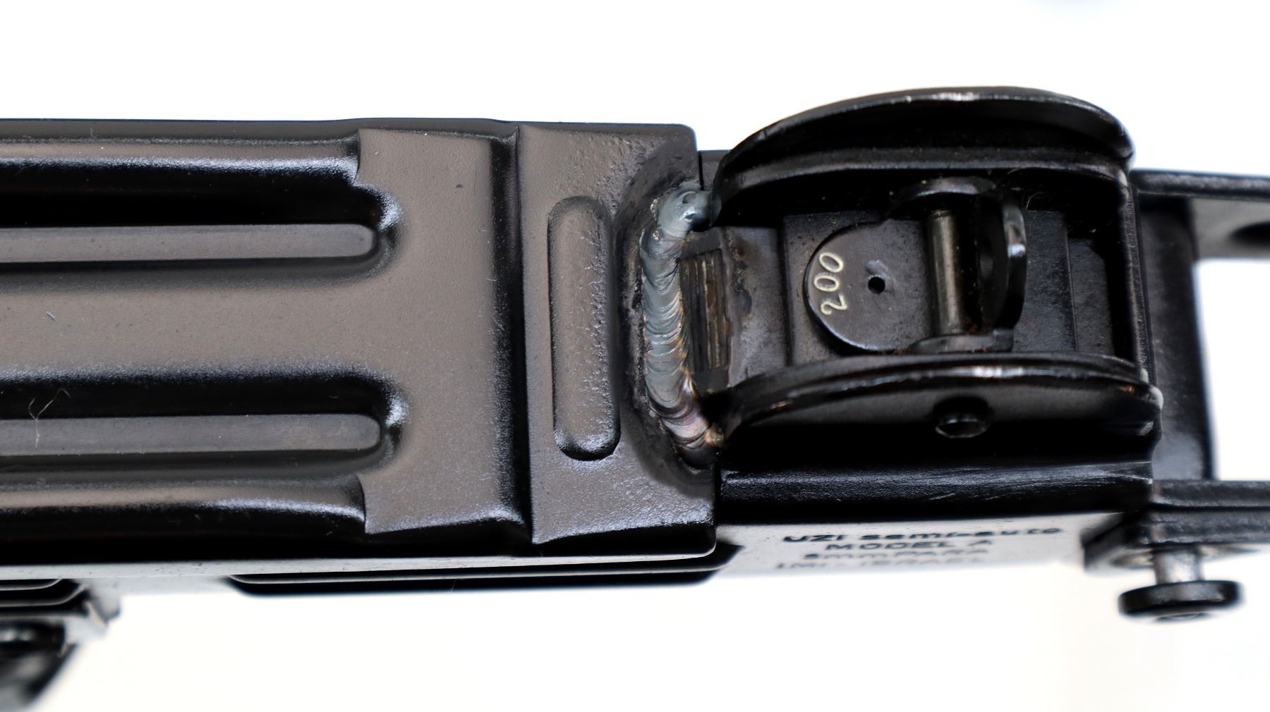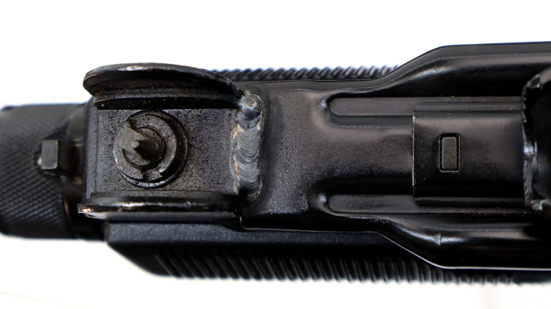 Main Description: This deactivation has four visible welds, action cocks, trigger mech is not removable cannot be disassembled magazine is removable. Post front sight with ears, adjustable L-flip rear peep sight with ears, black painted metal finish, checkered cocking handle. Four piece grooved black polymer stocks, pistol grip, folding steel butt stock, sling swivels.
