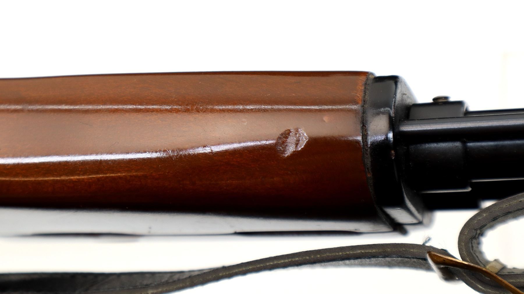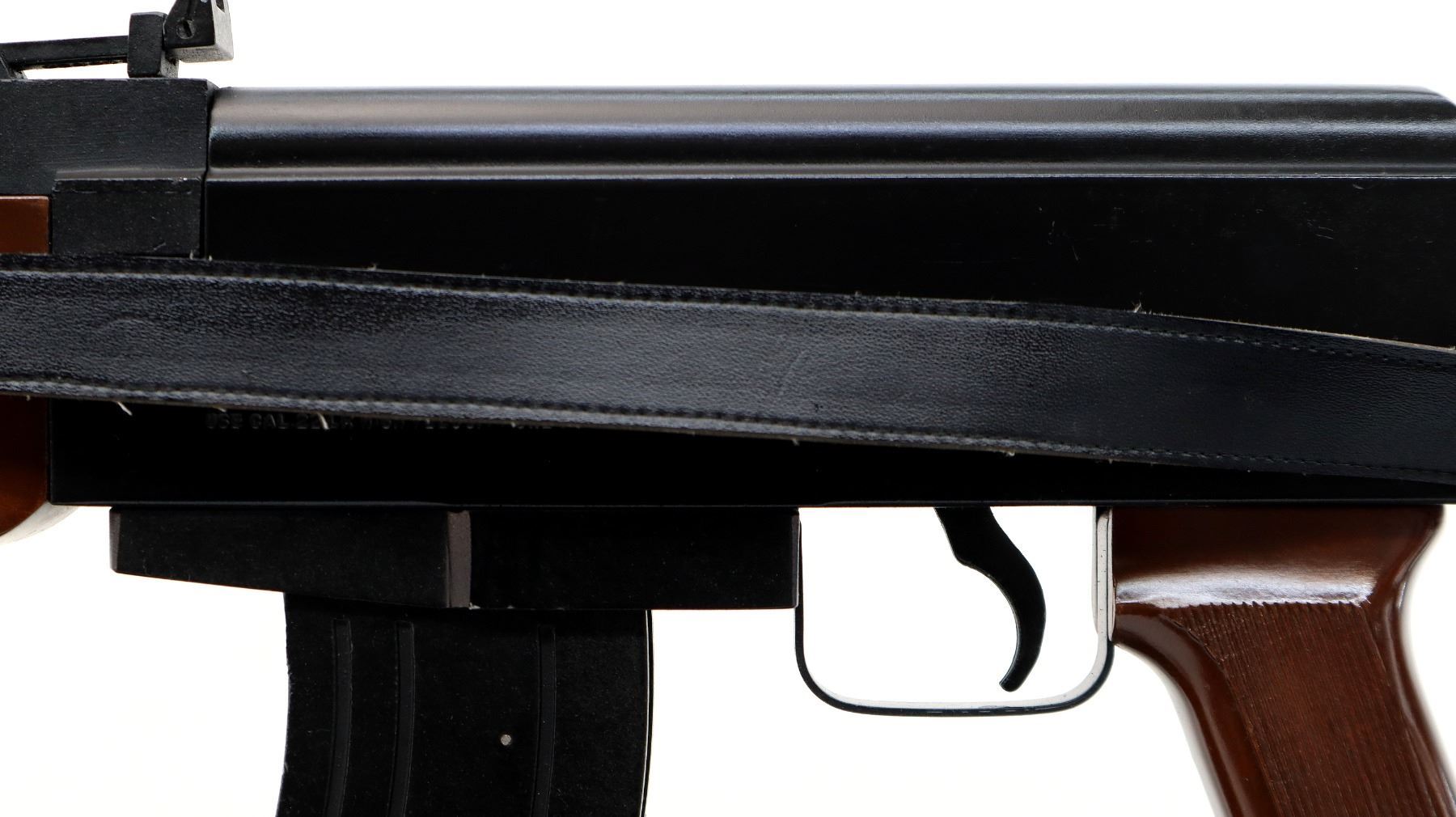 Main Description: This deactivation has no visible welds, action does not function, magazine is not removable cannot be disassembled. Post front sight with ears and ramp, adjustable rear peep sight, blued round barrel threaded at muzzle with cap, black alloy receiver. Four piece brown painted wood stock, ventilated handguards, grooved pistol grip and black polymer butt plate, sling swivels with black leather sling.