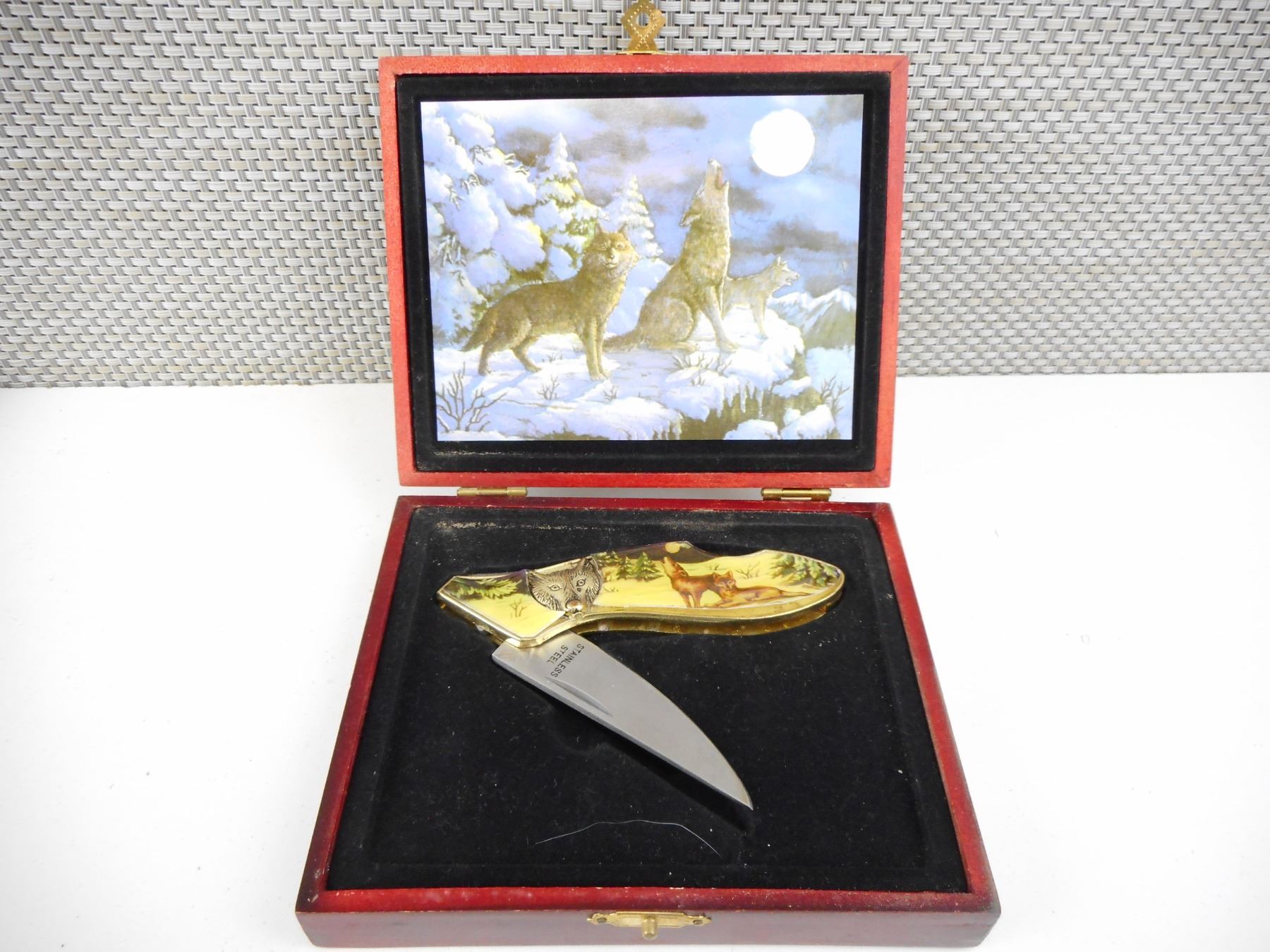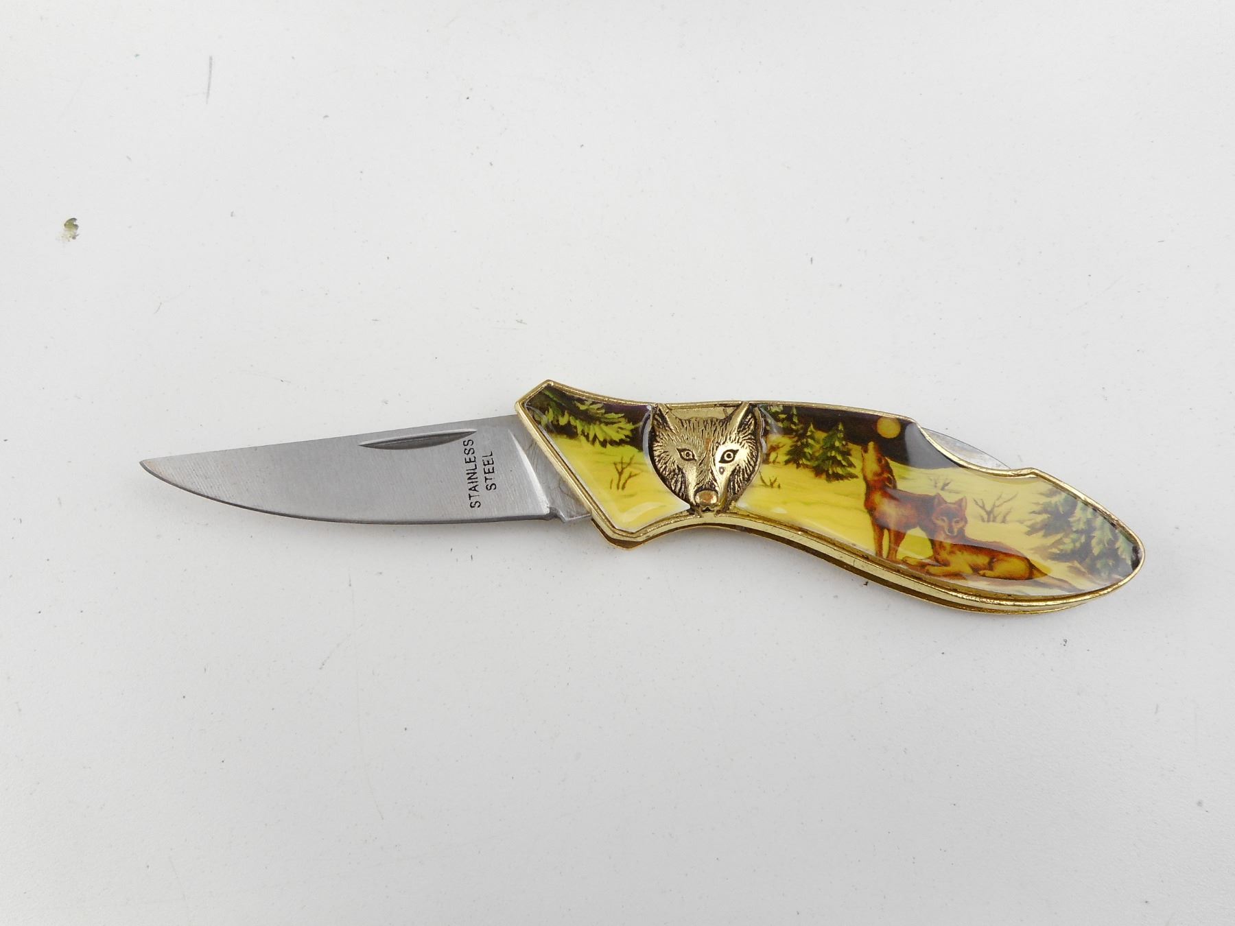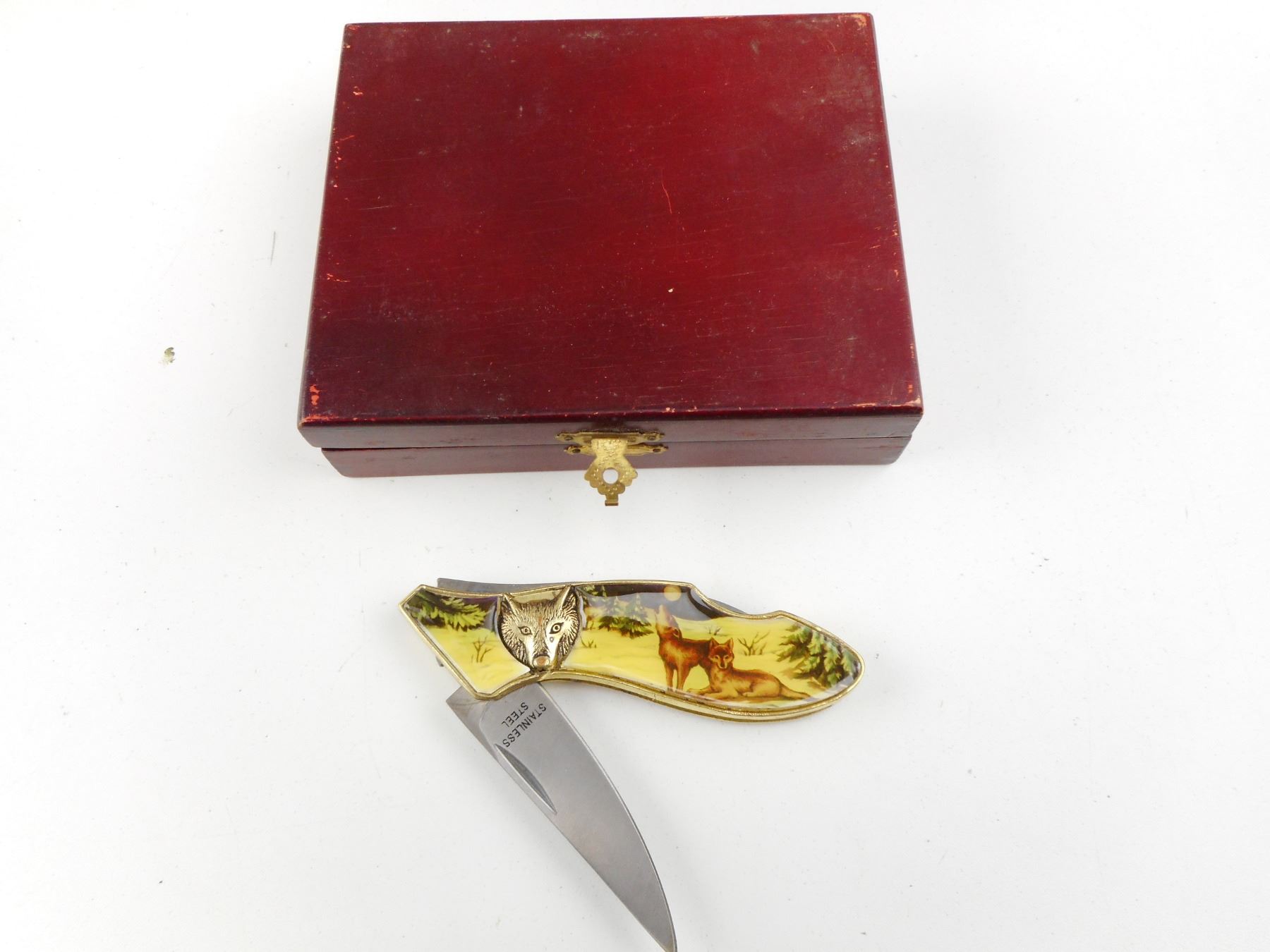 DECORATIVE WOLF FOLDING KNIFE IN CASE , BLADE MARKED STAINLESS STEEL. BLADE LENGTH APPROX. 2.5" TOTAL LENGTH APPROX. 6.5". CASE DIMENSIONS APPROX. 5.5" X 4.5".