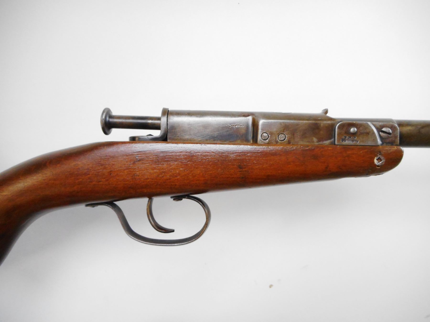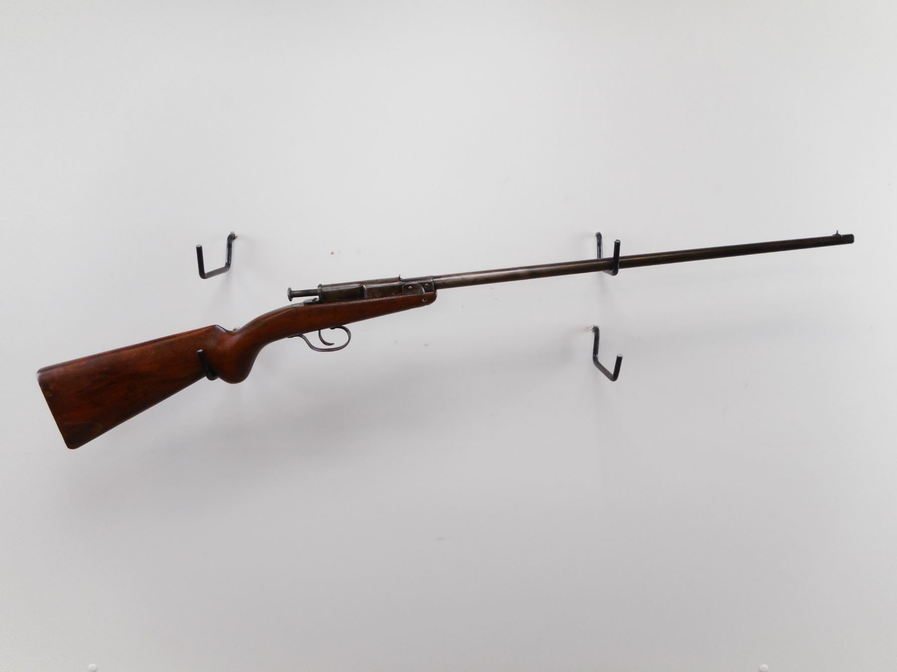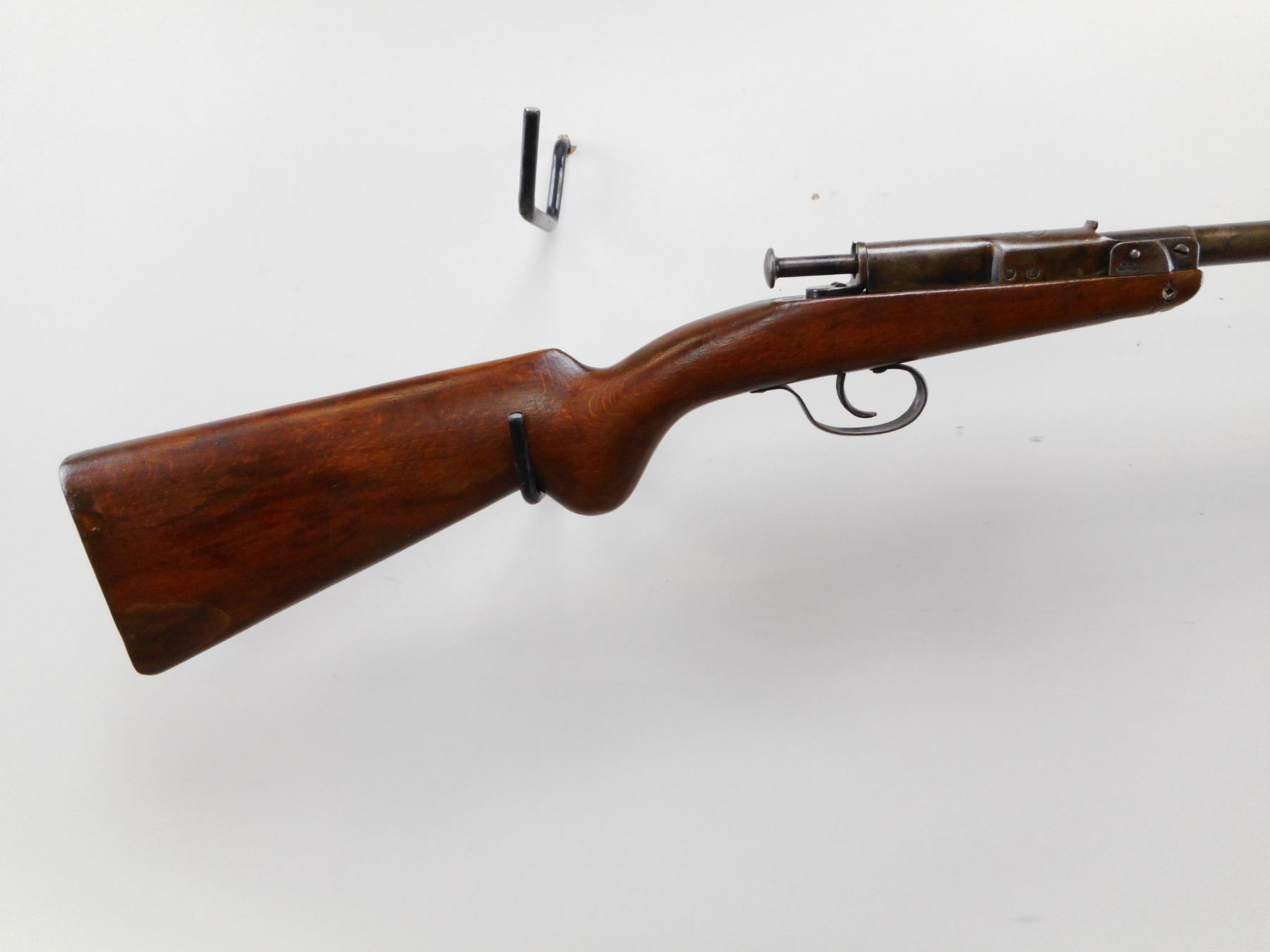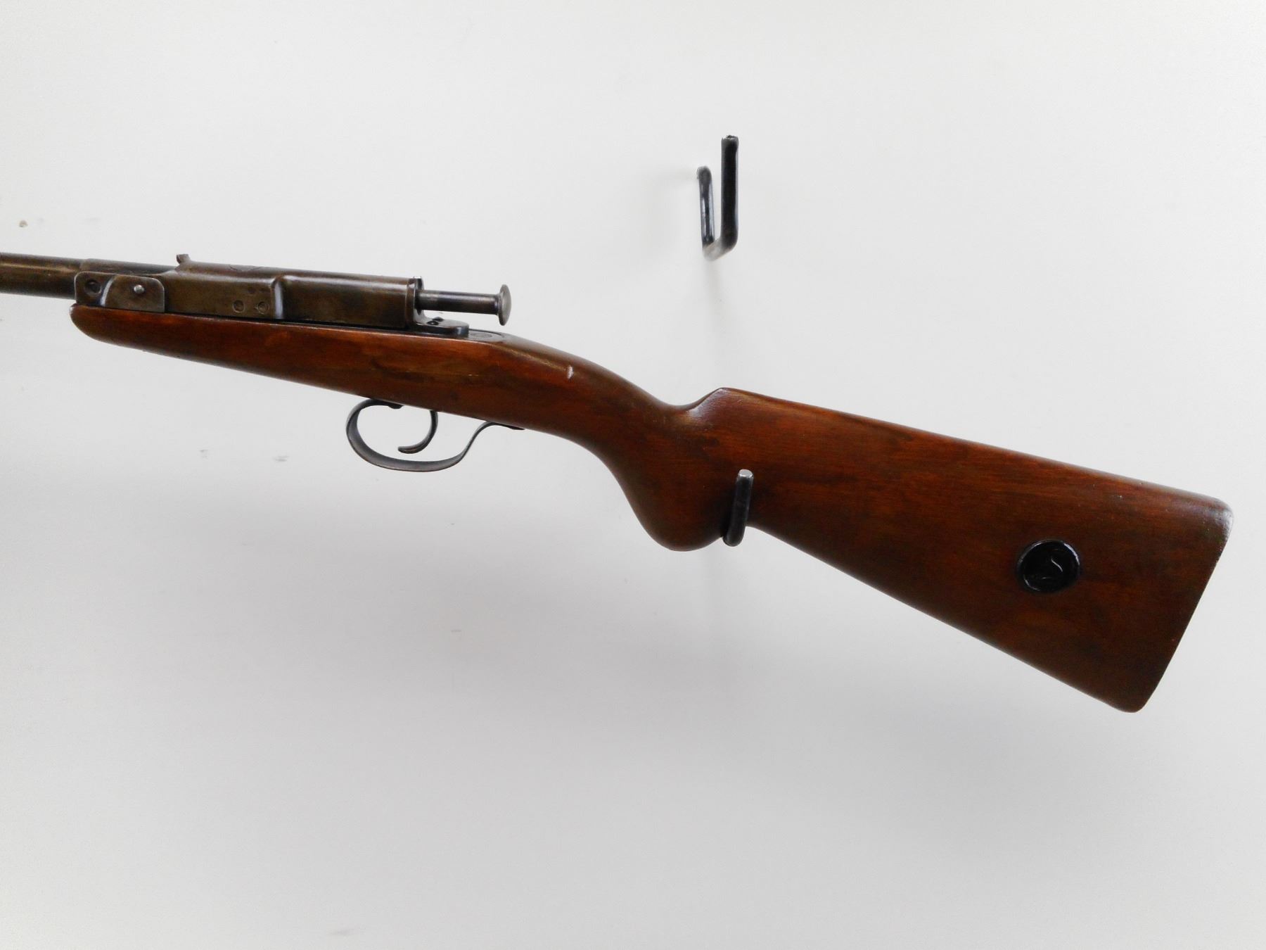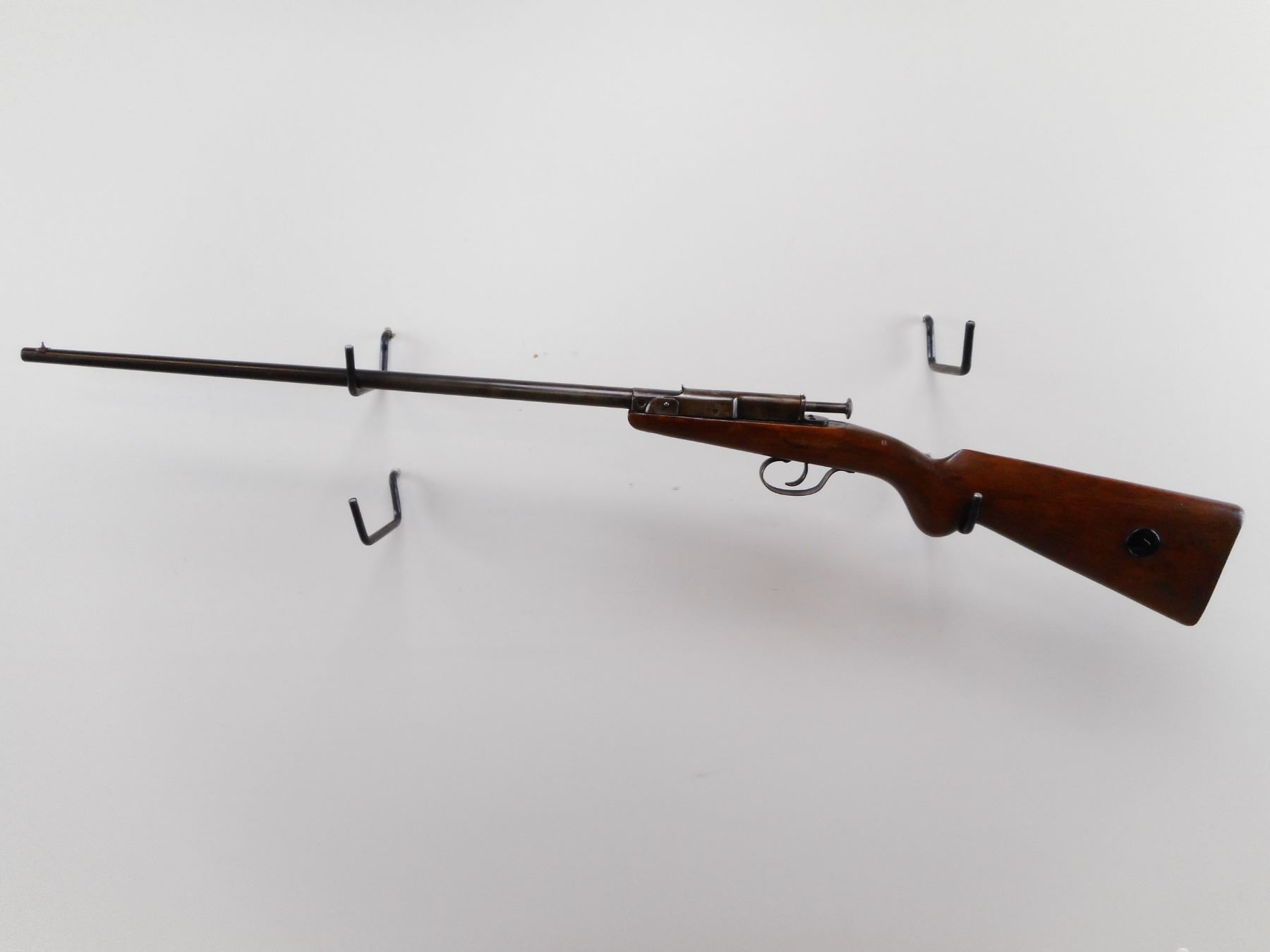 DEUTSCHE WERKE , MODEL: 1 , CALIBER: 22 LR , BORE IS POOR, BULGED AND HAS LIGHT PITTING. BLADE FRONT SIGHT. U NOTCH REAR SIGHT. ONE PIECE WOOD STOCK. MEDALION ON THE LEFT SIDE. STOCK IS CRACKED AND REPAIRED. METAL FINISH IS FADED, WORN AND HAS LIGHT RUST SPOTS. STOCK SHOWS NUMEROUS HANDLING MARKS. , SERIAL # N/A , ACTION: HINGE , BARREL LENGTH: 22 1/2" , CONDITION: 3/10 , CLASS: CANADIAN NON RESTRICTED CLASS