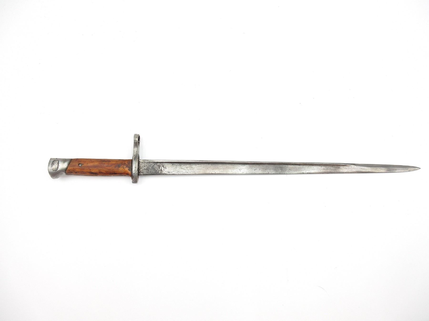 (1) FITS 6.5MM M1895 MANNLICHER RIFLES, BLADE / RICASSO / CROSS-PIECE HAS NO VISIBLE MARKINGS, 2-PIECE WOOD GRIP, METAL POMMEL, POMMEL IS NOT STANDARD SHAPE / STYLE, NO VISIBLE MARKINGS, NO SCABBARD, BLADE APPROX. 15.75" & OAL APPROX. 20 1/8". SEE PHOTOS.