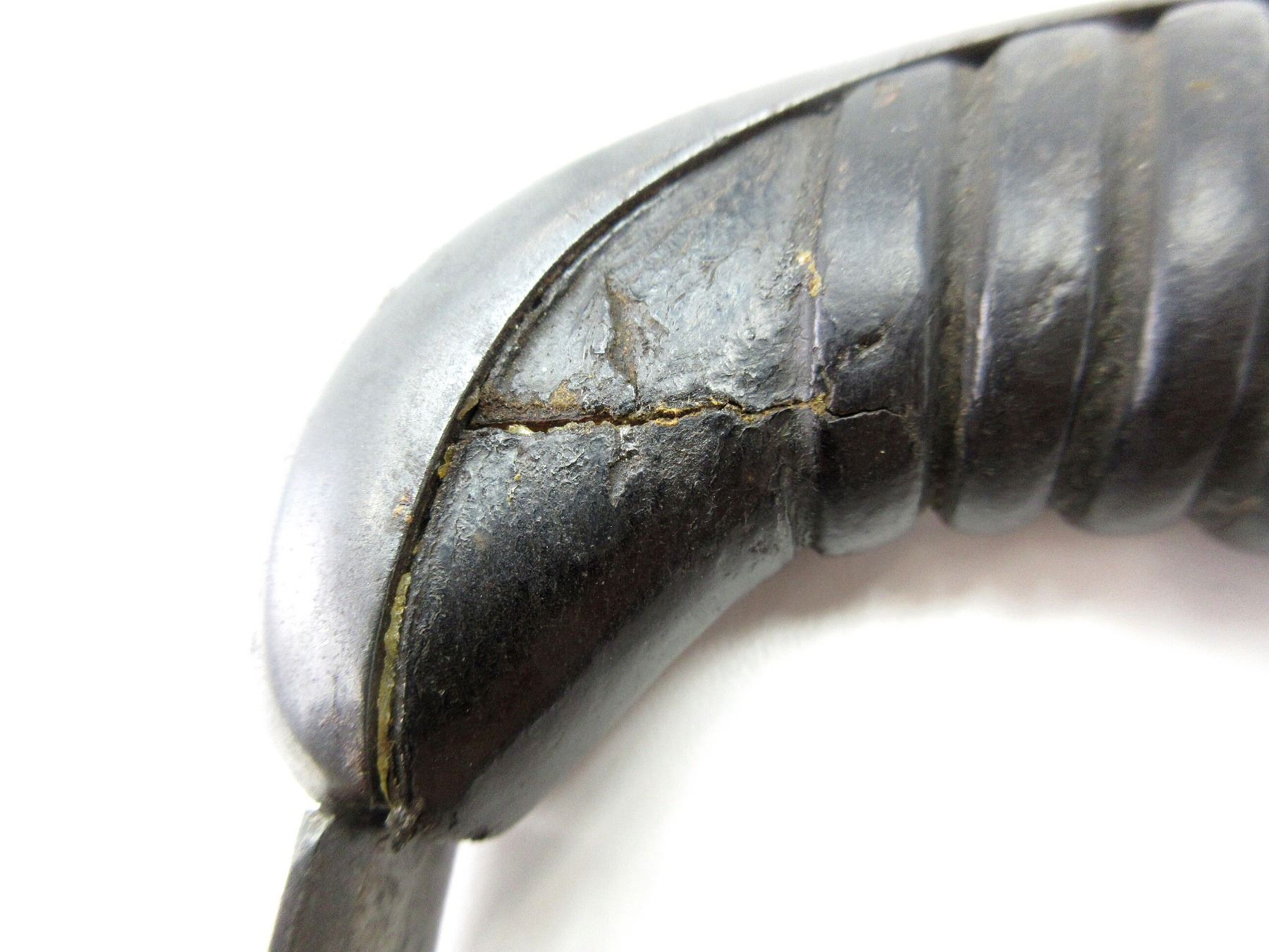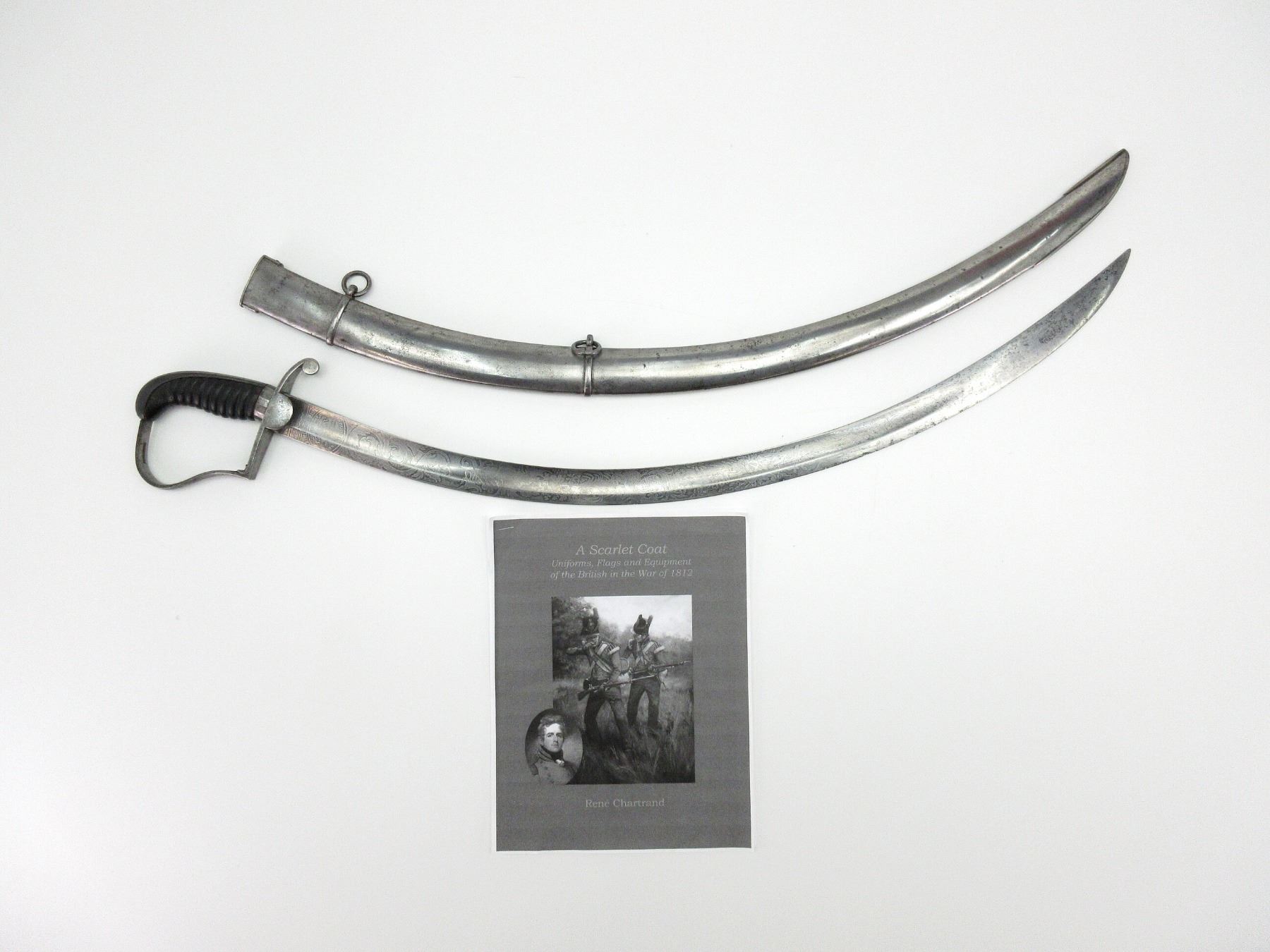 (1) CURVED SINGLE-EDGED BLADE COMES WITH PHOTOCOPY OF PAGE 165 FROM RENE CHARTRAND'S BOOK "A SCARLET COAT", BLADE ACID ETCHED: CROWN OVER "GR" CYPHER, "103, REGIMENT" & VARIOUS OTHER DECORATIVE ETCHINGS, OTHER-SIDE ACID ETCHED: CROWN OVER COAT OF ARMS (1801-1816), "OSBORN & GUNBY, SWORD CUTLERS, TO HIS, MAJESTY., WARRANTED." & VARIOUS OTHER DECORATIVE ETCHINGS, D-SHAPED HILT, SLIGHTLY LOOSE, NO VISIBLE MARKINGS, WOODEN GROOVED GRIP, METAL POMMEL & BACK OF GRIP, NO VISIBLE MARKINGS, STEEL SCABBARD WITH TWO HANGERS, NO VISIBLE MARKINGS, BLADE APPROX. 29" & OAL APPROX. 33.5". SEE PHOTOS.