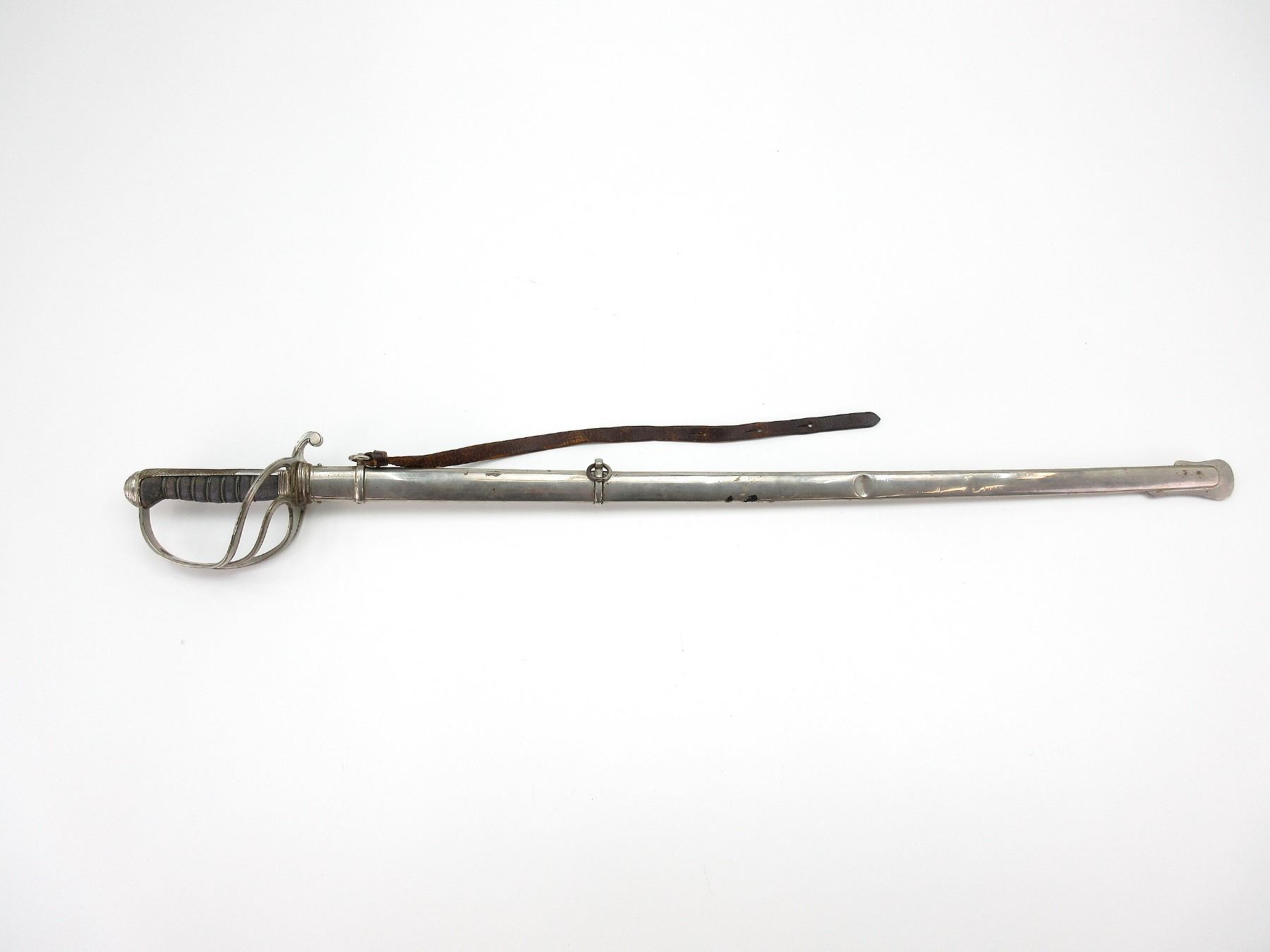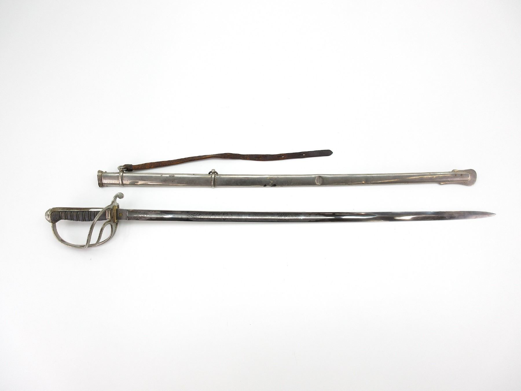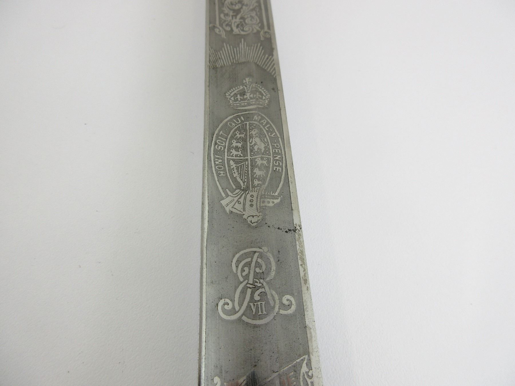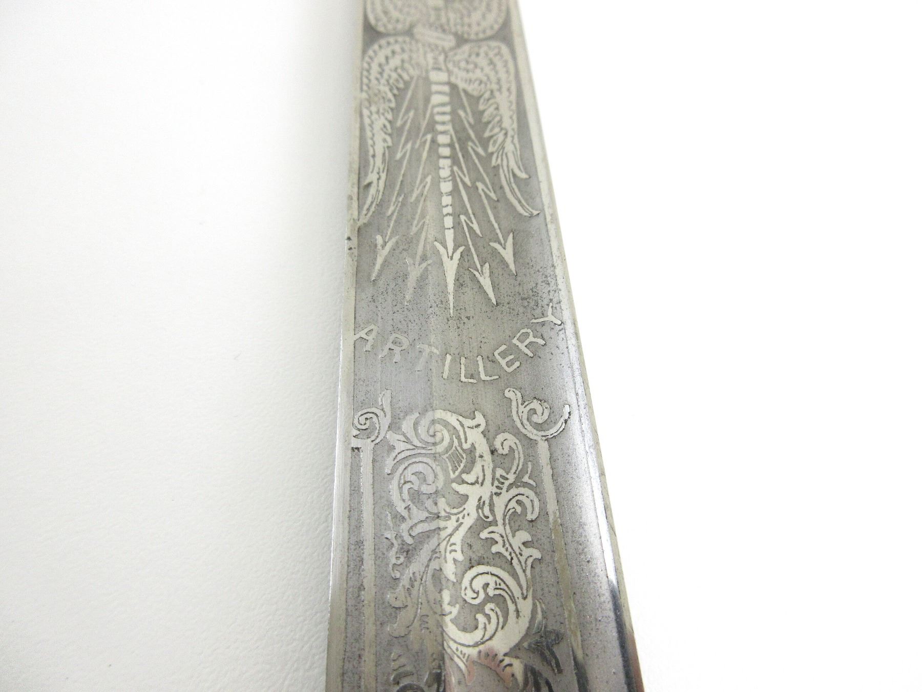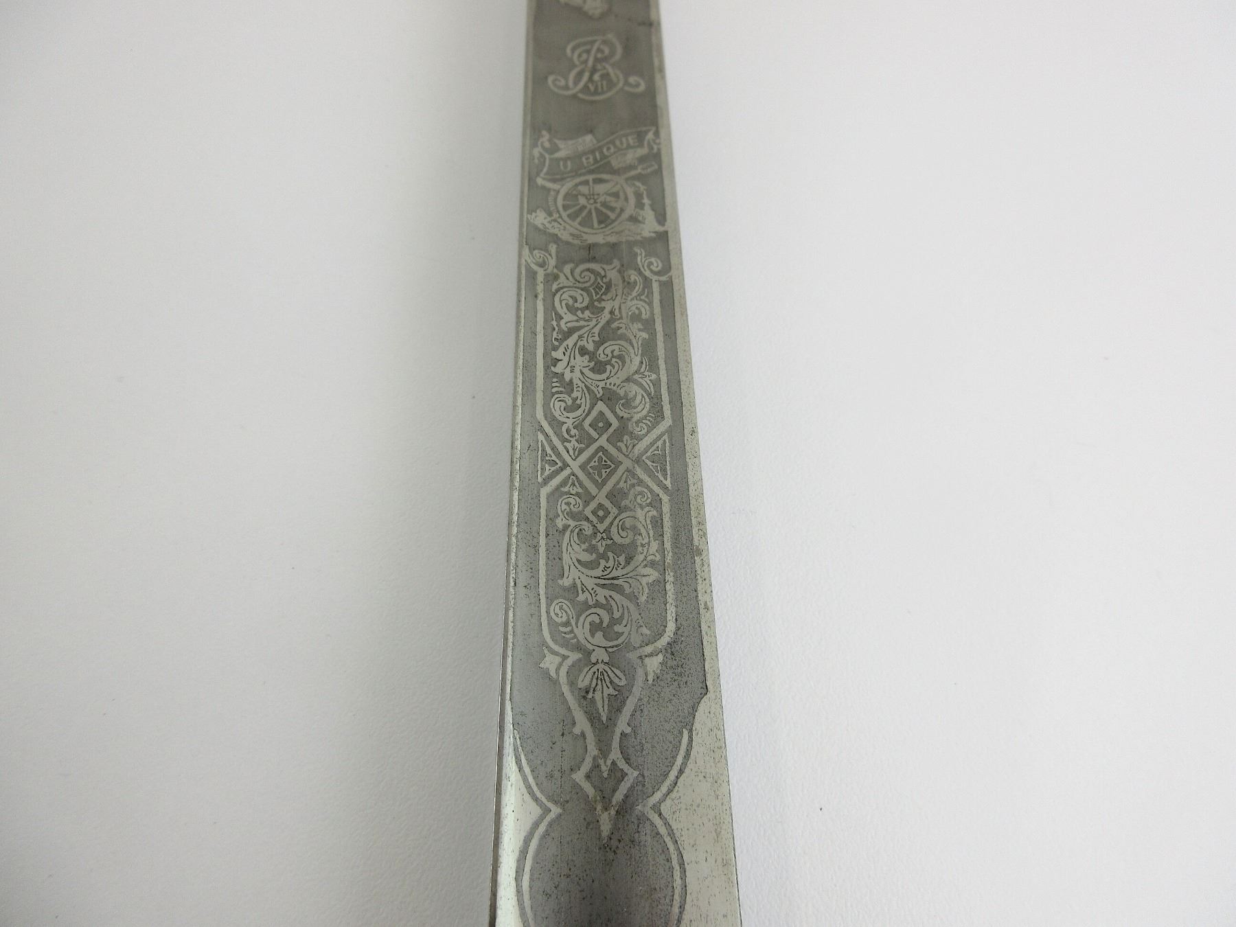 (1) STRAIGHT SINGLE-EDGED FULLERED BLADE SWORD, BLADE ACID ETCHED: KING'S CROWN OVER CREST OVER ER VII CYPHER OVER "UBIQUE", STAR WITH BRASS CIRCLE MARKED: "PROVED" & VARIOUS DECORATIVE ACID ETCHINGS, OTHER-SIDE ACID ETCHED: "ROYAL ARTILLERY" WITH VARIOUS DECORATIVE ACID ETCHINGS, BLADE SPINE MARKED: "16125", FELT WASHER / BUFFER PAD, DECORATIVE METAL CROSS-PIECE / HILT, LEATHER & WIRE WRAPPED GRIP, CHECKERED METAL PIECE ON BACK OF GRIP, METAL POMMEL, NO VISIBLE MARKINGS, STEEL SCABBARD WITH TWO HANGERS & LEATHER TAB, NO VISIBLE MARKINGS, BLADE APPROX. 34.25" & OAL APPROX. 40.5". SEE PHOTOS.