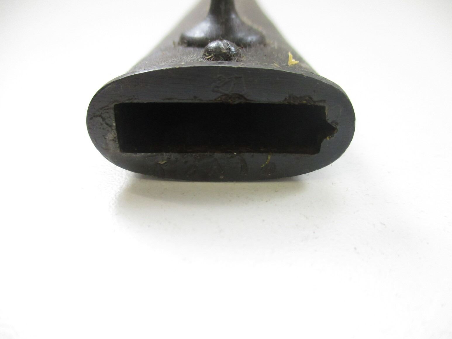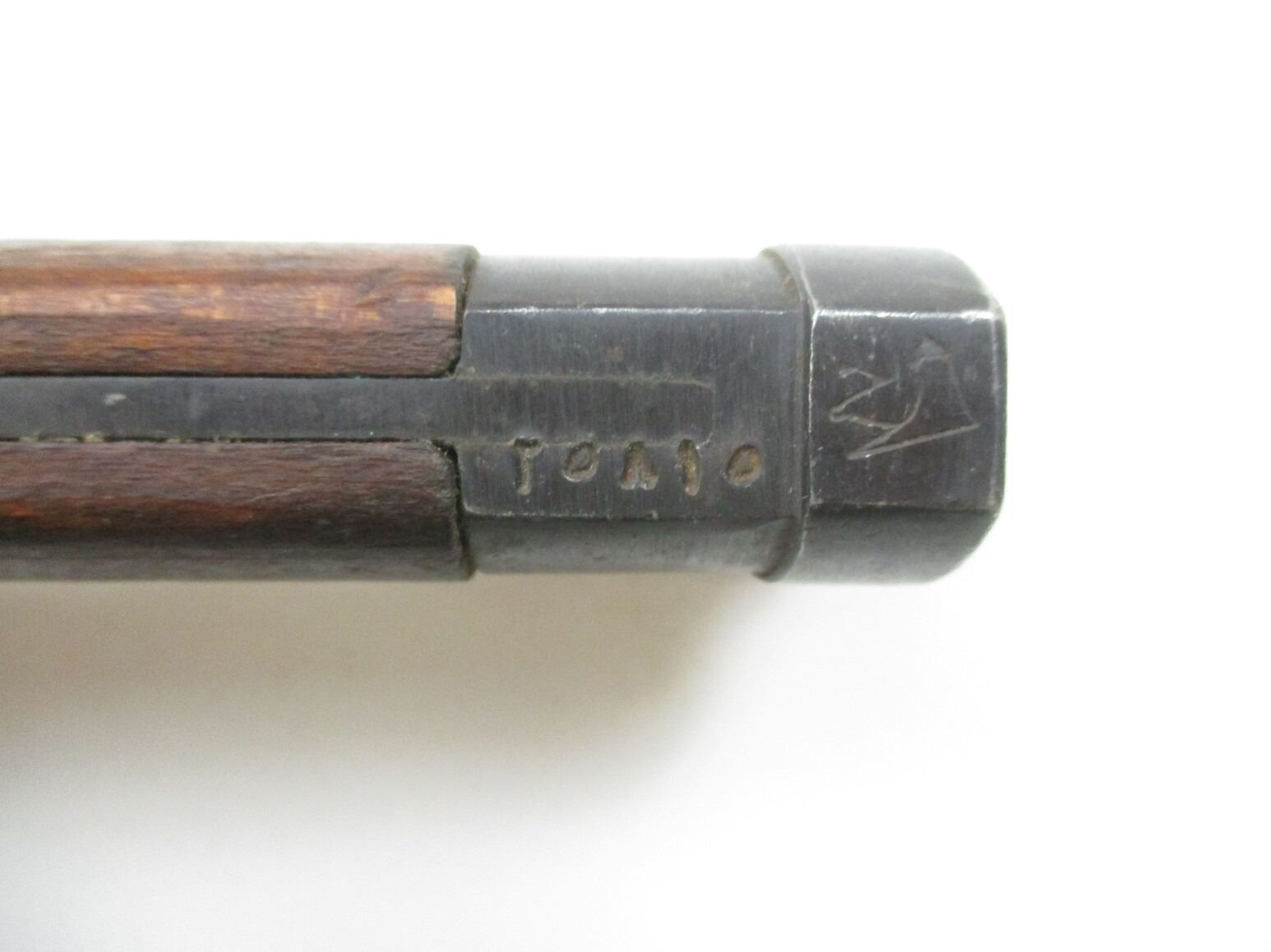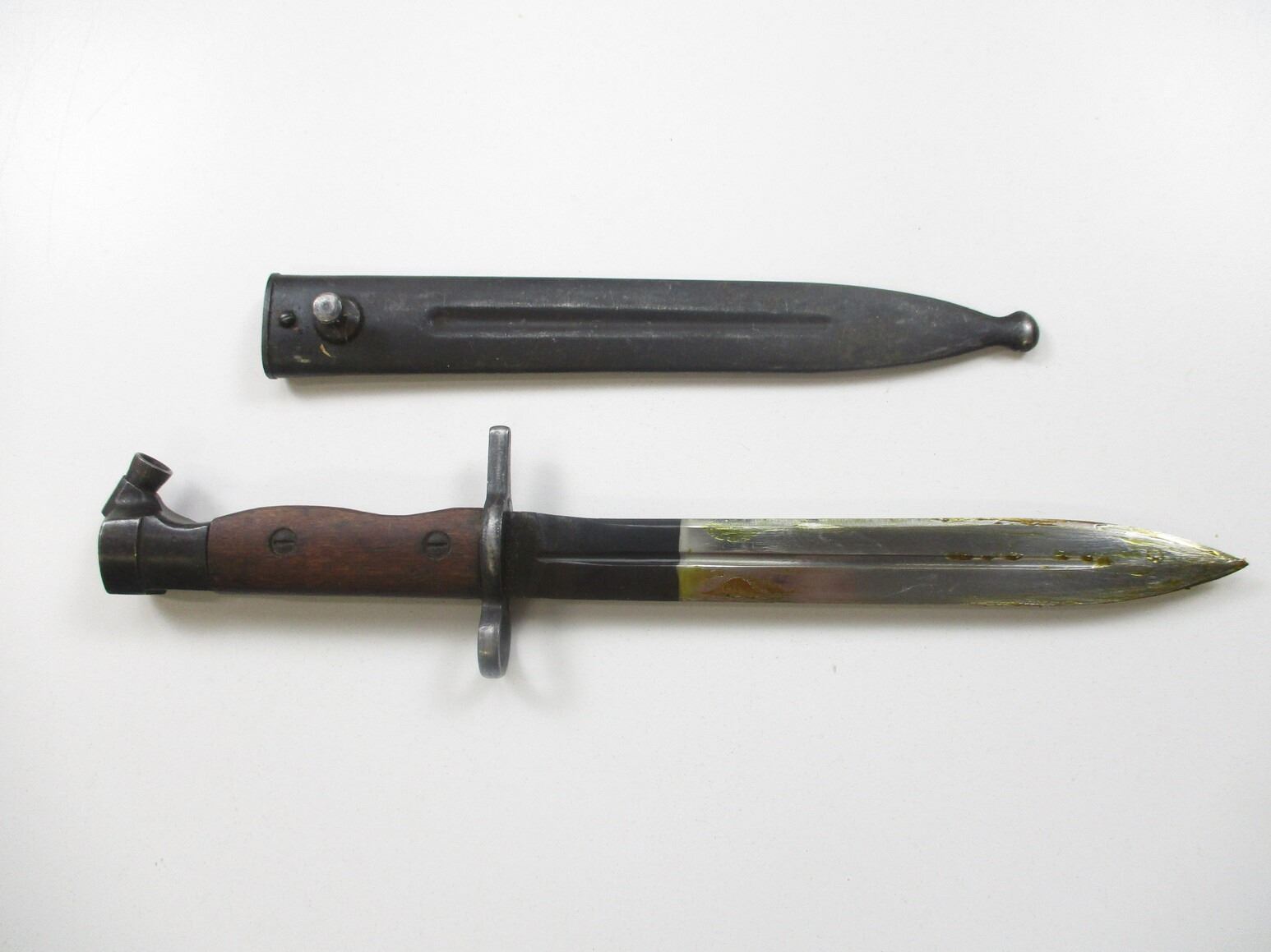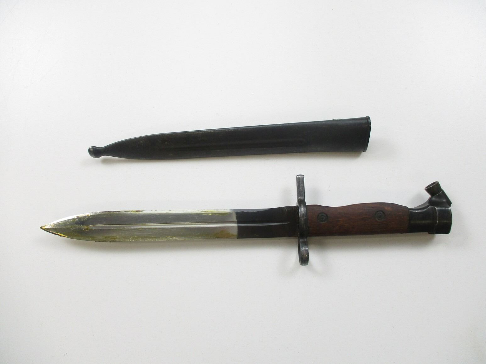 EGYPTIAN HAKIM KNIFE-BAYONET, (1) FITS 8MM HAKIM SELF-LOADING RIFLES, NO VISIBLE MARKINGS, 2-PIECE WOOD GRIP, METAL POMMEL WITH EGYPTIAN MARKINGS, BLACK METAL SCABBARD WITH EGYPTIAN MARKINGS, BLADE APPROX. 8 3/8" & OAL APPROX. 12 7/8".
