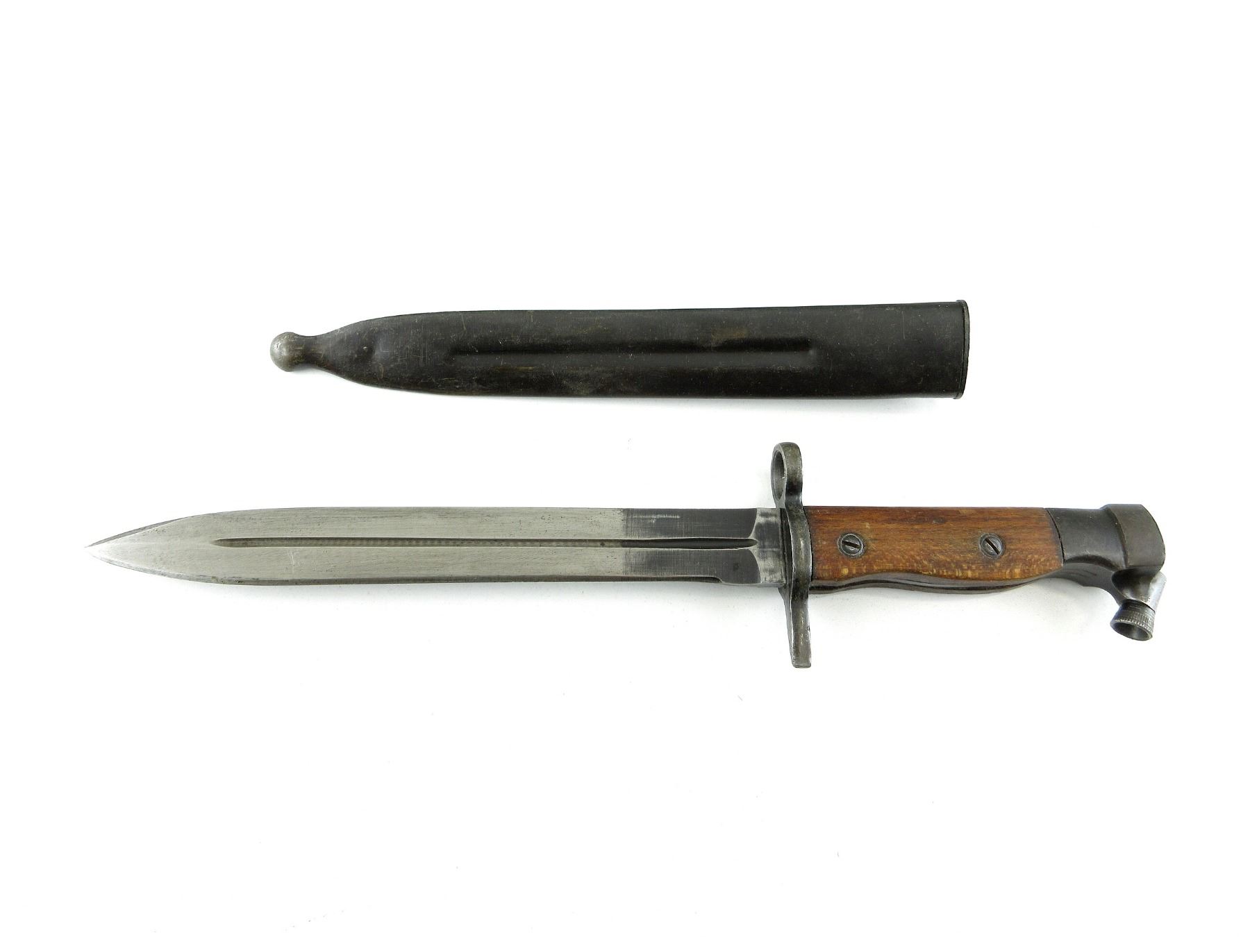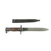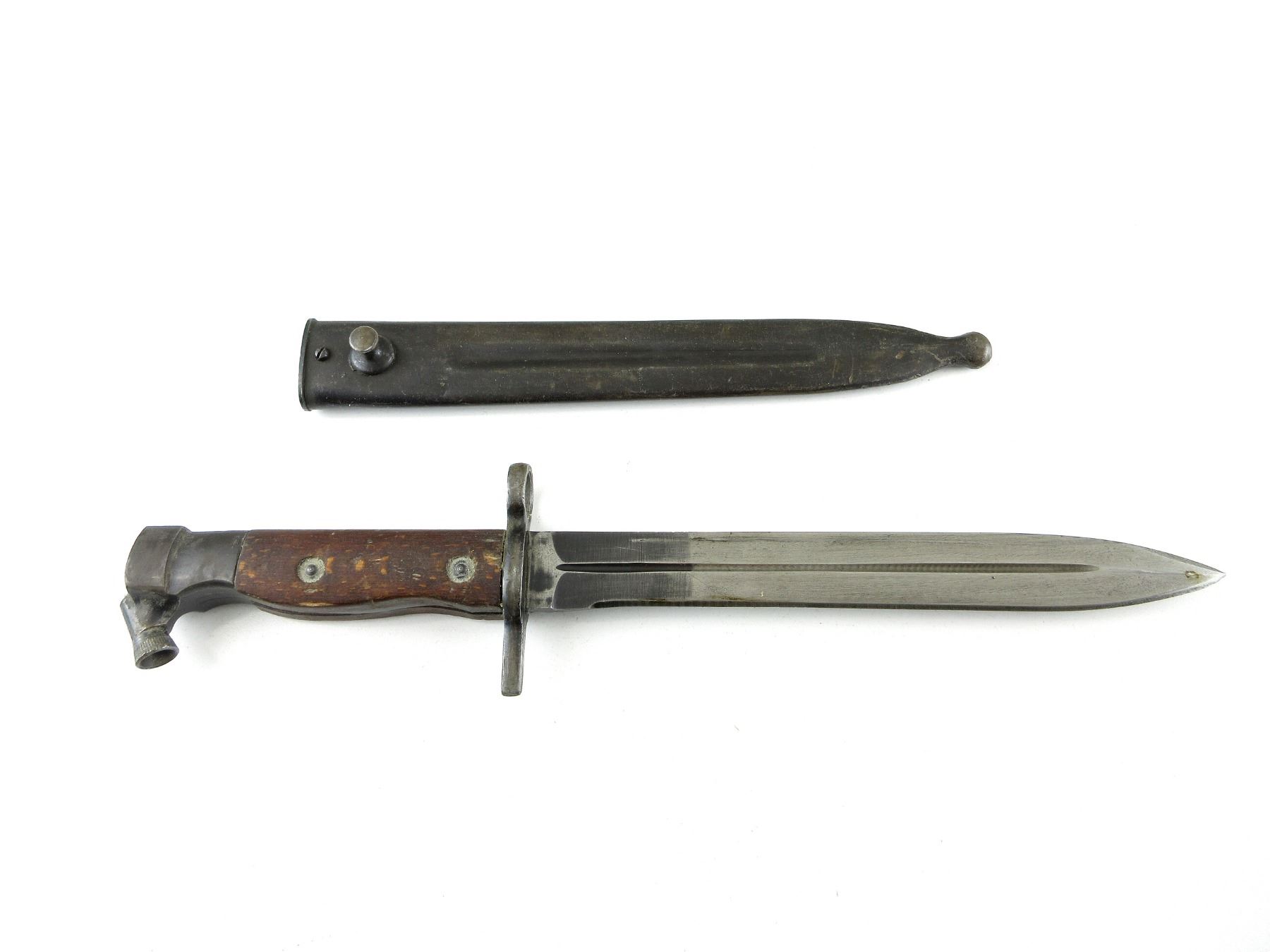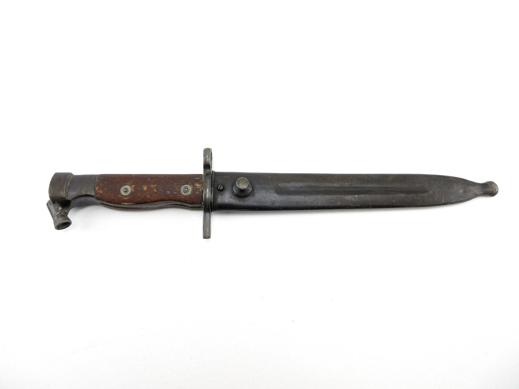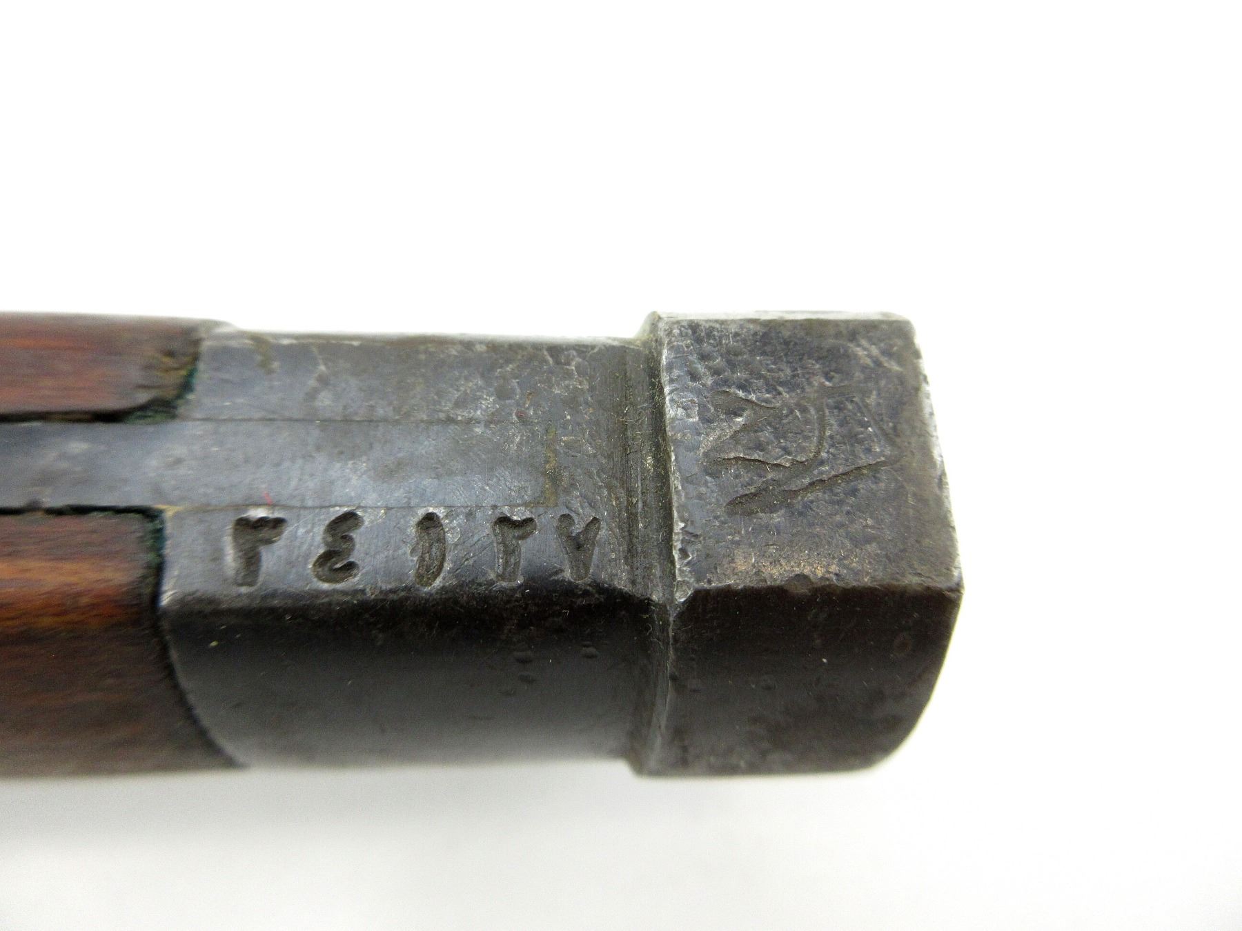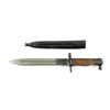 (1) FITS 8MM HAKIM SELF-LOADING RIFLES, BLUED STEEL BLADE, NO VISIBLE MARKINGS, 2-PIECE WOOD GRIP, METAL POMMEL WITH ARABIC MARKINGS & PROOF MARK, BLACK METAL SCABBARD, THROAT MARKED WITH ARABIC MARKINGS & PROOF MARK, BLADE APPROX. 8 3/8" & OAL APPROX. 12 7/8". SEE PHOTOS.