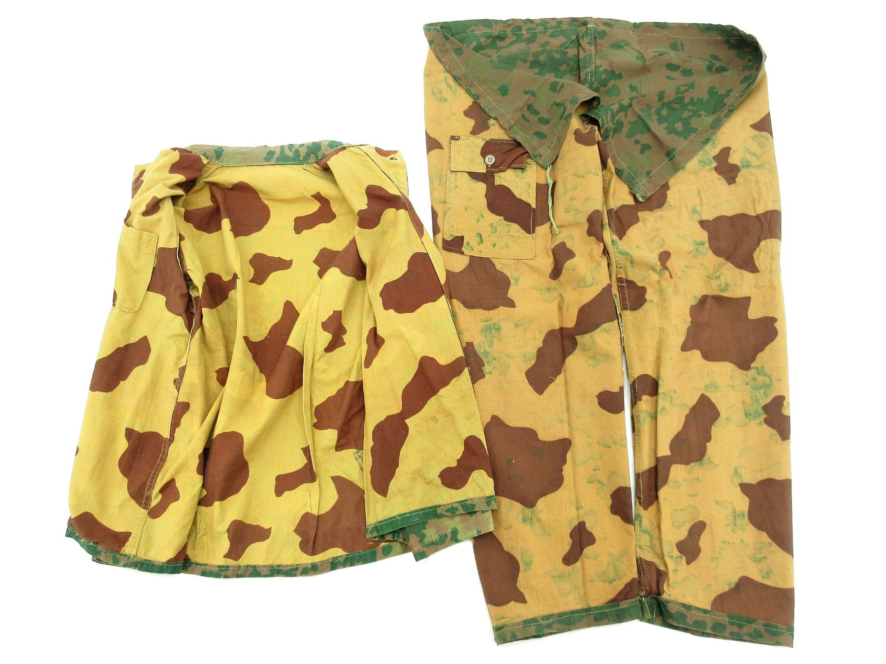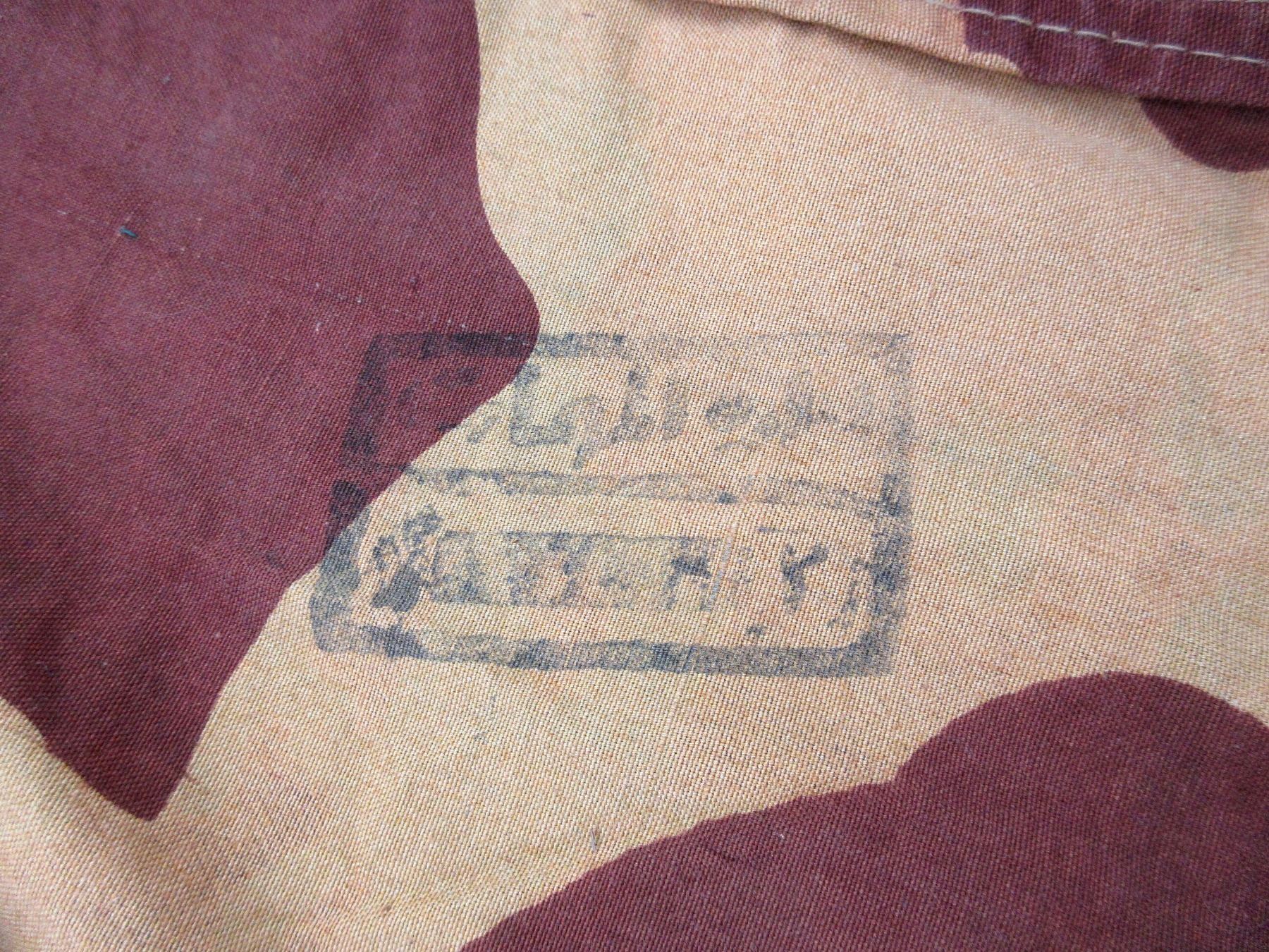 LOT INCLUDES; (1) ROCKS / SAND CAMO REVERSIBLE JACKET, INK STAMPED WITH EGYPTIAN MARKINGS, FLY-FRONT, SHOULDER WIDTH APPROX. 19.5" & (1) ROCKS / SAND CAMO REVERSIBLE PANTS, NO VISIBLE MARKINGS, DRAWSTRING WAIST TO TIGHTEN, WAIST APPROX. 50". SEE PHOTOS.