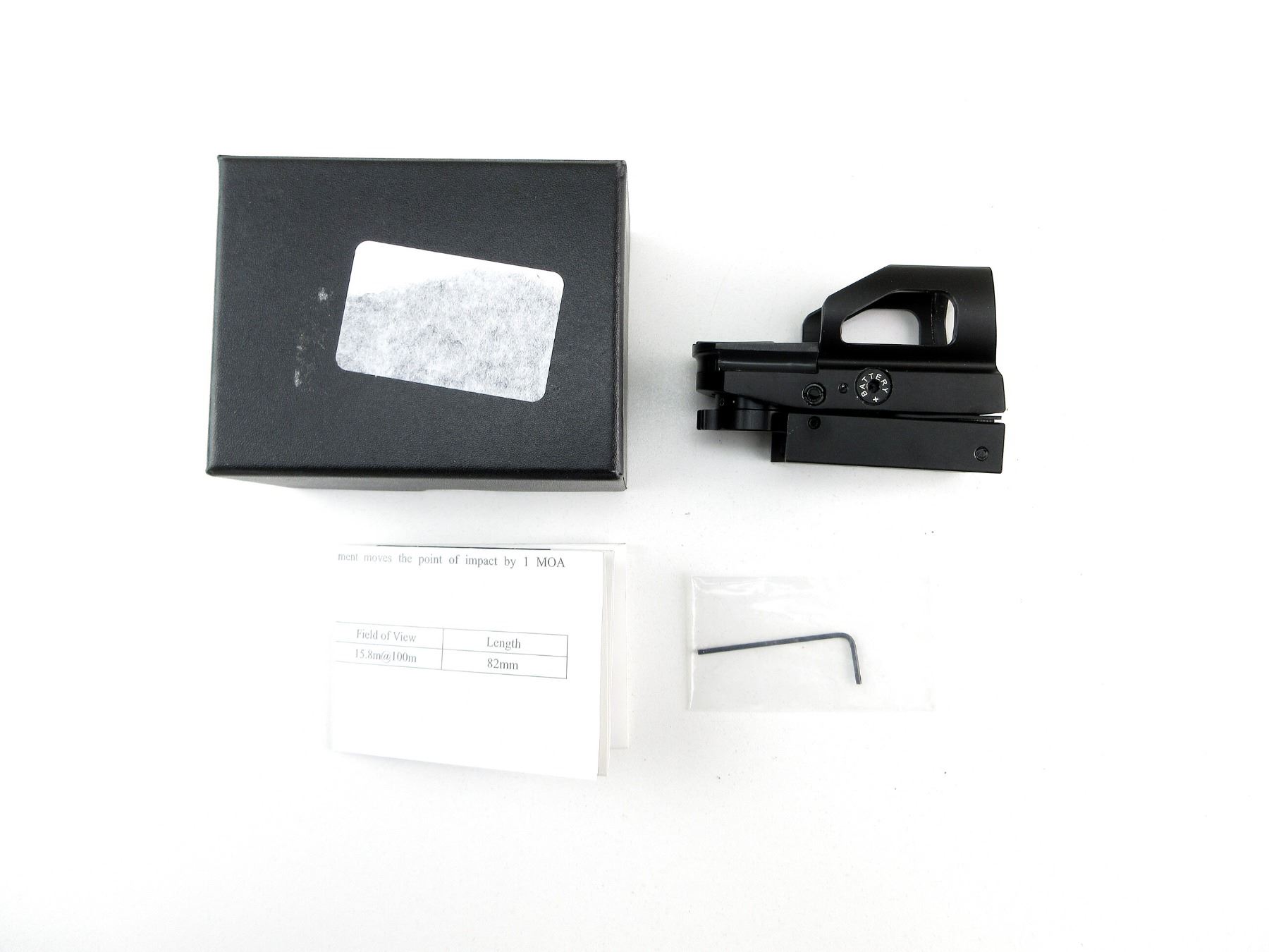 (1) CLEAR OPTICS, FOUR RETICLE OPTIONS, WORKING RED / GREEN ILLUMINATION, WITH VARIOUS BRIGHTNESS SETTINGS, WITH MOUNTING HARDWARE & INSTRUCTION MANUAL. SEE PHOTOS.