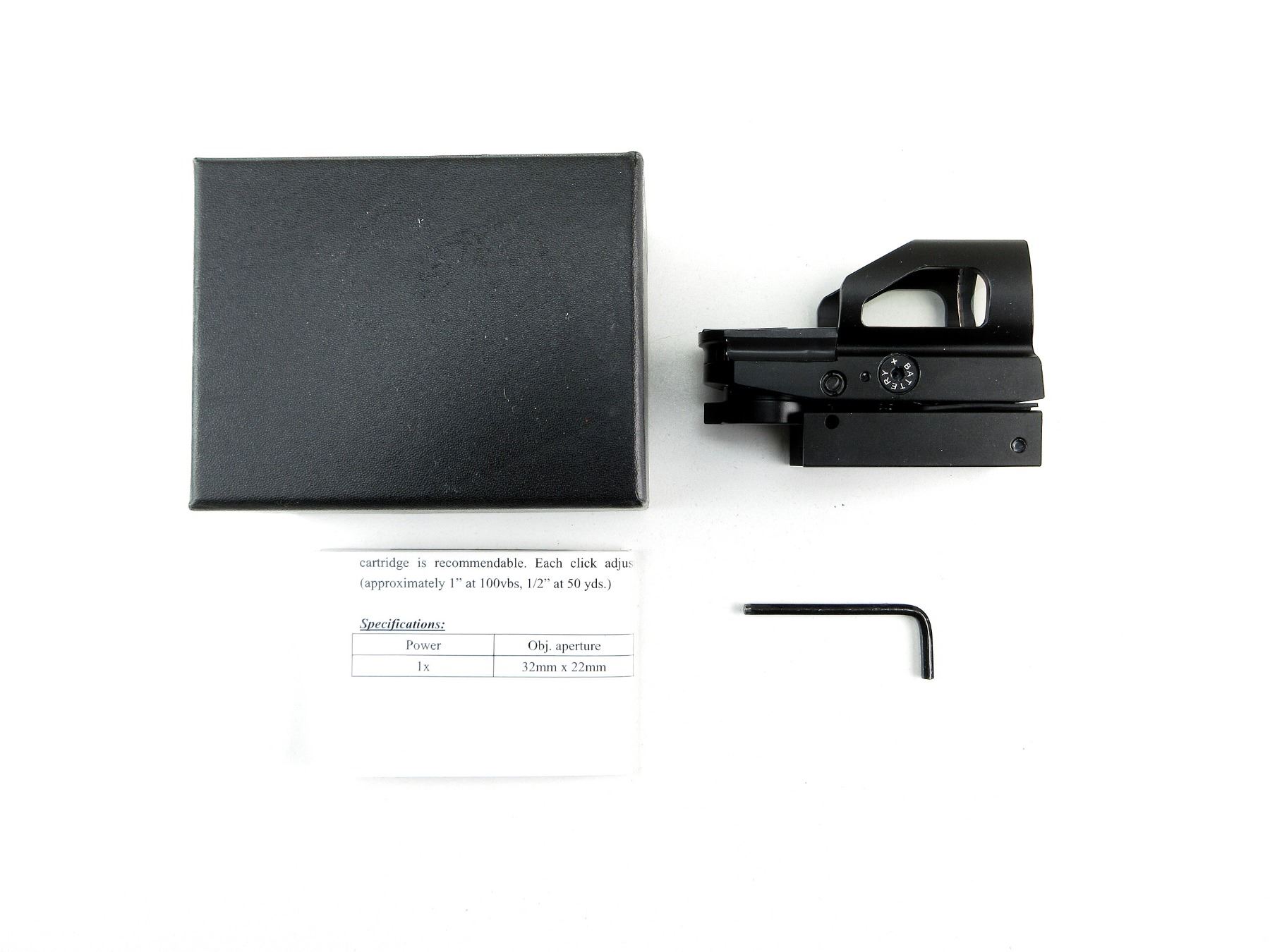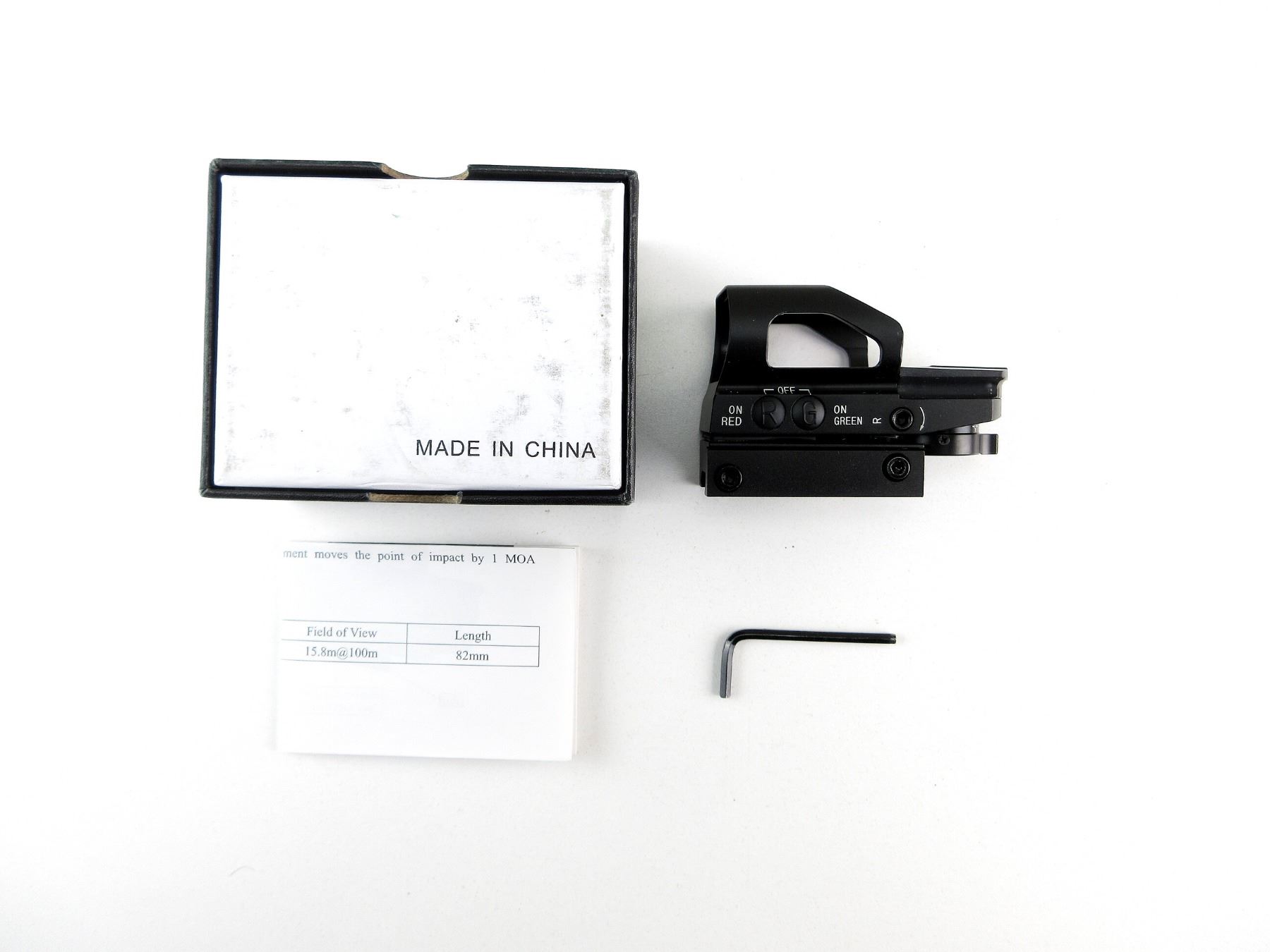 (1) CLEAR OPTICS, FOUR RETICLE OPTIONS, WORKING RED / GREEN ILLUMINATION, WITH VARIOUS BRIGHTNESS SETTINGS, WITH MOUNTING HARDWARE & INSTRUCTION MANUAL. SEE PHOTOS.