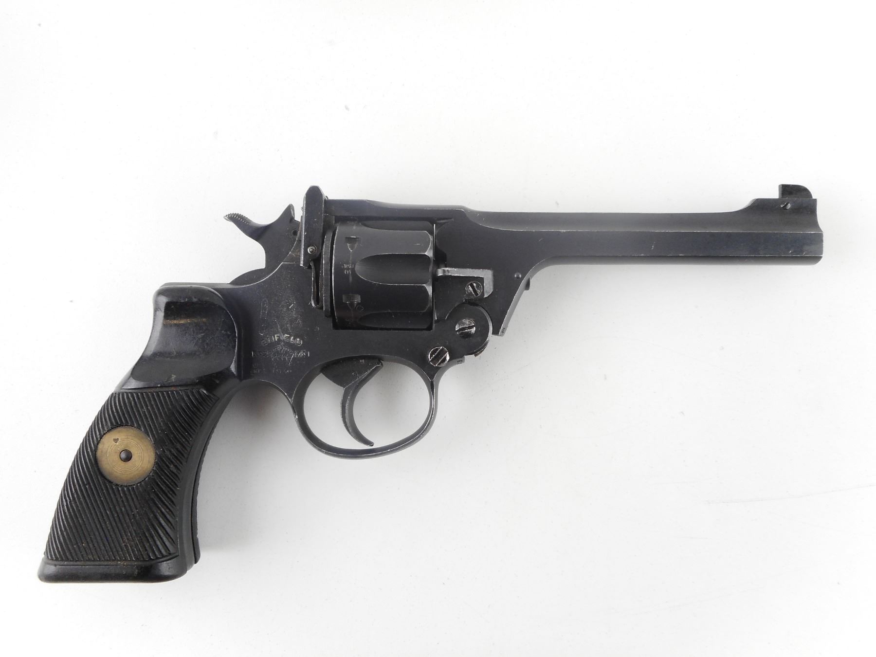 ENFIELD , MODEL: NO II MARK I , CALIBER: 38 S& W , 6 SHOT CAPACITY. BORE IS VERY GOOD. HOLDS COCK, INDEXES WELL, ACTION IS TIGHT. TWO PIECE BROWN PLASTIC GRIPS WITH BRASS DISK. MISSING THE LANYARD LOOP. BLADE FRONT AND NOTCH REAR SIGHTS. SHOWS SOME HANDLING MARKS. ACTION: REVOLVER, BARREL LENGTH: 127MM, CONDITION: 7/10, STOCK # R5235, SERIAL # E232, CLASS: CANADIAN CLASS RESTRICTED