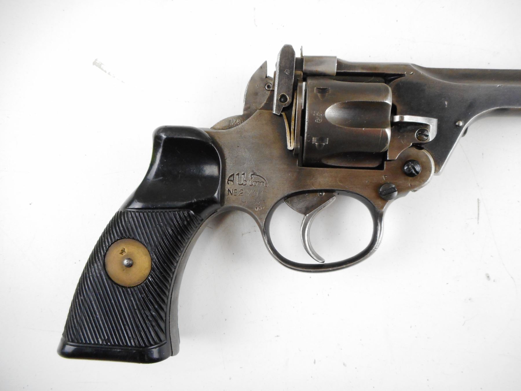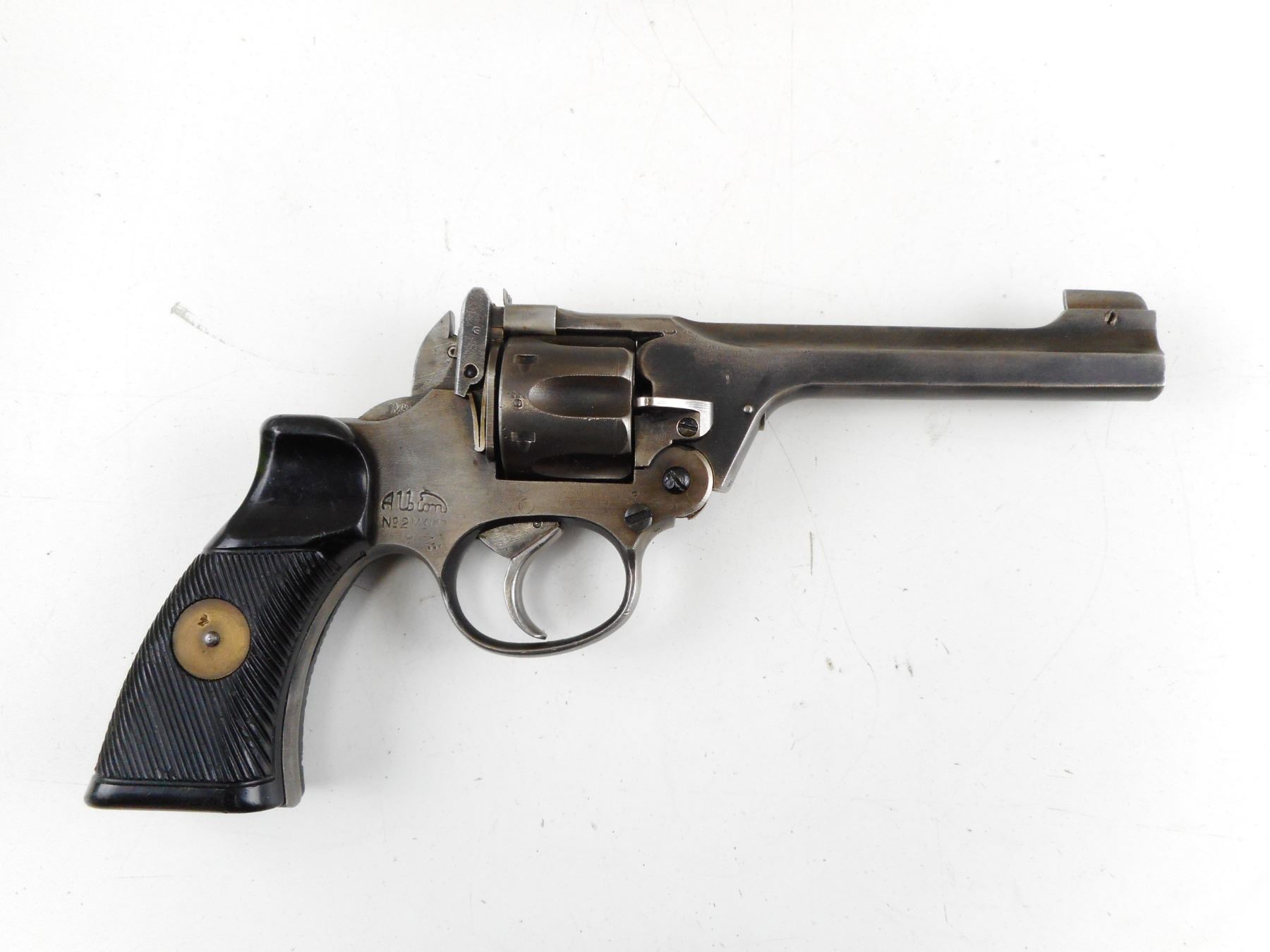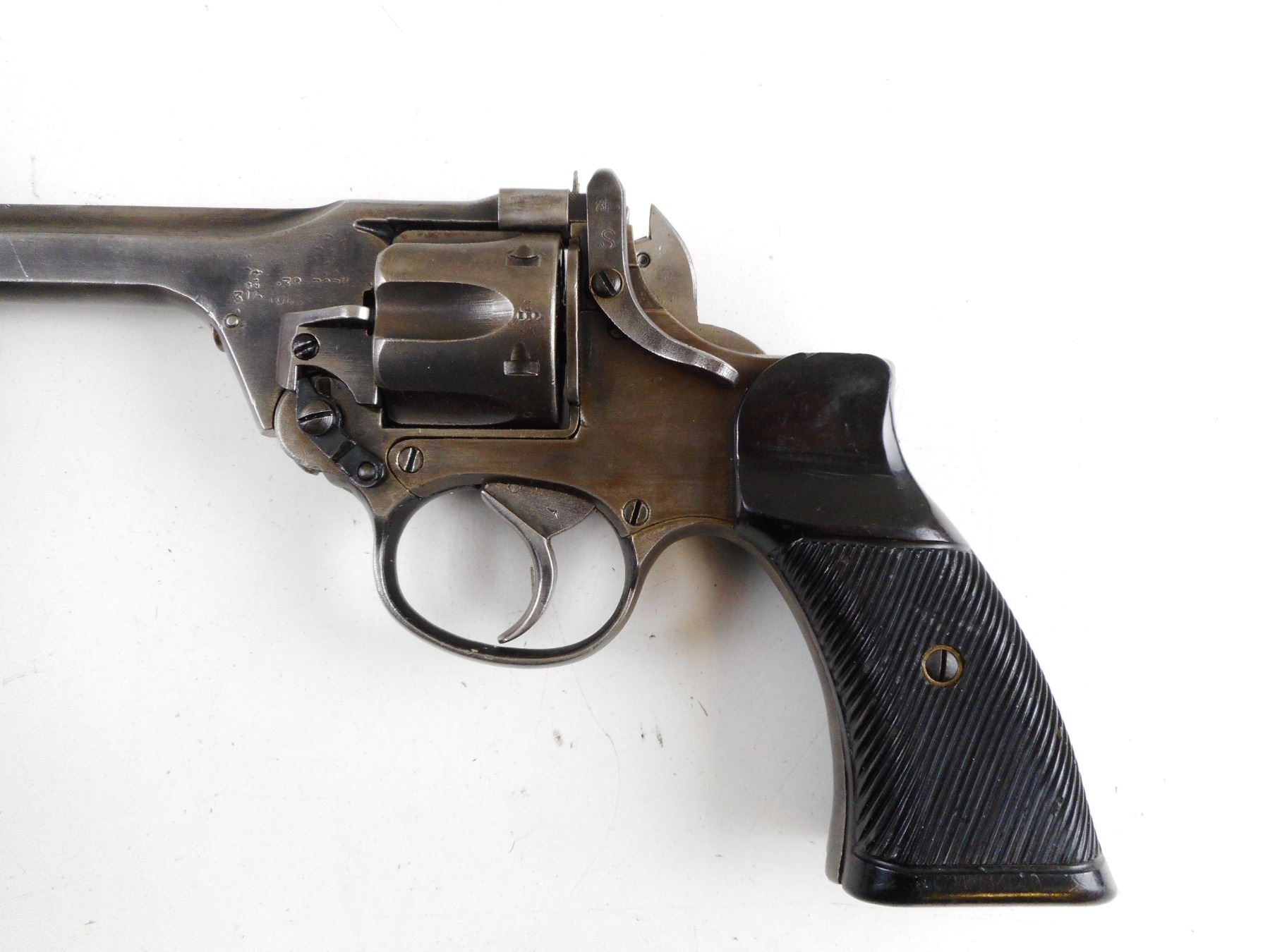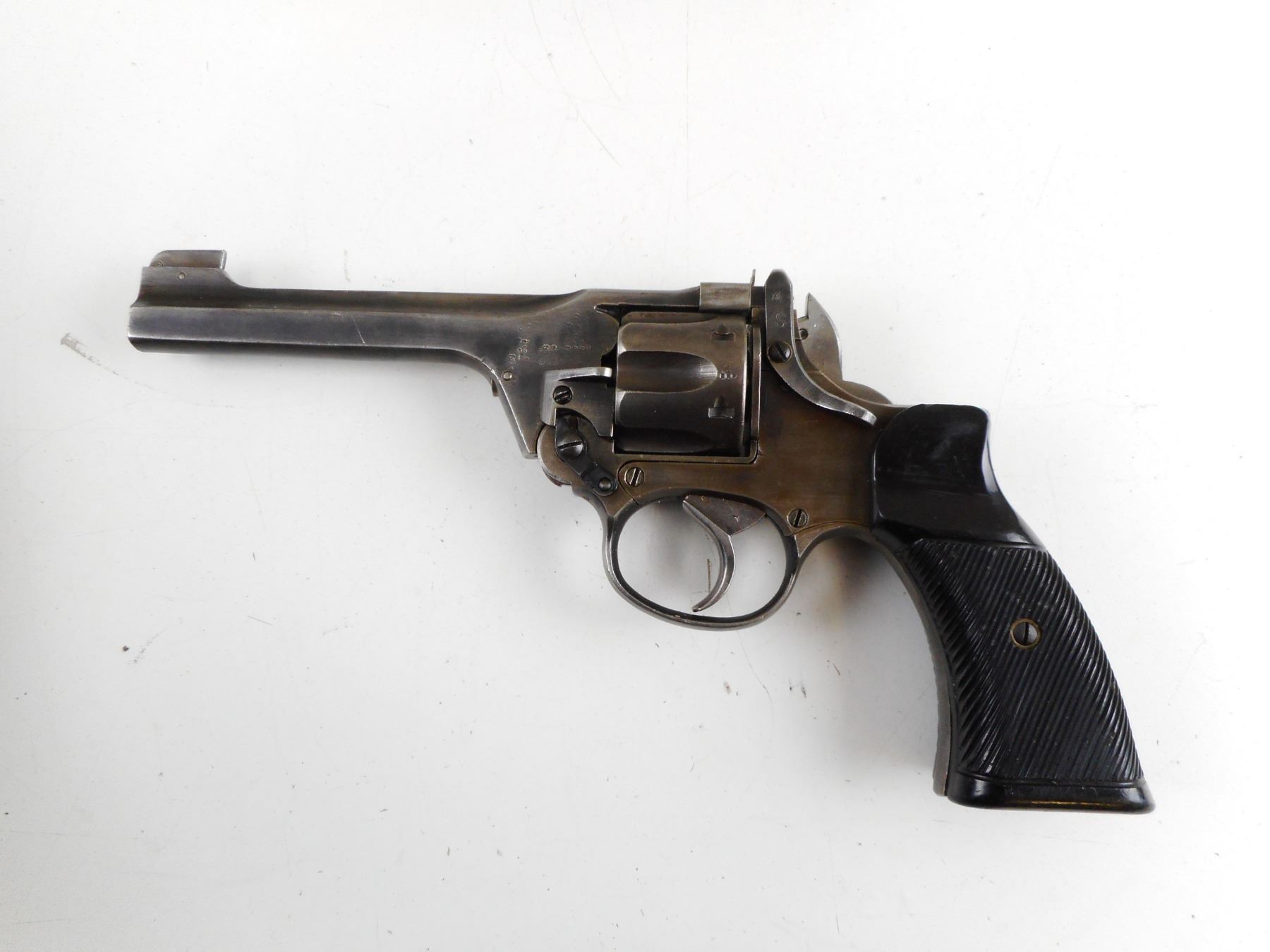 ENFIELD , MODEL: TANKER , CALIBER: 38 S&W , BORE IS GOOD. DATED 1942. NUMEROUS BRITISH MILITARY MARKINGS. SERRATED BROWN TWO PIECE GRIPS WITH BRASS DISK. BLADE FRONT SIGHT AND RAISED NOTCH REAR SIGHT. DOUBLE ACTION ONLY. MISSING THE LANYARD LOOP. SHOWS SOME HANDLING MARKS. , ACTION: REVOLVER , SERIAL # 8990 , BARREL LENGTH: 127MM , CONDITION: 7/10 , CLASS: CANADIAN RESTRICTED CLASS