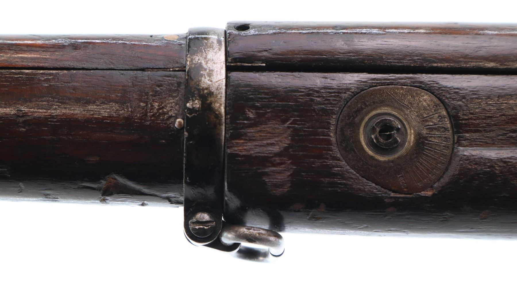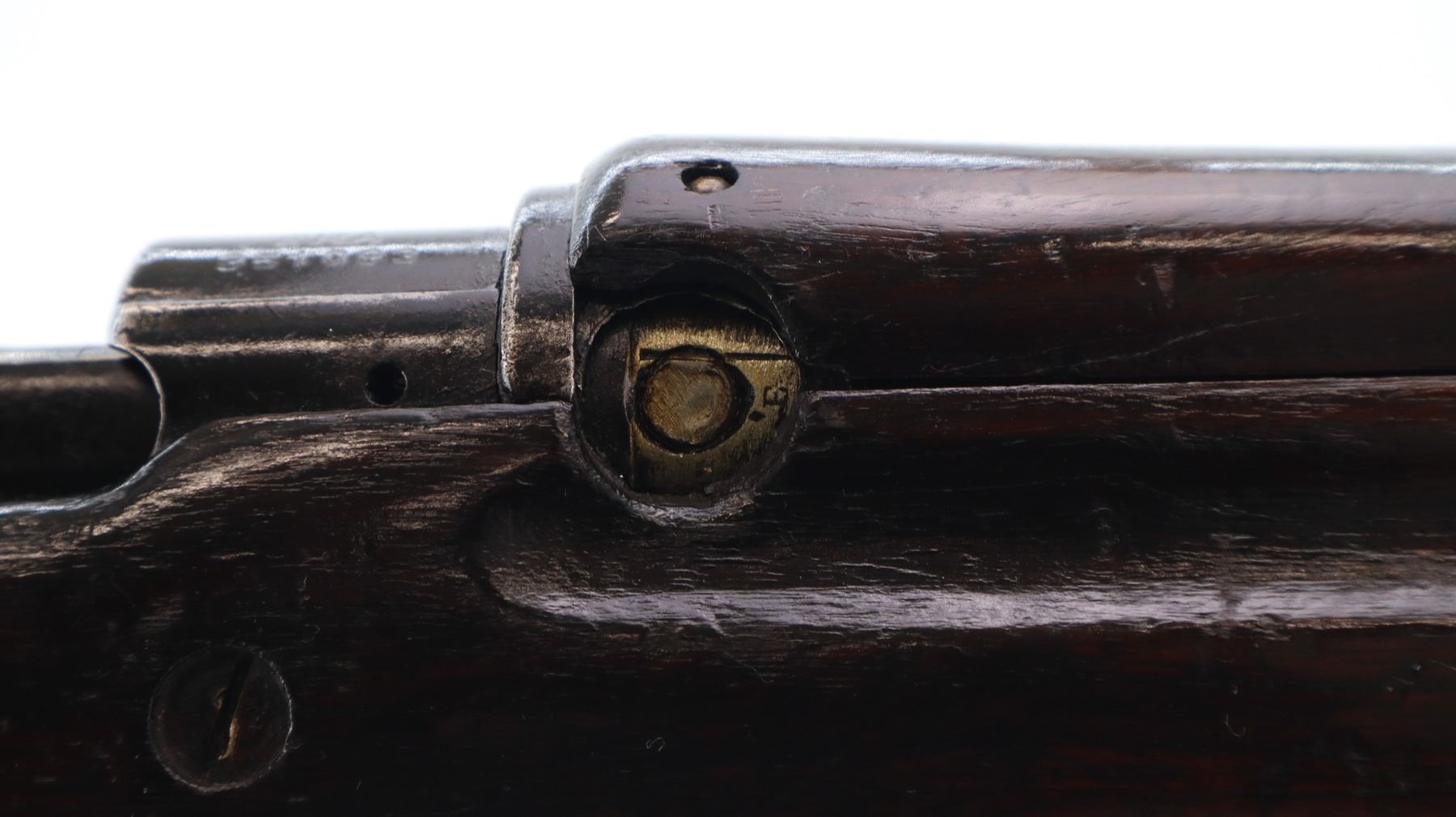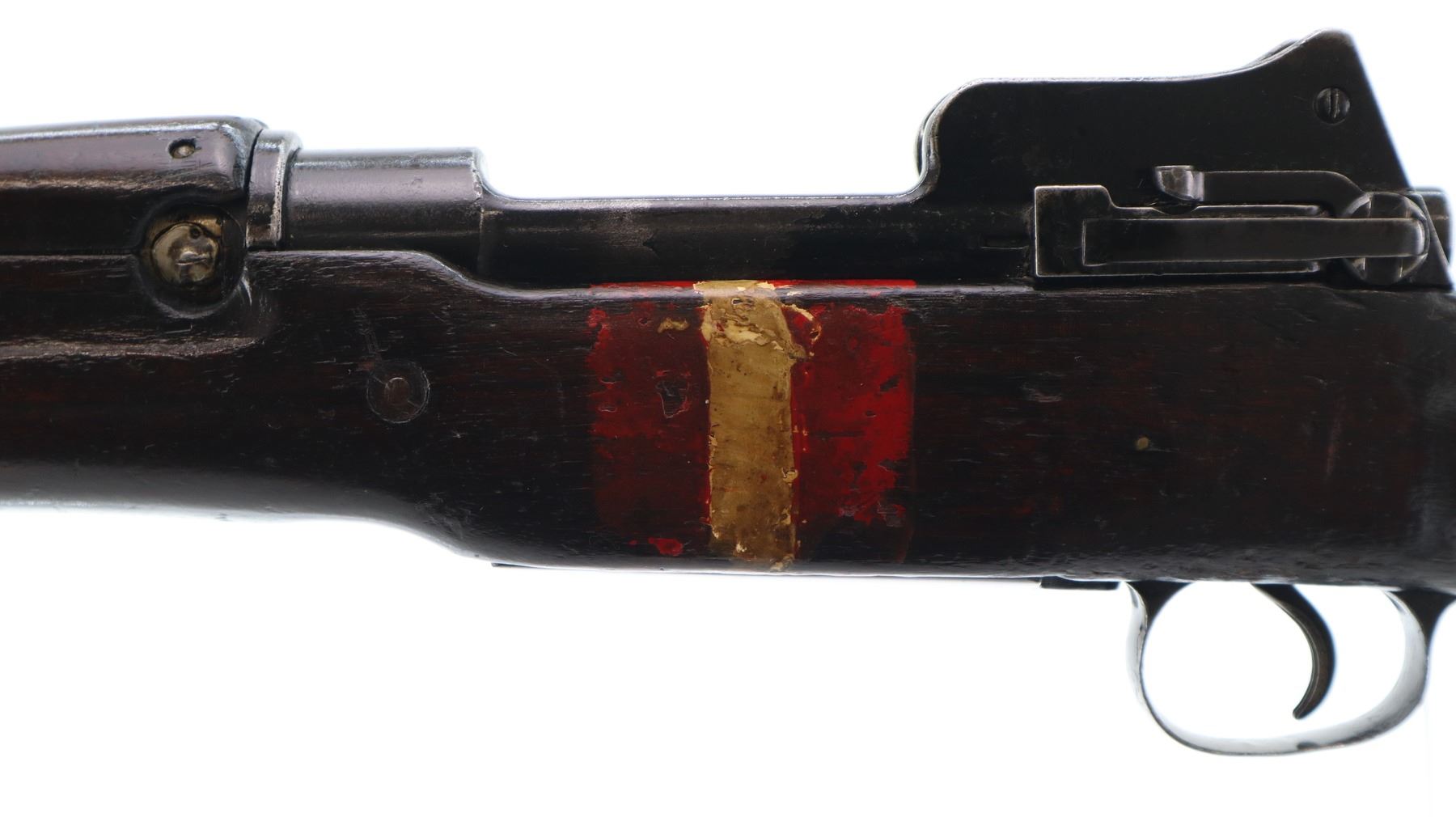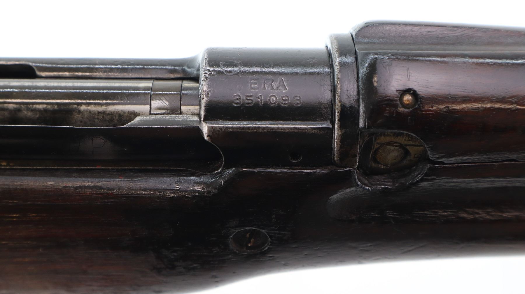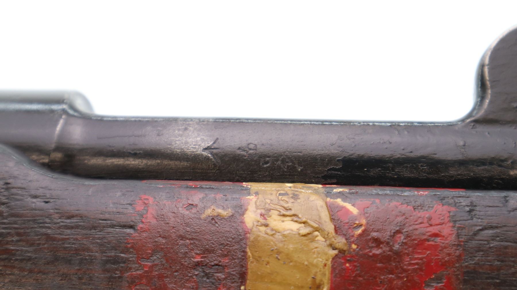 Main Description: This rifle converted by India to a Drill Purpose with welded pin through chamber and white and red bands. DP stamped on various parts. Manufactured by ERA, bolt matches. Blade front sight with ears and ramp, adjustable rear peep sight with ears, black painted metal finish. Three piece full military wood stocks, finger grooved forearm with notched cut outs, pistol grip, small crack behind receiver, smooth steel butt plate with trap, wood stock disk, sling swivels, bayonet lug, retains front volley sight plate and rear volley sight.