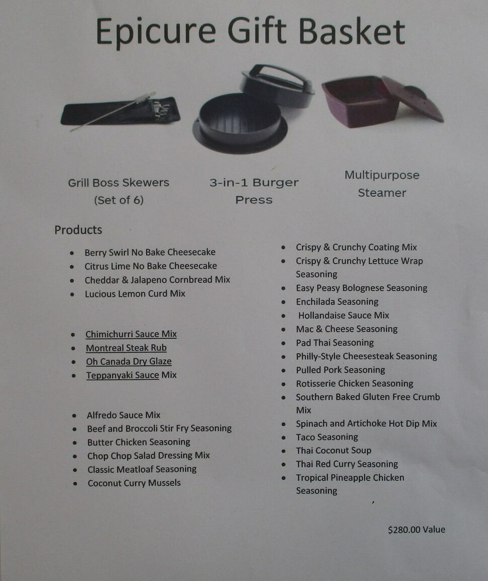 EPICURE SEASONAL GIFT BASKET , EVERYTHING YOU NEED FOR YOUR SUMMER KITCHEN INCLUDES A 3 IN 1 BURGER PRESS, GIFT BOX OF 6 SKEWERS, MULTPURPOSE STEAMER MIXES, RUBS & SEASONING FOR EVERYTHING FROM SALAD, MAINS, SIDES AND DESSERT , RETAIL VALUE $280, GENEROUSLY DONATED BY TONYA VARDY