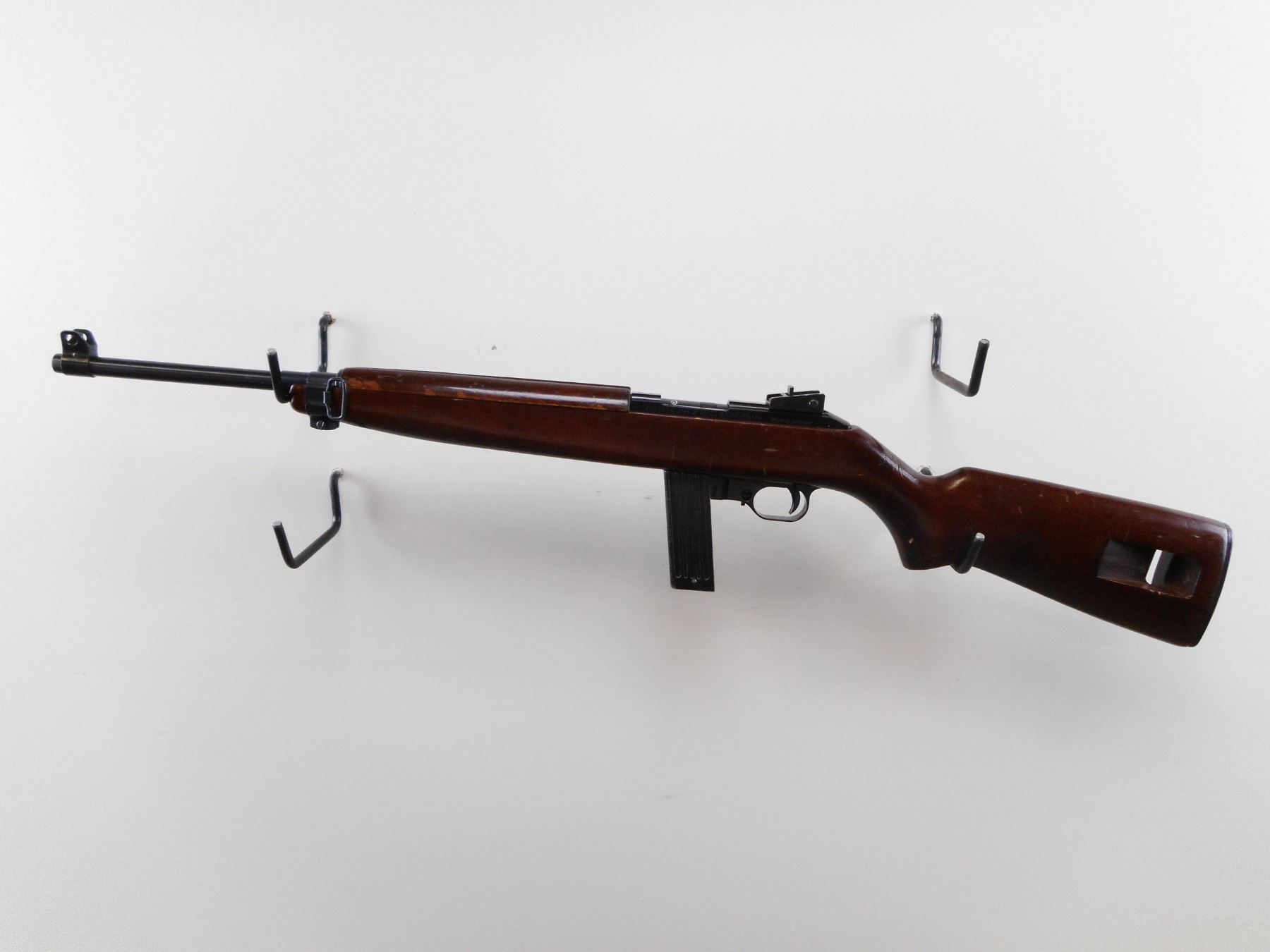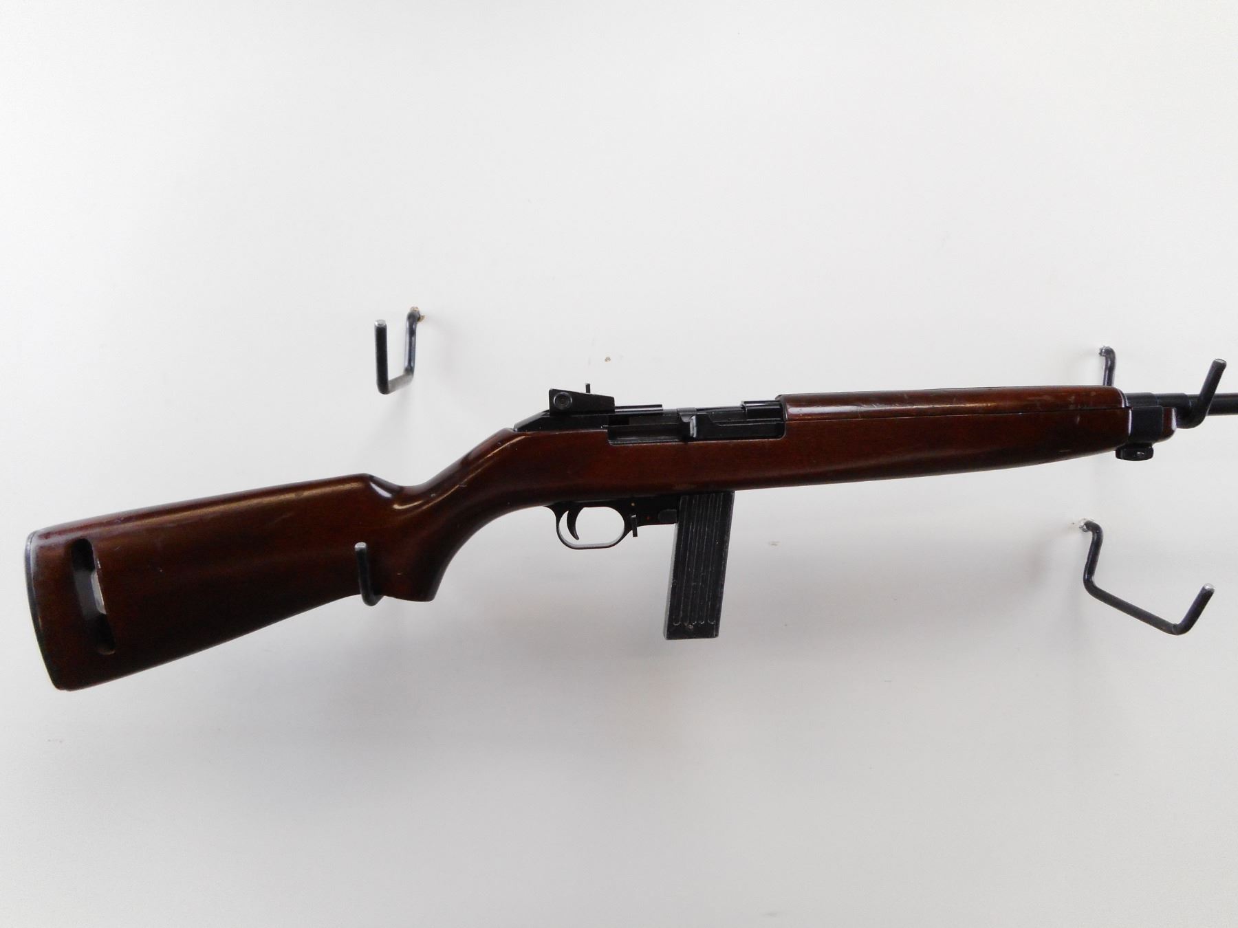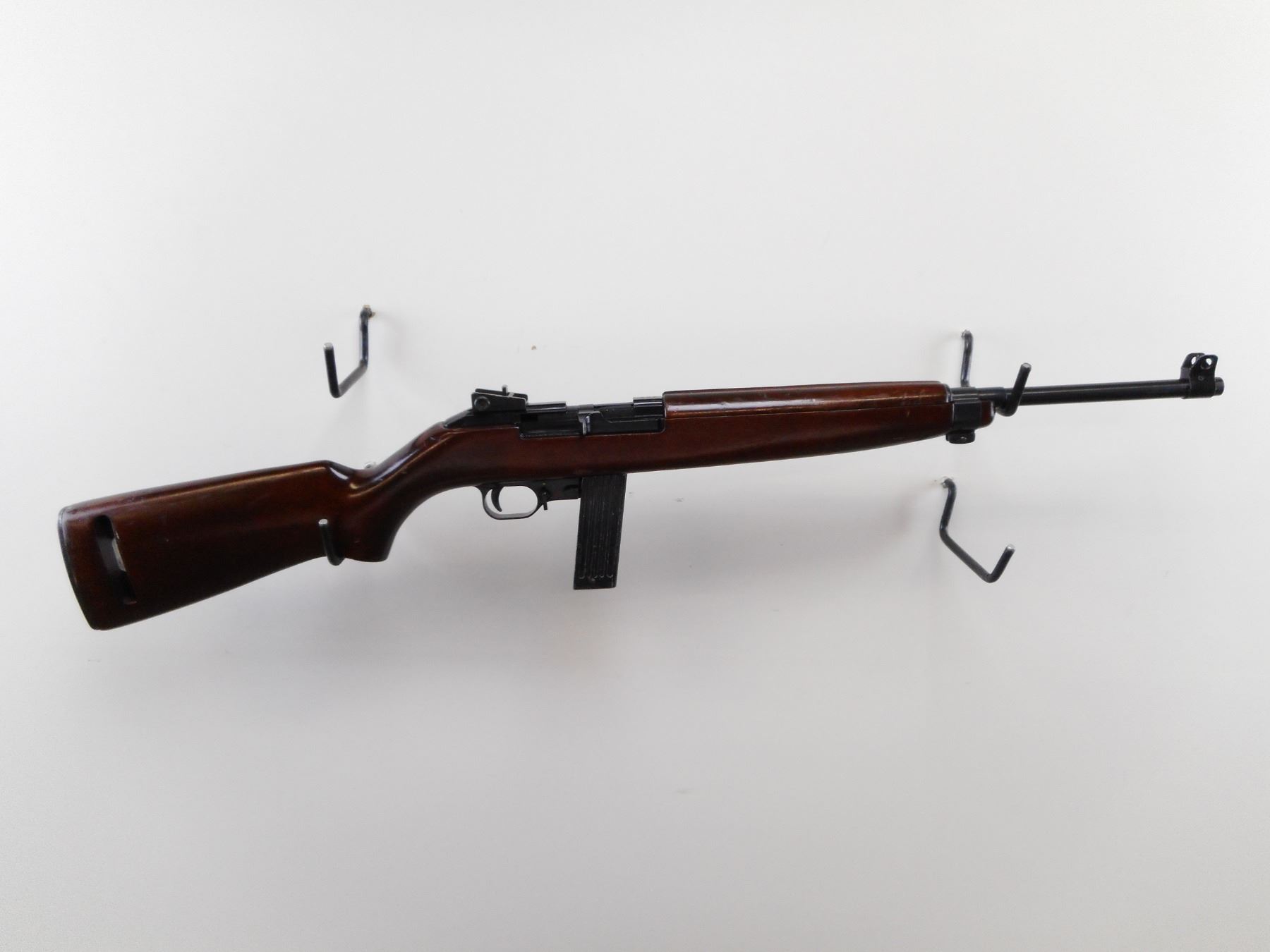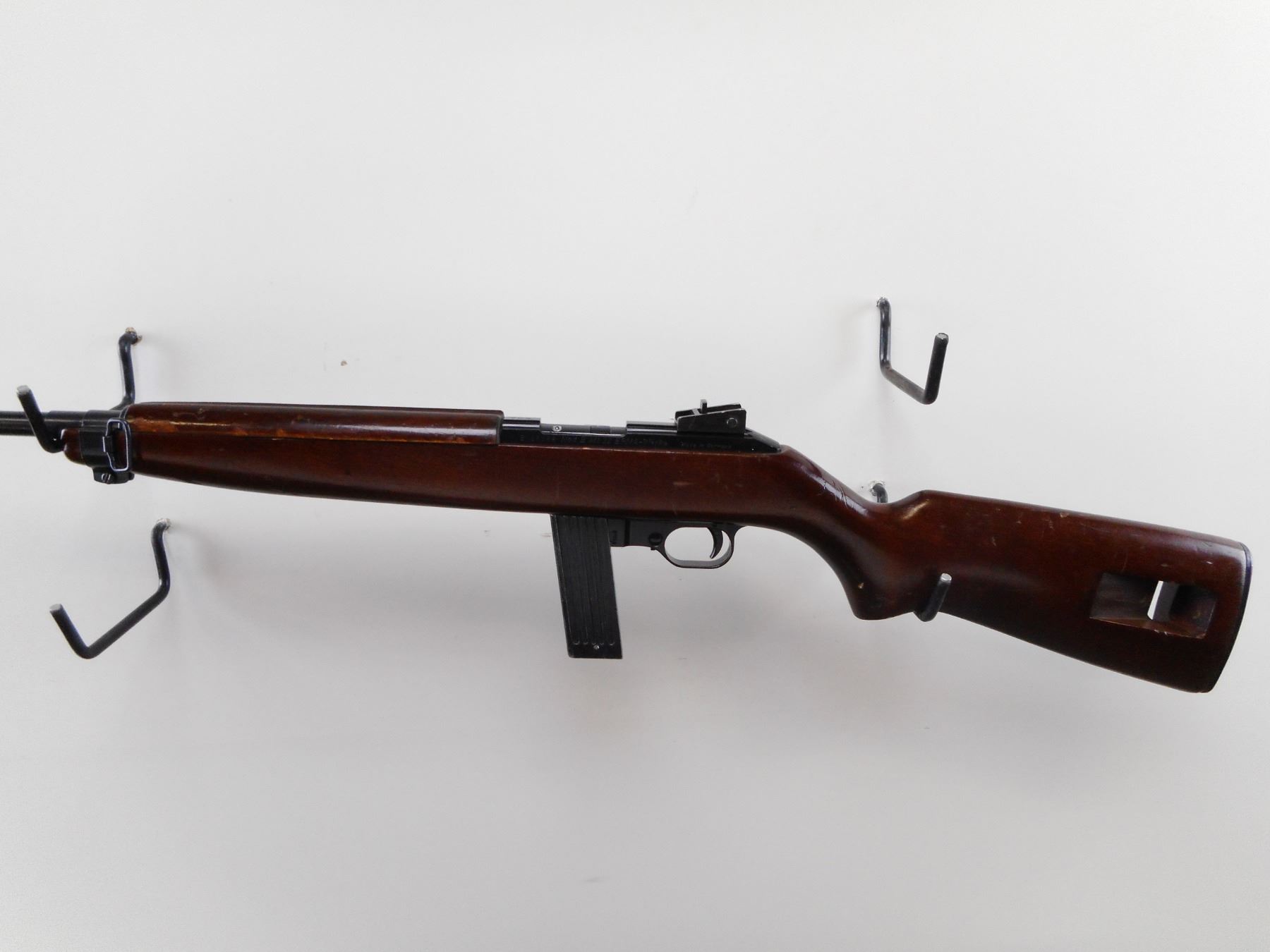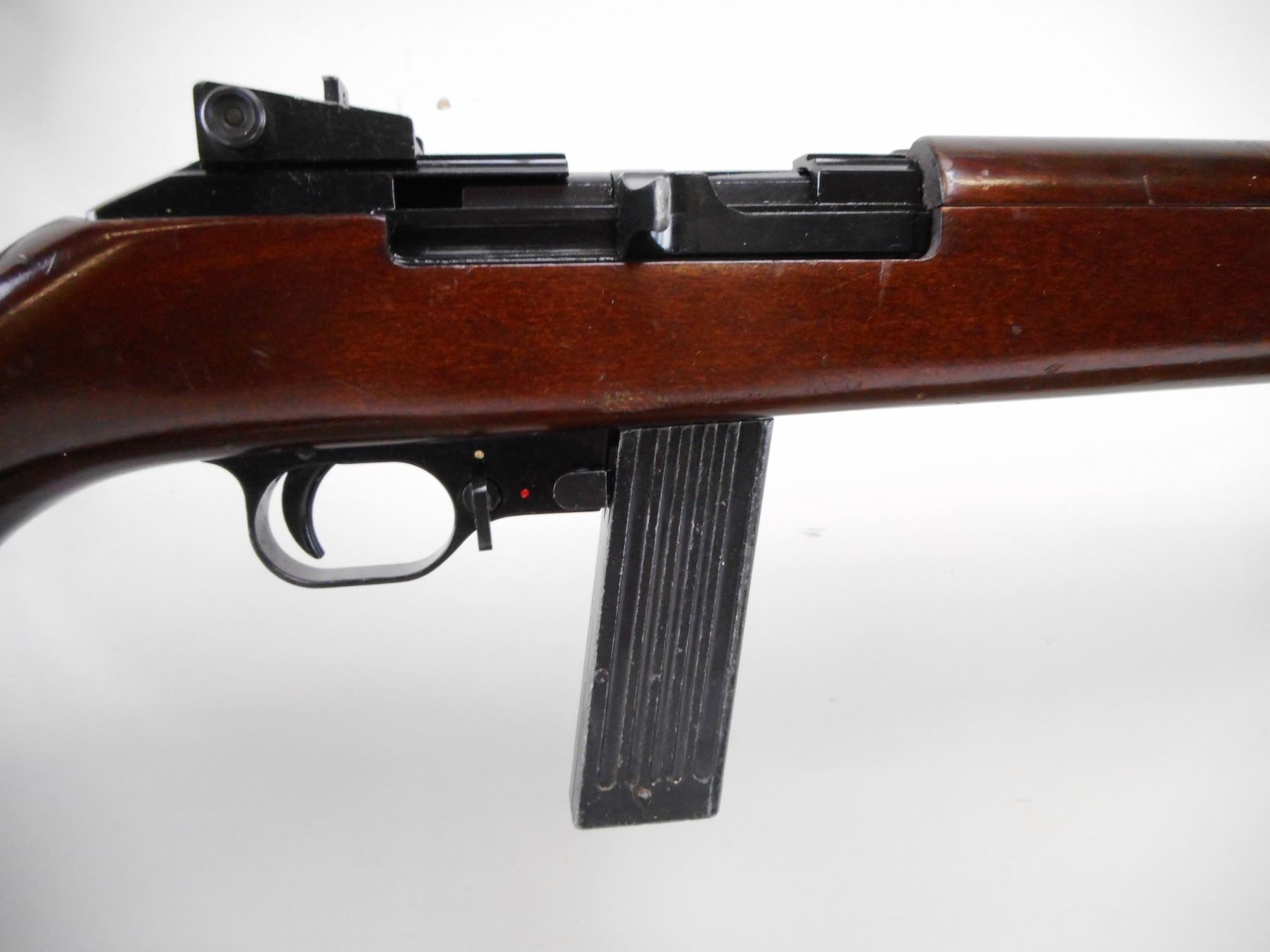 ERMA-WERKE , MODEL: EM1 22 , CALIBER: 22 LR , COMES WITH EXTENDED MAGAZINE. BORE IS VERY GOOD. BLADE FRONT SIGHT WITH EARS. ADJUSTABLE REAR PEEP SIGHT. BLUED BARREL. BLACK FINISH RECEIVER AND TRIGGER GUARD. TWO PIECE SMOOTH WOOD STOCK. GROOVED BLACK STEEL BUTT PLATE. SLING SWIVEL AND SLOT IN BUTT. RESEMBLES AN M1 CARBINE. METAL SHOWS SOME HANDLING MARKS. STOCK SHOWS HANDLING MARKS AND WEAR. , SERIAL # E129286 , ACTION: SEMI AUTOMATIC RIFLE , BARREL LENGTH: 17 1/2" , CONDITION: 7/10 , CLASS: CANADIAN NON RESTRICTED CLASS