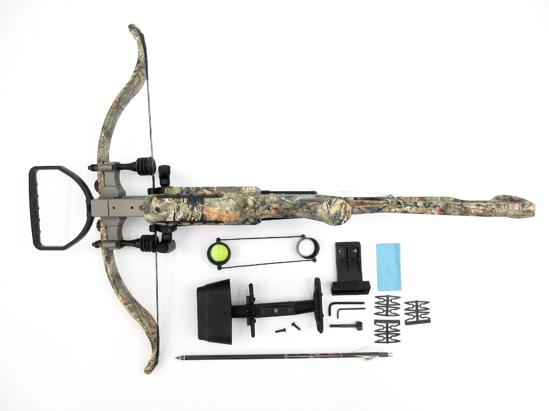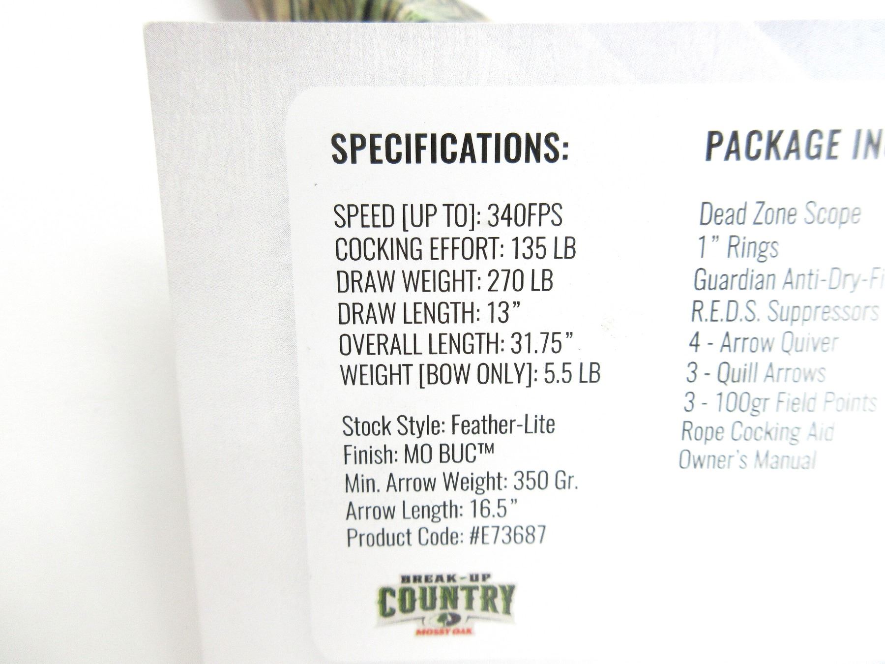 LOT INCLUDES; (1) RECURVE CROSS BOW, SPEED UP TO 340 FPS, COCKING EFFORT 135 LBS, DRAW WEIGHT 270 LBS, DRAW LENGTH 13", WEIGHT 5.5 LBS, MOSSY OAK, DEAD ZONE SCOPE, CLEAR OPTICS, SCOPE COVERS, (1) STRING, GUARDIAN ANTI-DRY-FIRE, R.E.D.S. SUPPRESSORS, 1" SCOPE RINGS, (4) ARROW QUIVER WITH BRACKET, (1) QUILL ARROW WITH FIELD TIP, ROPE COCKING AID, OWNER'S MANUALS, WITH ORIGINAL BOX, NOS SEE PHOTOS.