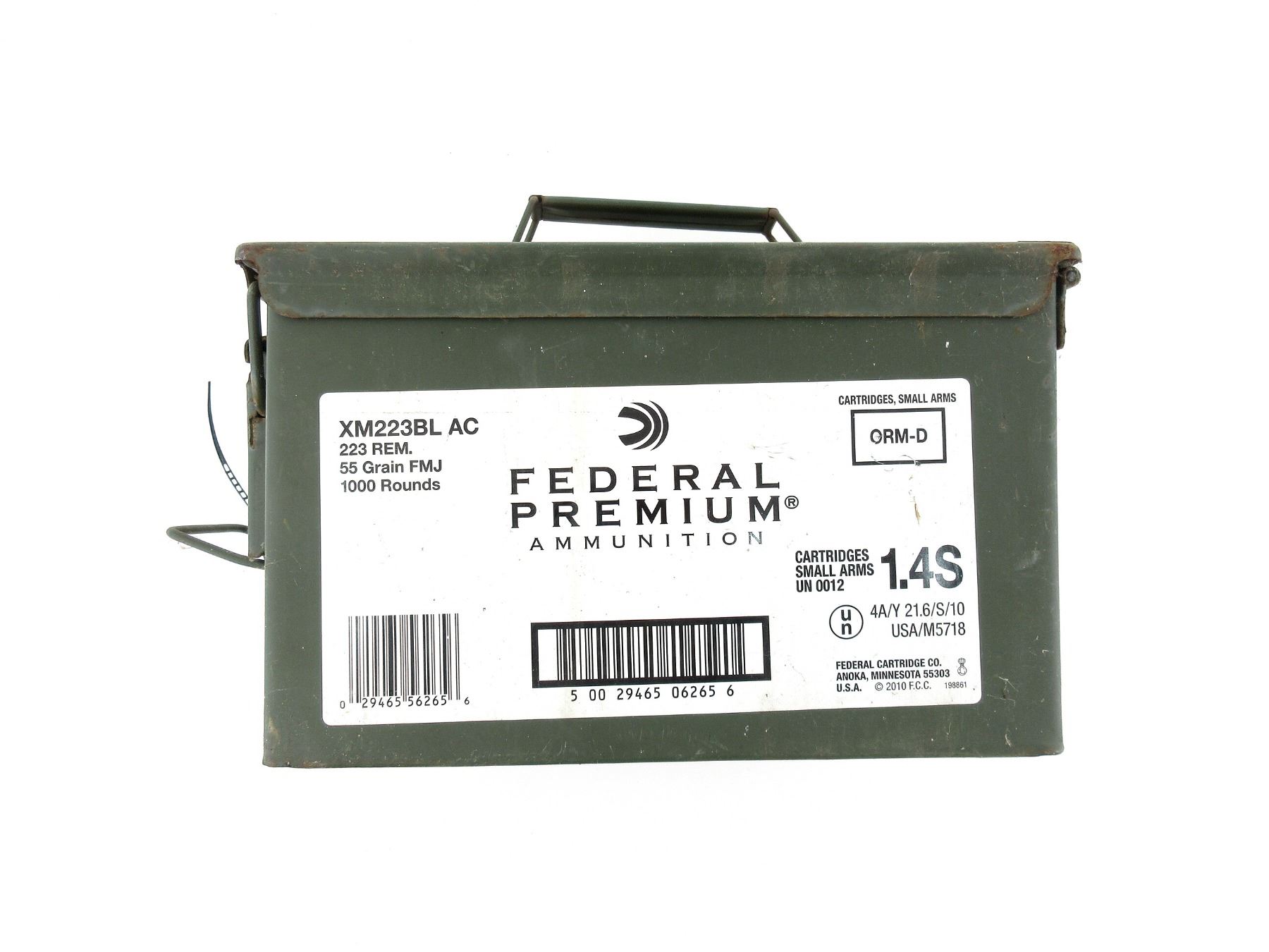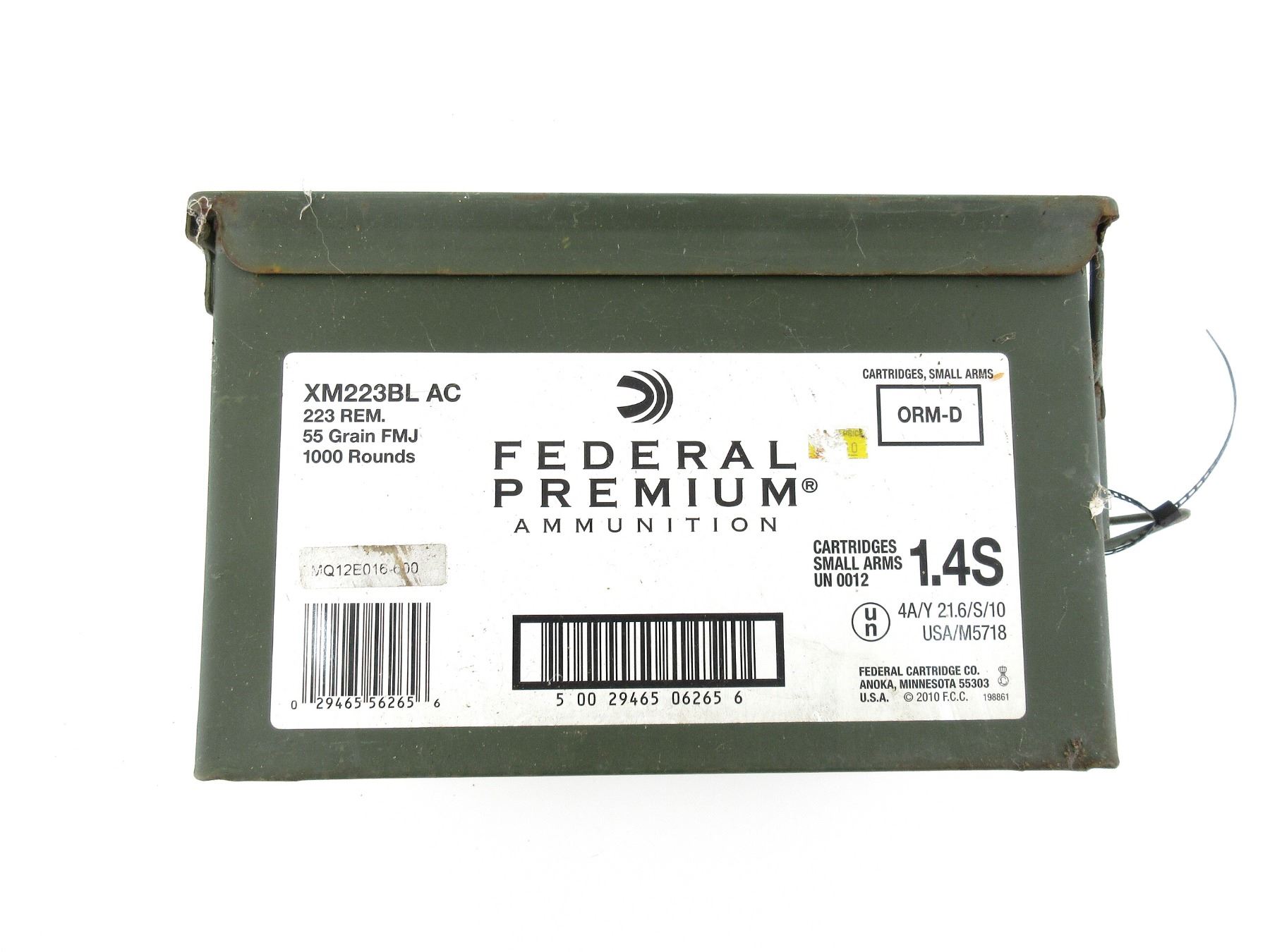 LOT INCLUDES; APPROX. (1000) RNDS, 55 GRNS (STATED ON METAL AMMO TIN NOT CONFIRMED), FMJ, ONE METAL AMMO TIN, APPROX. DIM 11"X6"X7", UNOPENED NOS.