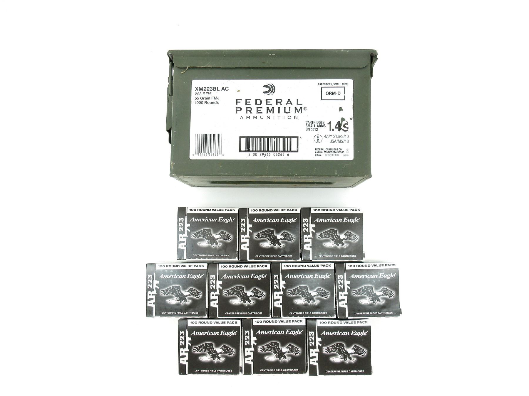 LOT INCLUDES; APPROX. (1000) RNDS, 55 GRNS (STATED ON METAL AMMO TIN NOT CONFIRMED), FMJ, ONE METAL AMMO TIN, APPROX. DIM 11"X6"X7".