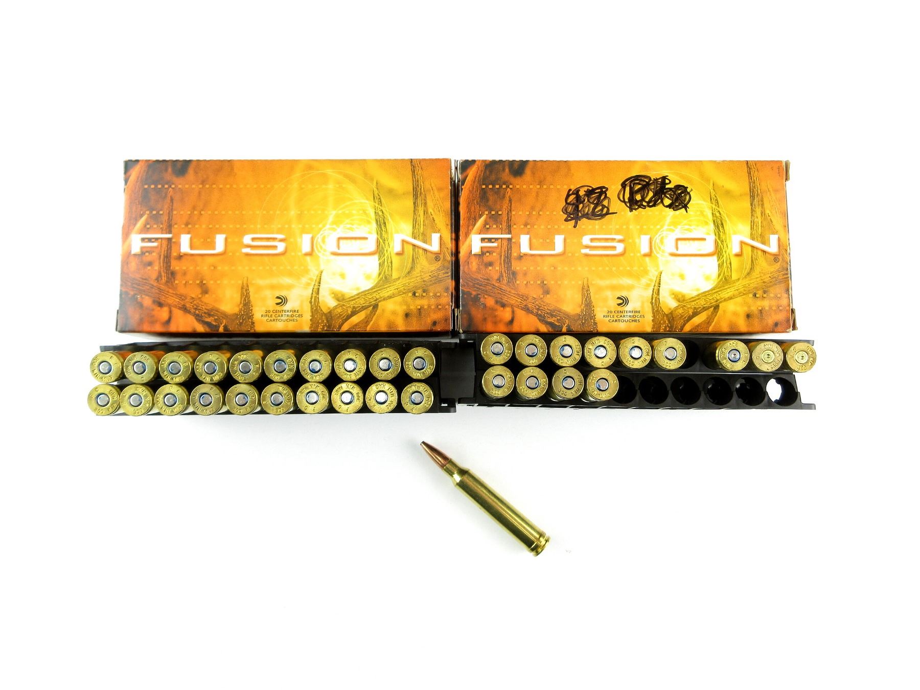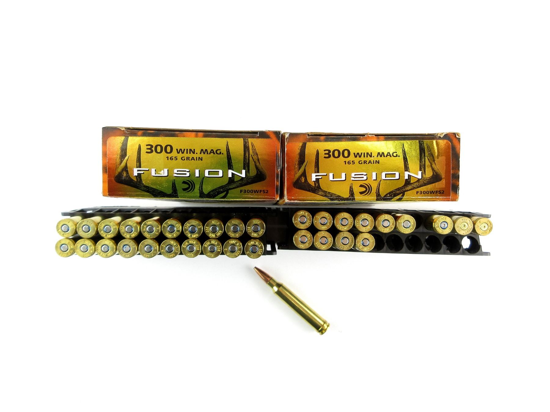LOT INCLUDES; APPROX. (31) RNDS, 165 GRNS (STATED ON BOXES NOT CONFIRMED), FUSION, (3) NON-PRIMED BRASS CASES.