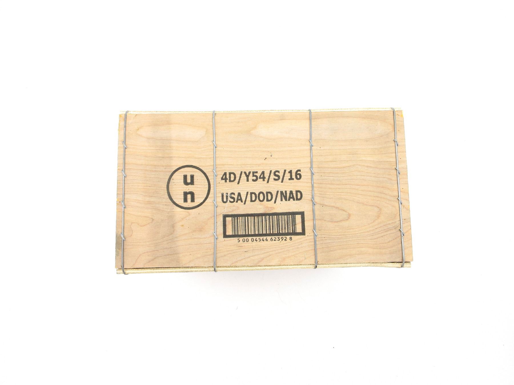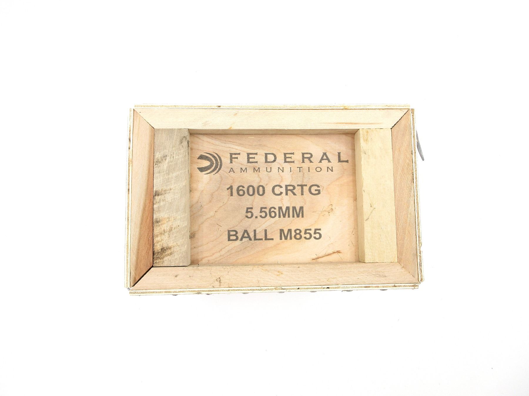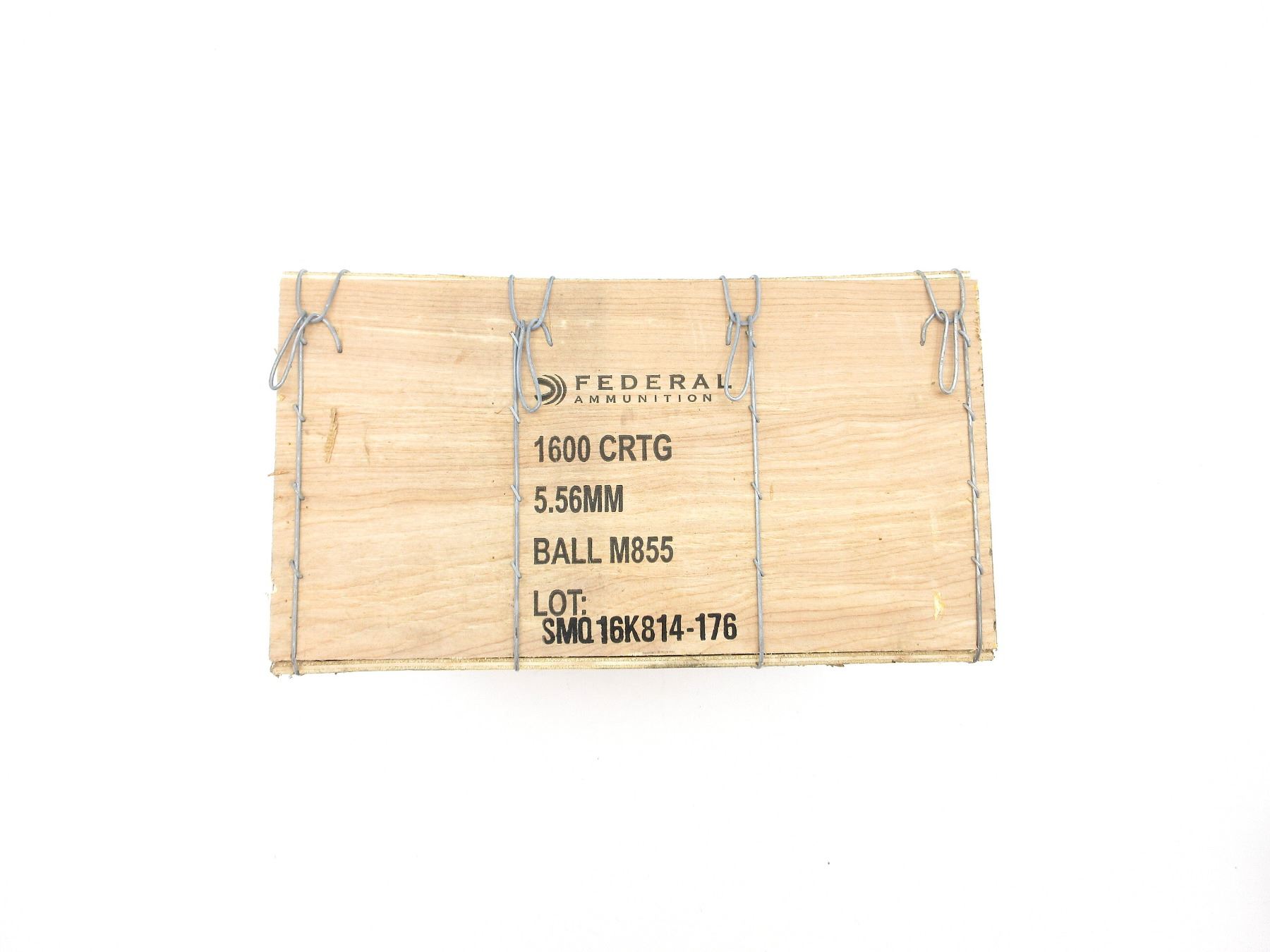 LOT INCLUDES; APPROX. (1600) RNDS, BALL M855, TWO BANDOLIERS, SEALED CRATE, TWO METAL AMMO CANS, APPROX. DIM 12"X6"X7".