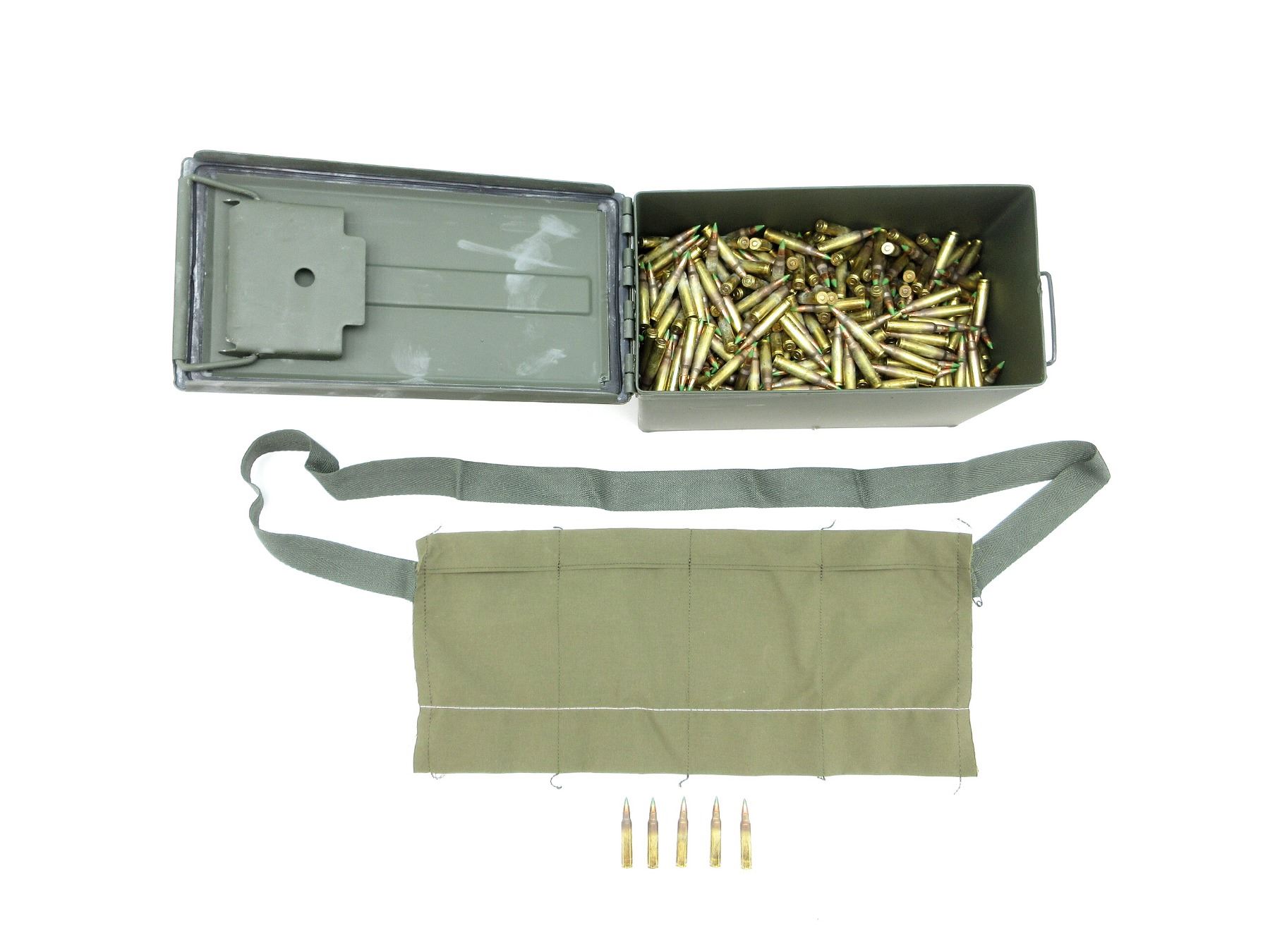 LOT INCLUDES; APPROX. (800) RNDS, BALL M855, ONE BANDOLIER, ONE METAL AMMO CAN, APPROX. DIM 12"X6"X7".