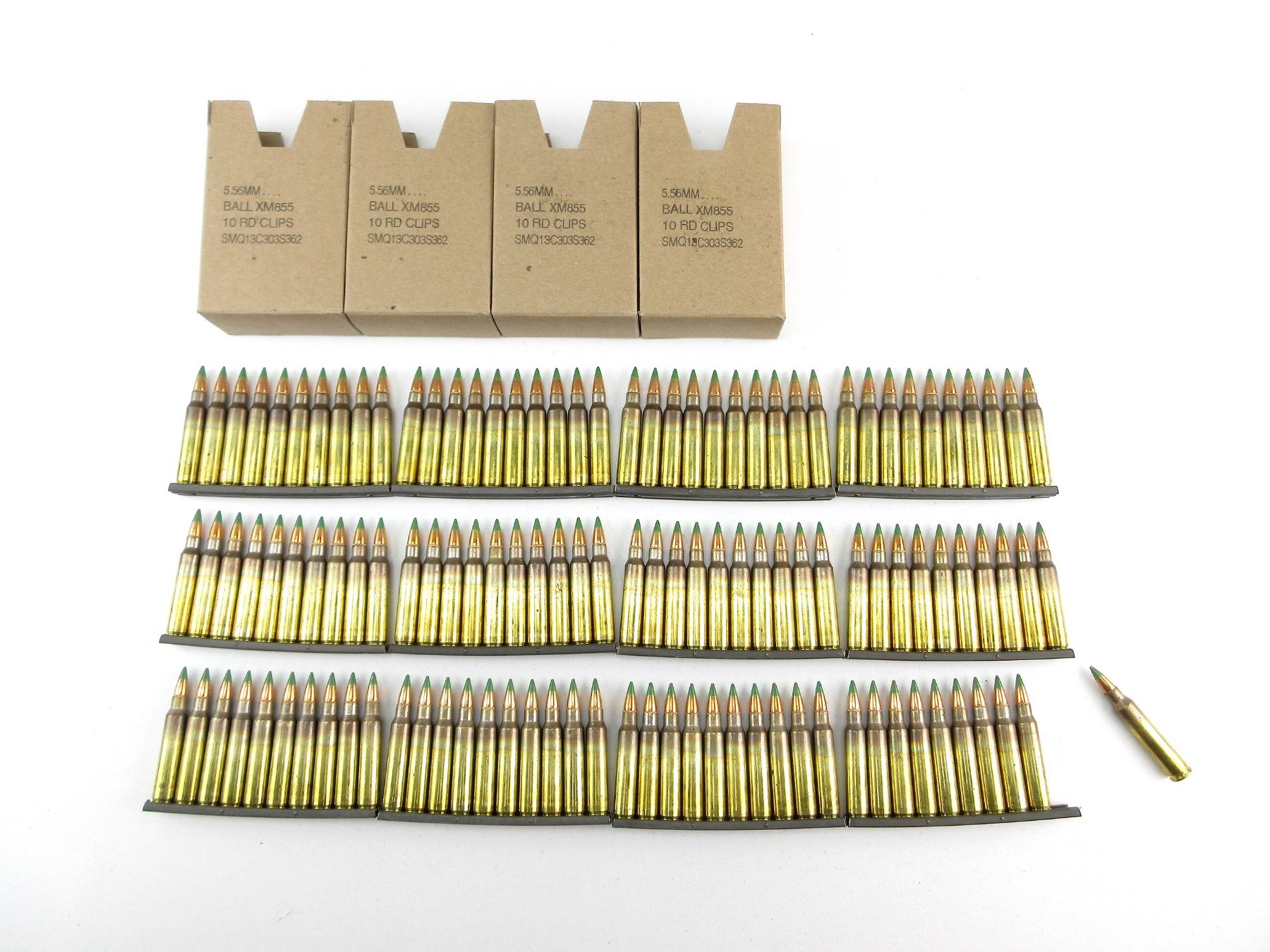 LOT INCLUDES; APPROX. (120) RNDS, FMJ BALL, GREEN TRACERS, XM855LC1 AC1, (12) STRIPPER CLIPS.