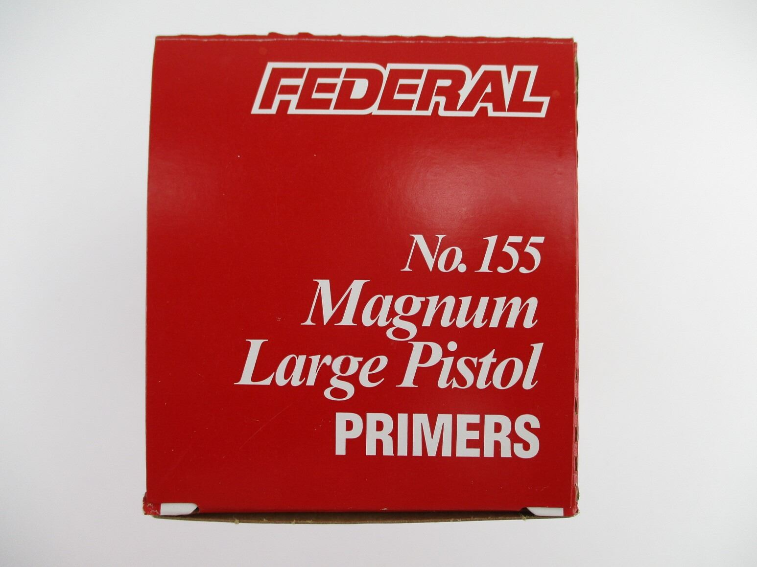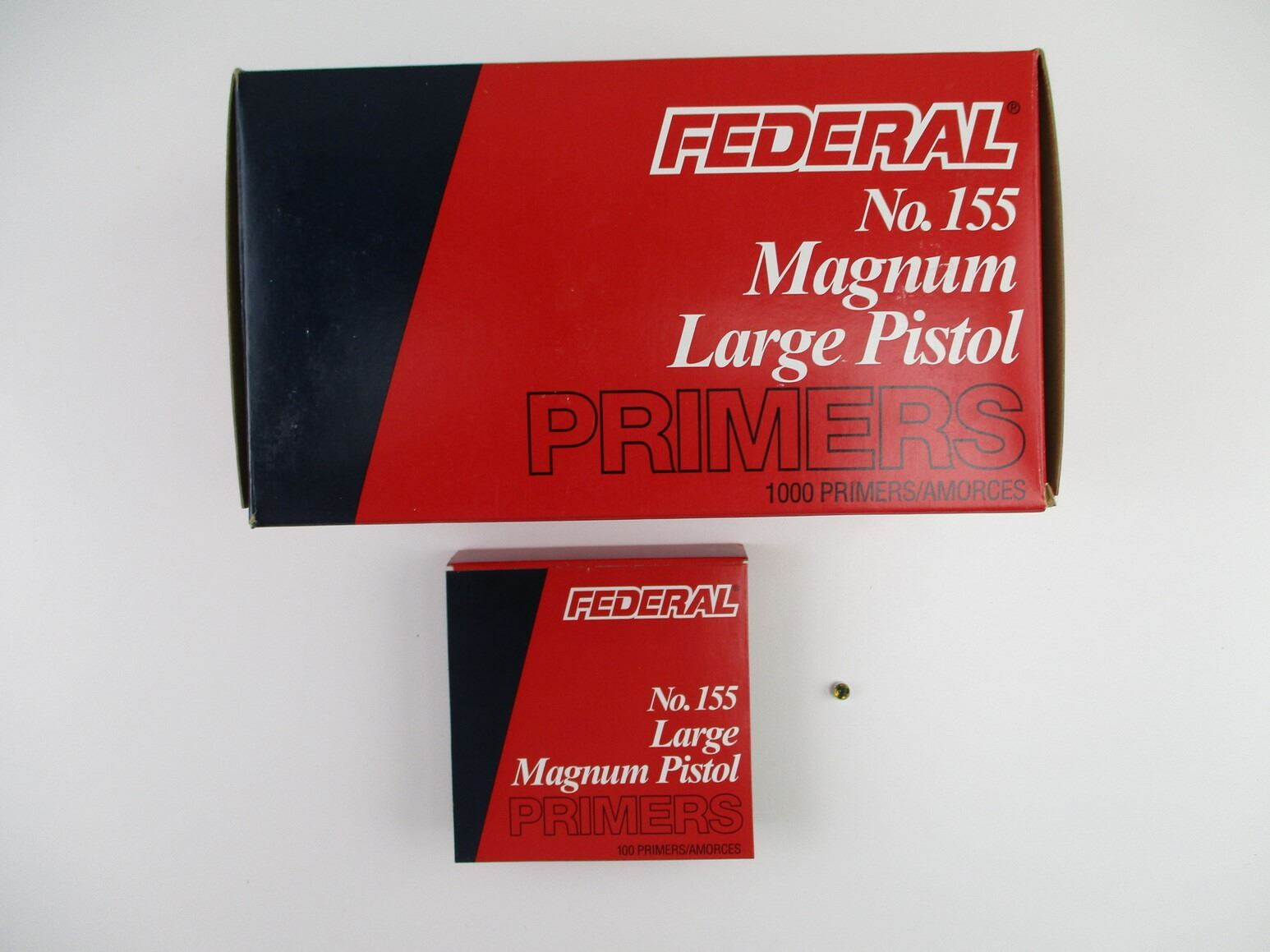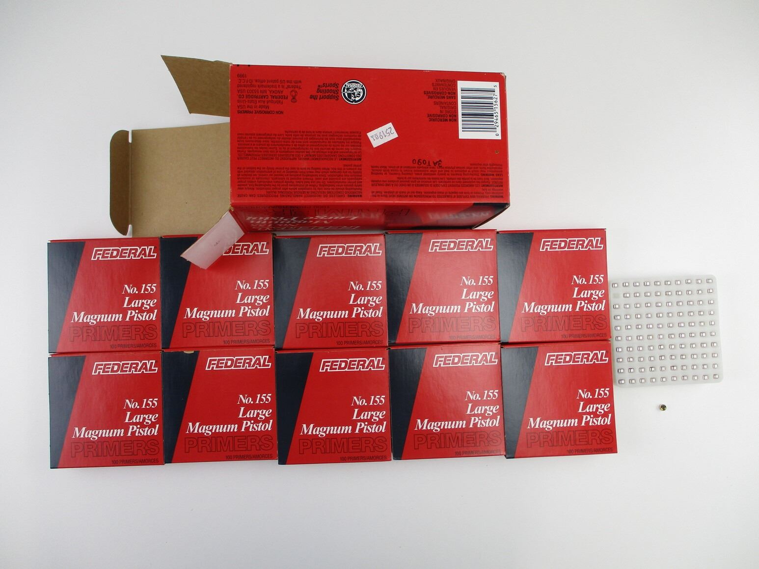 FEDERAL NO. 155 MAGNUM LARGE PISTOL PRIMERS LOT, APPROX 1000 PRIMERS, THERE ARE NEW SHIPPING RESTRICTIONS, PLEASE MAKE SURE YOU HAVE READ AND CONFIRMED WE CAN SHIP TO YOU BEFORE BIDDING ON THIS LOT. PLEASE SEE LOT 0 IN THIS SESSION. NO REFUNDS WILL BE ISSUED, OR BIDS RETRACTED