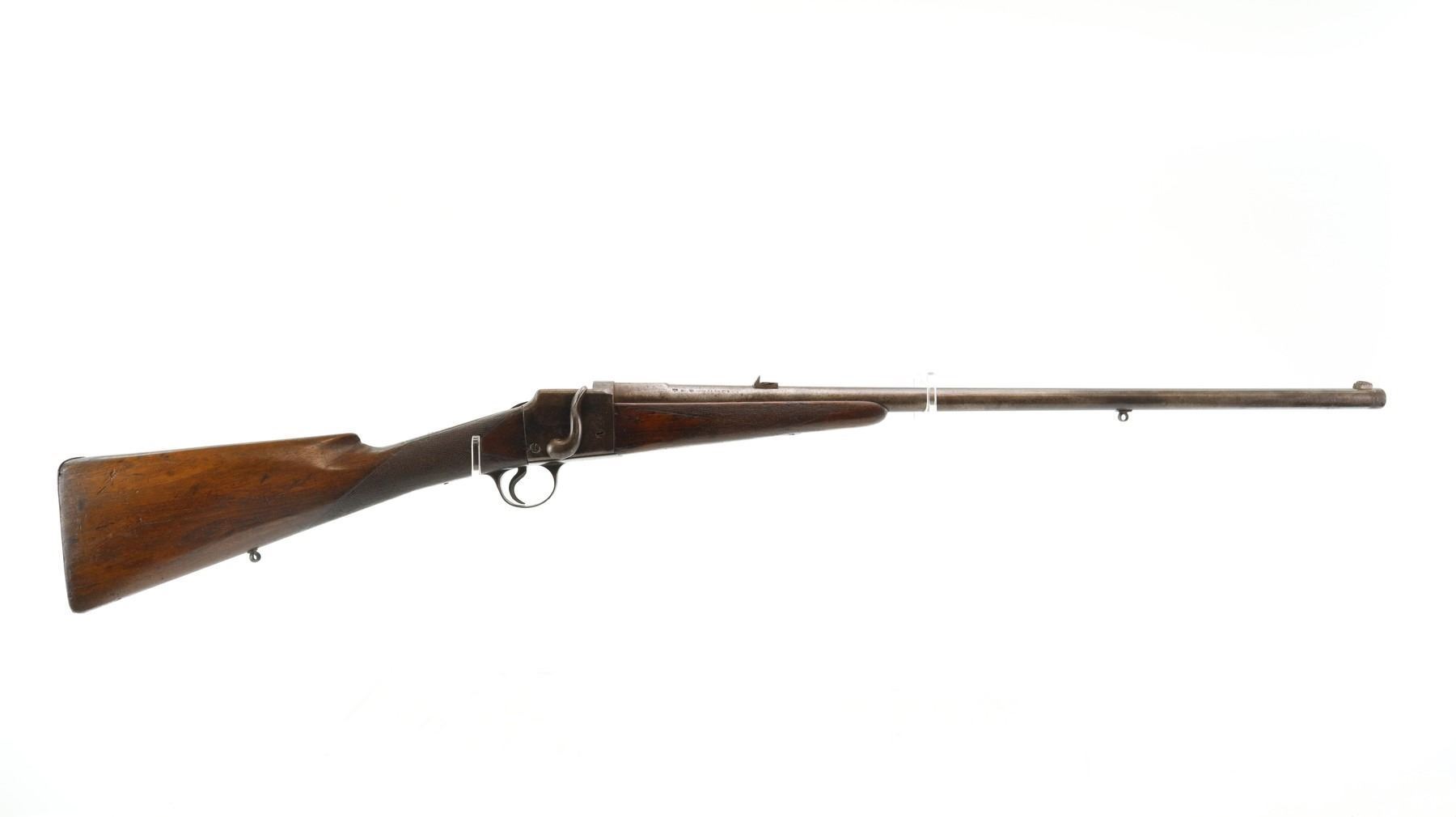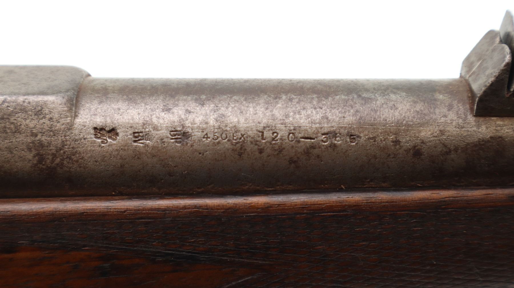 NRA POOR. FIELDS PATENT NO1927 . MODEL: FALLING BLOCK RIFLE. CALIBER: .450 EXPRESS 120-365. BORE IS POOR, PITTED, RUSTY. THIS RIFLE IS BRITISH MANUFACTURED DATED 1877. BLADE FRONT SIGHT WITH RAMP, U NOTCHED REAR SIGHT WITH ONE FIXED AND ONE FOLDING LEAF WITH SILVER SIGHT LINES, TAPERED ROUND BARREL, CHECKERED OPENING LEVER, HAMMER SPUR IS BROKEN OFF, ACTION DOES NOT FUNCTION, HAS EXTRACTOR, BREECH BLOCK AND TRIGGER, OPENING LEVER SCREW IS MISSING, LONG UPPER AND LOWER TANGS. TWO PIECE WOOD STOCKS, CHECKERED FOREARM WHICH IS CHIPPED, CHECKERED STRAIGHT GRIP WHICH IS CHIPPED AND HAS A SMALL CRACK BEHIND RECEIVER, SMOOTH STEEL BUTT PLATE WITH RUST, SWIVEL STUDS. METAL FINISH TURNING SILVER GREY WITH PITTING, RUST, HANDLING MARKS AND WEAR. STOCK SHOWS MARKS, SCRATCHES AND WEAR. ACTION: SINGLE SHOT DROP BLOCK RIFLE. BARREL LENGTH: 27.5". SERIAL # NA. CONDITION: NRA POOR. CLASS: CANADIAN ANTIQUE CLASS, NO LICENSE REQUIRED