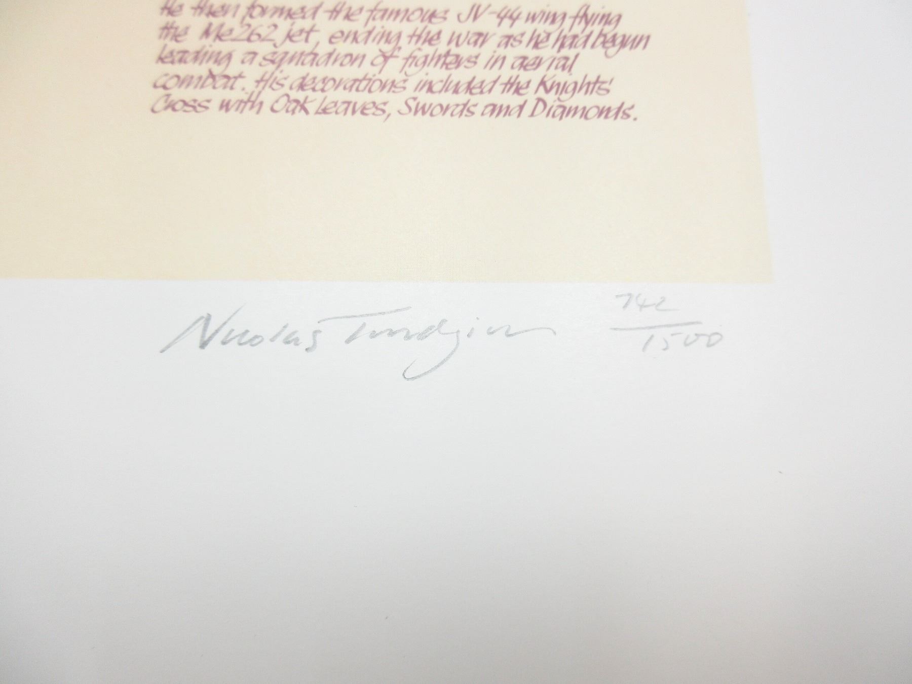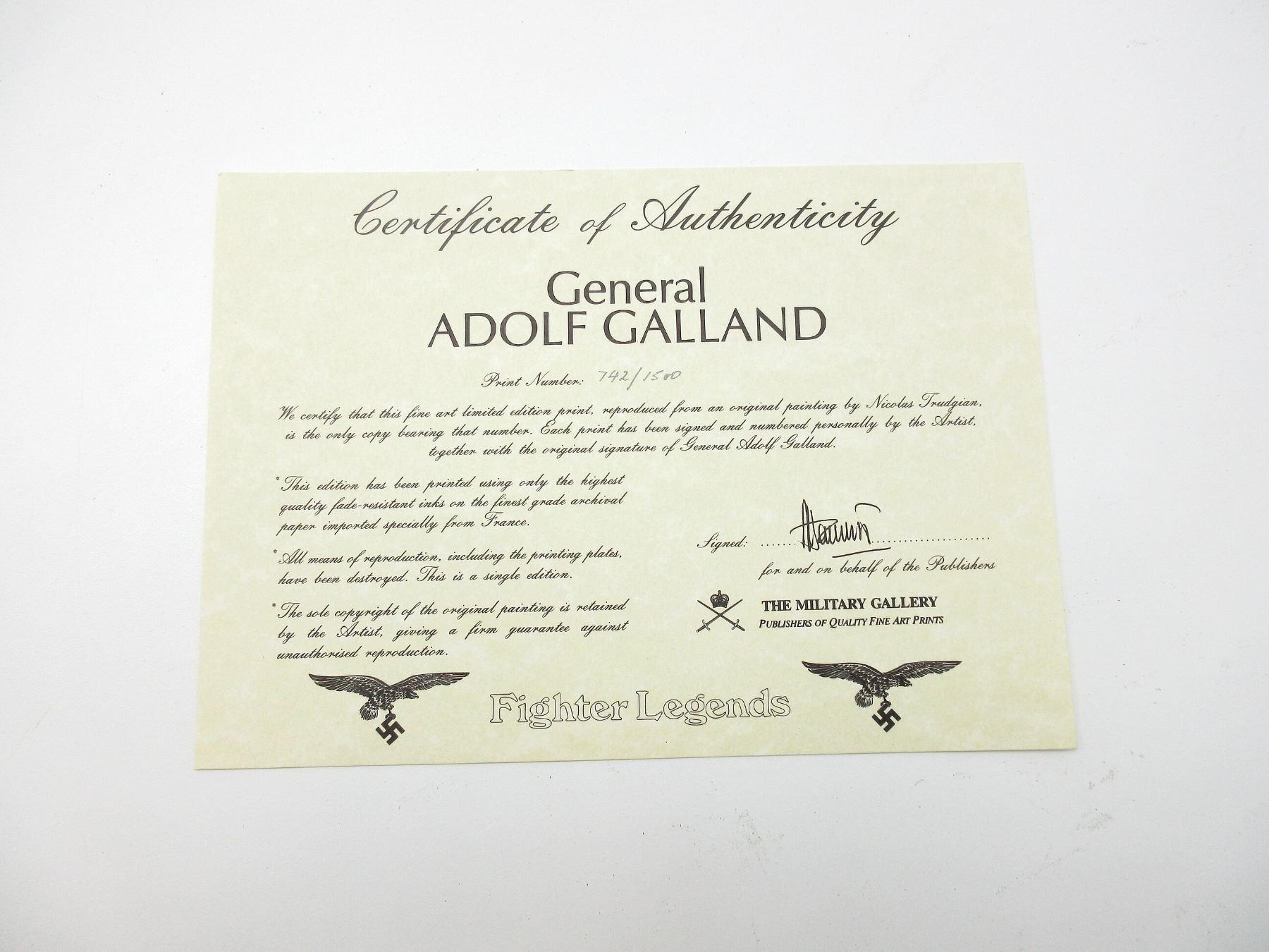 (1) BY NICOLAS TRUDGIAN, SIGNED BY ARTIST & GENERAL ADOLF GALLAND, PRINT NO. 742 / 1500, WITH CERTIFICATE OF AUTHENTICITY, PUBLISHED BY THE MILITARY GALLERY, BATH, ENGLAND 1991, PRINT APPROX. 23 5/8" X 17.5". SEE PHOTOS.