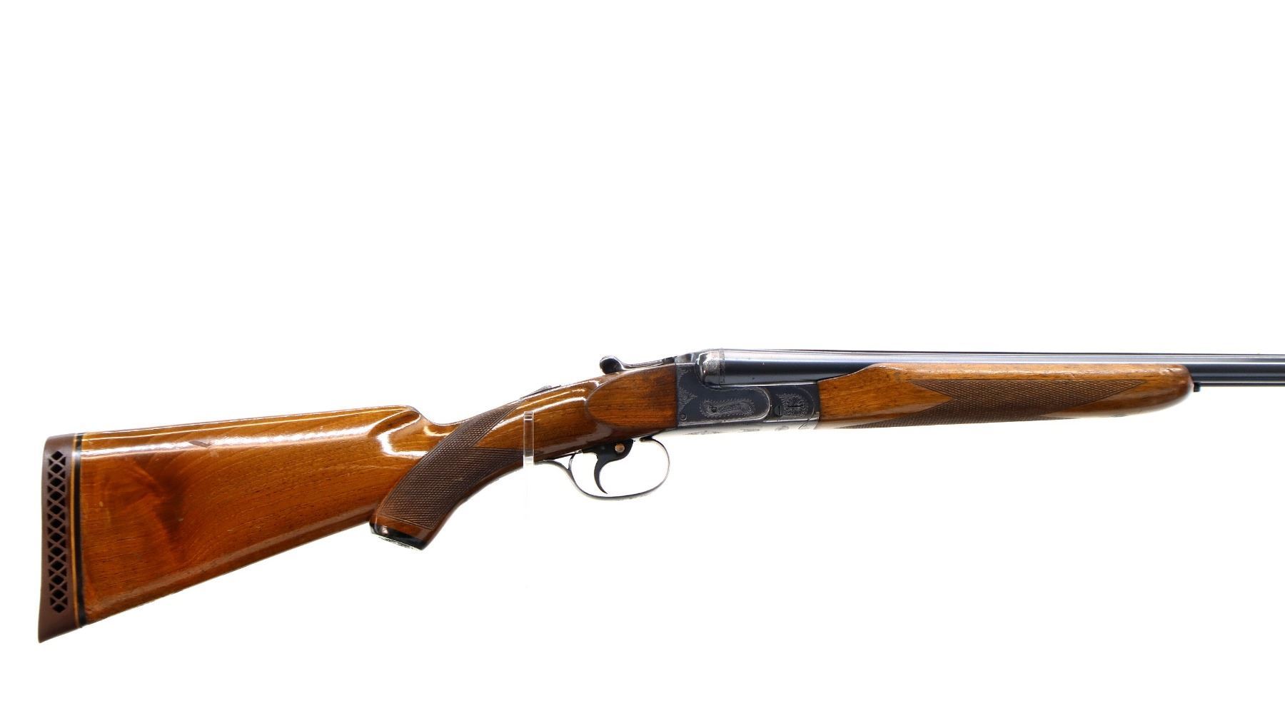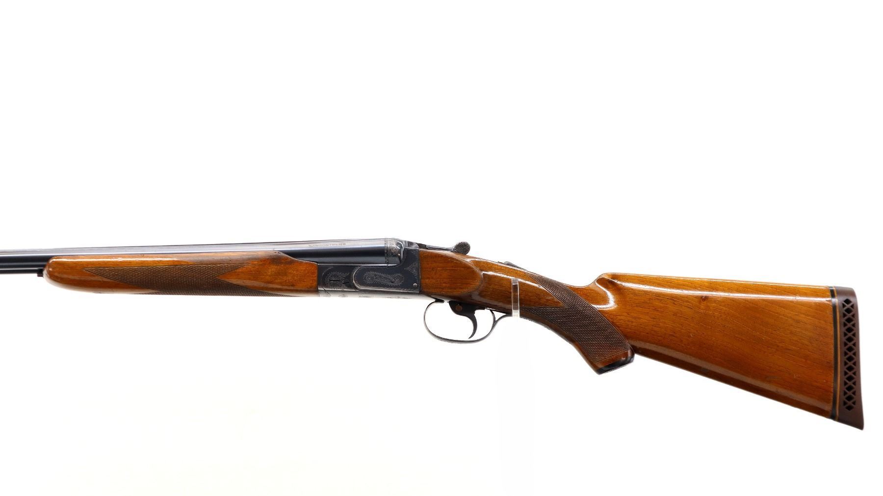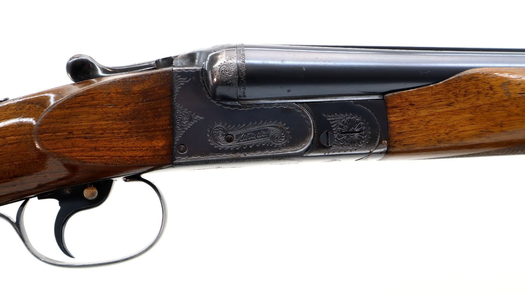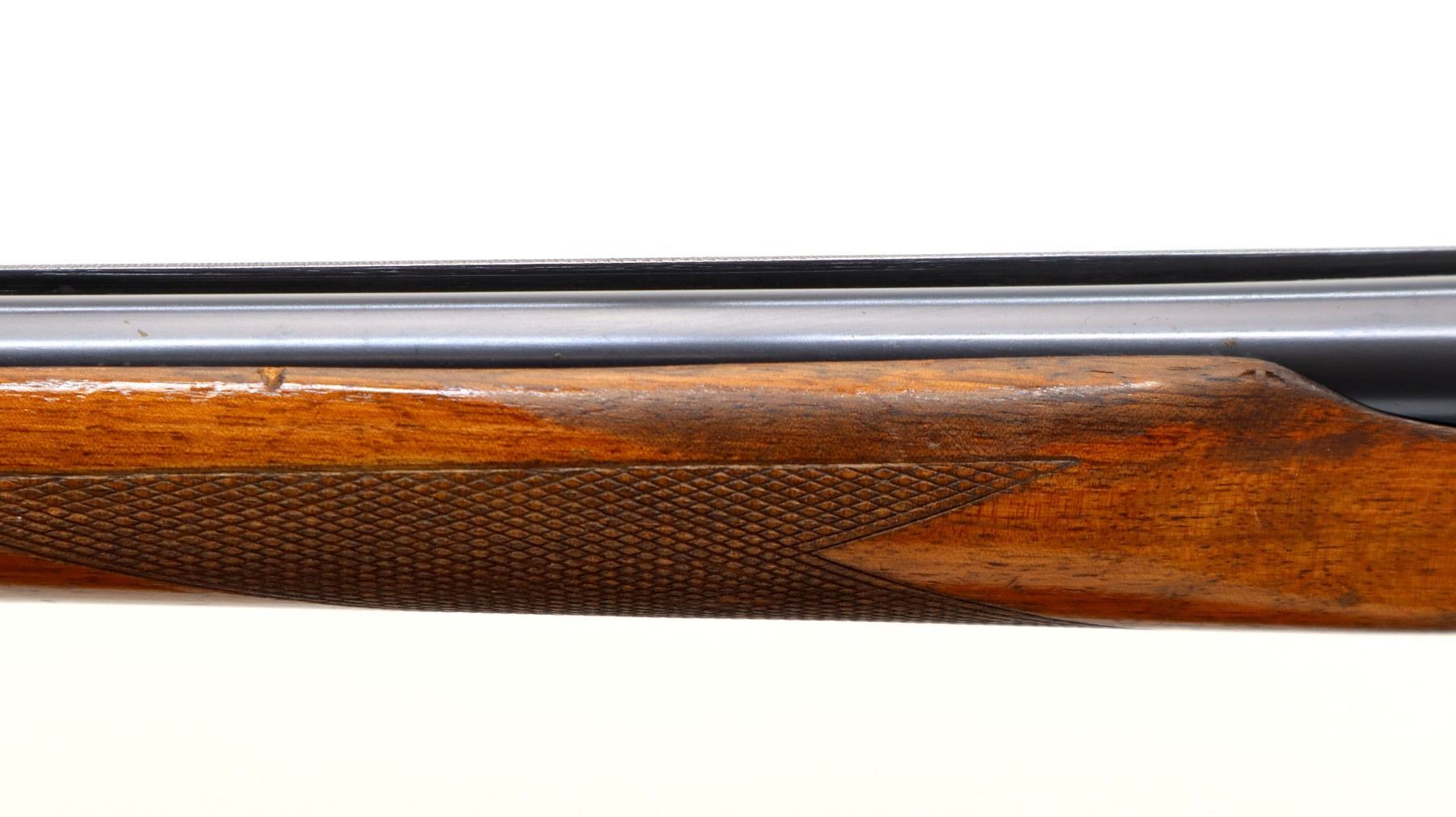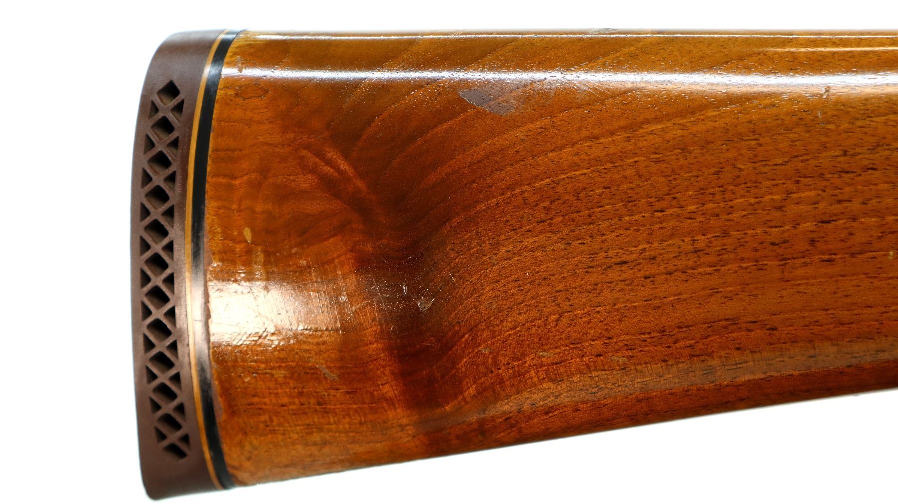 Main Description: White front and mid rib beads, blued finish, raised rib, engraved receiver, automatic safety, ejectors, single selective mechanical trigger. Two piece wood stocks, checkered Beavertail forearm and pistol grip, small chips behind receiver and tang, brown vented rubber recoil pad, 13.5" LOP, grip cap.