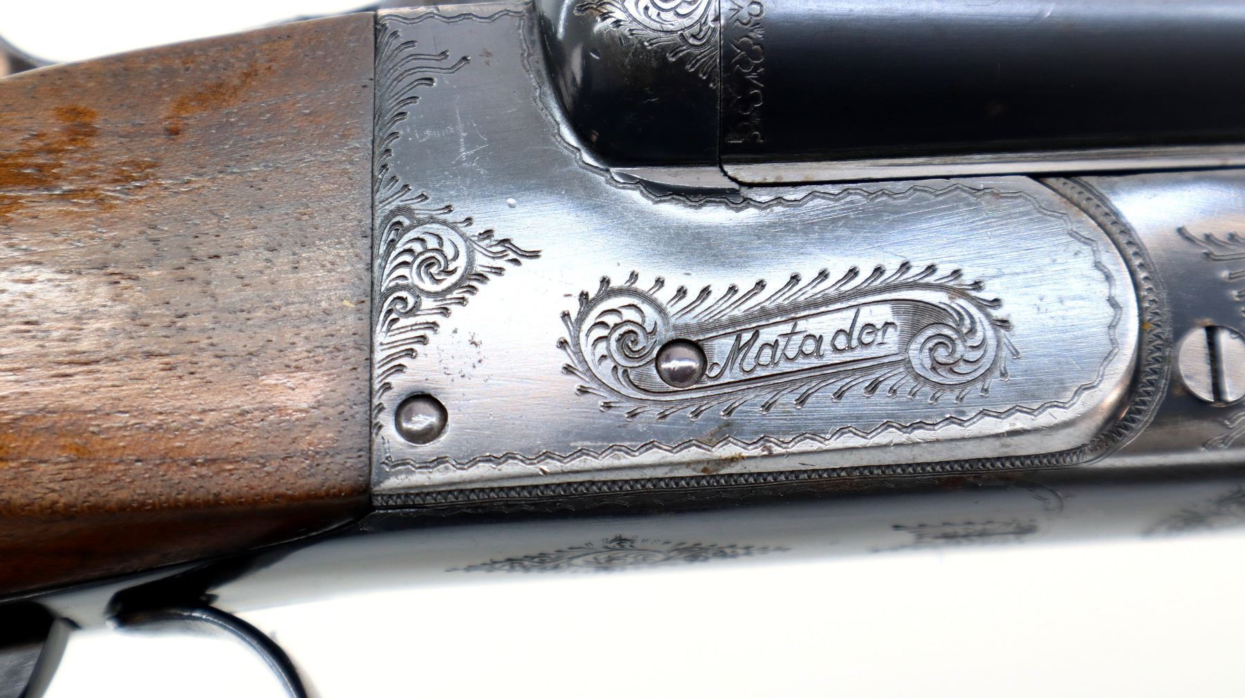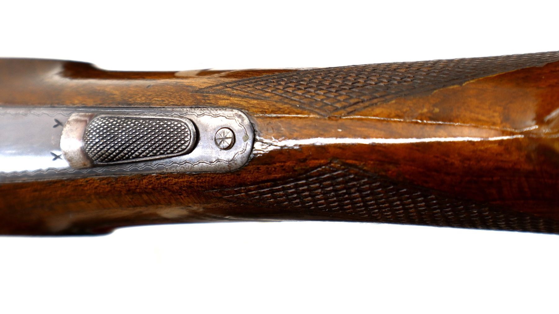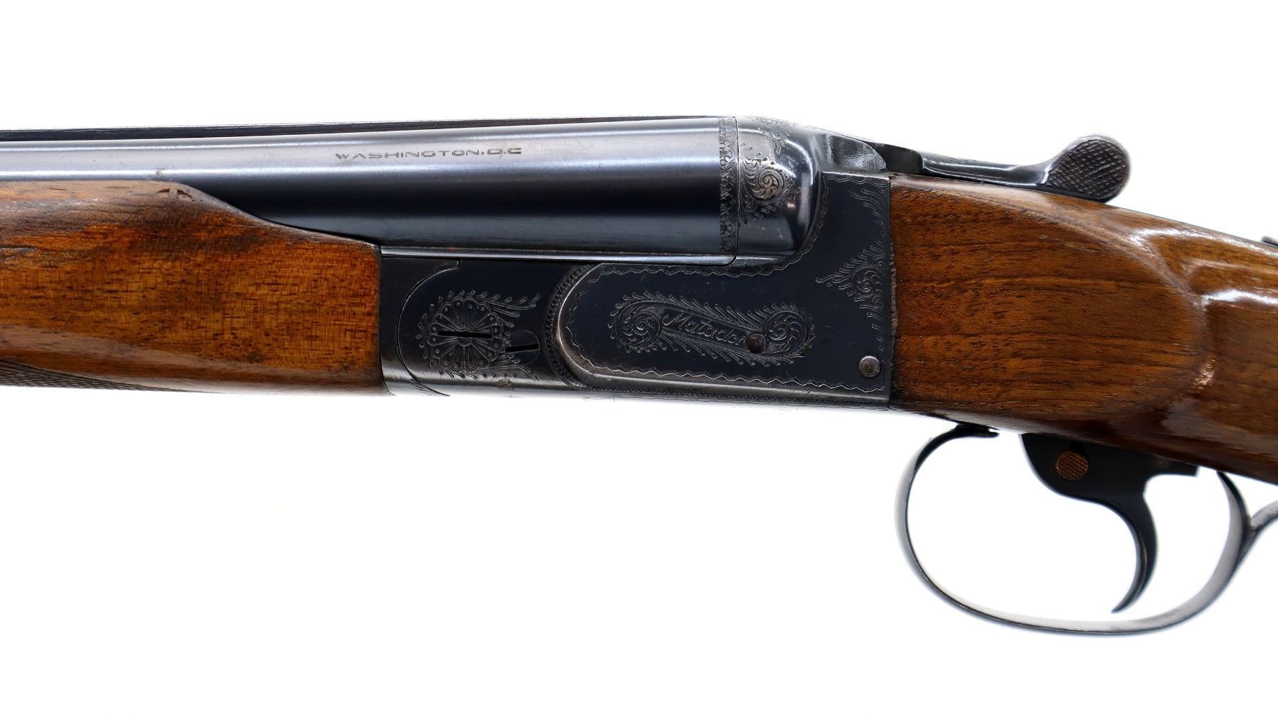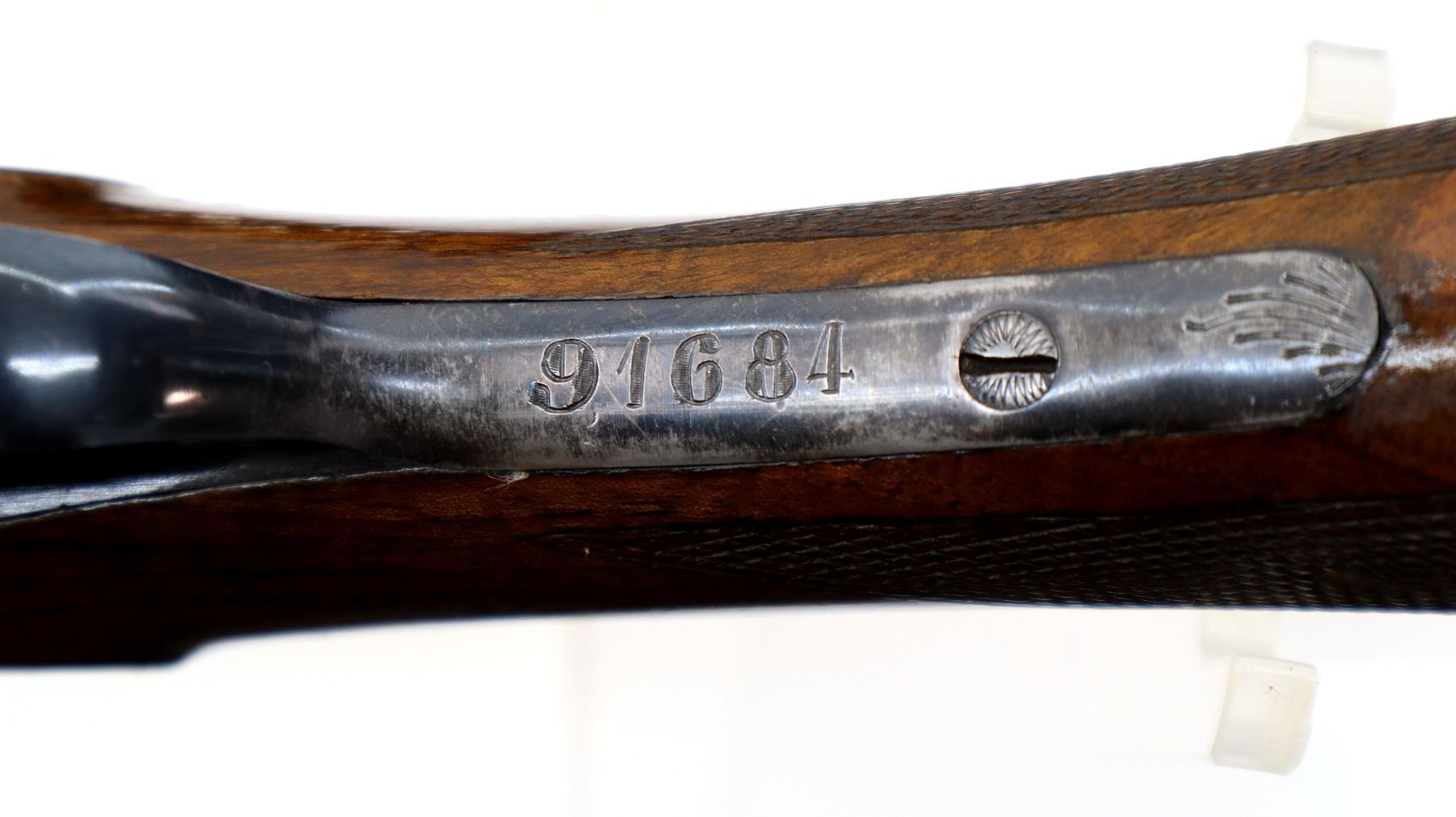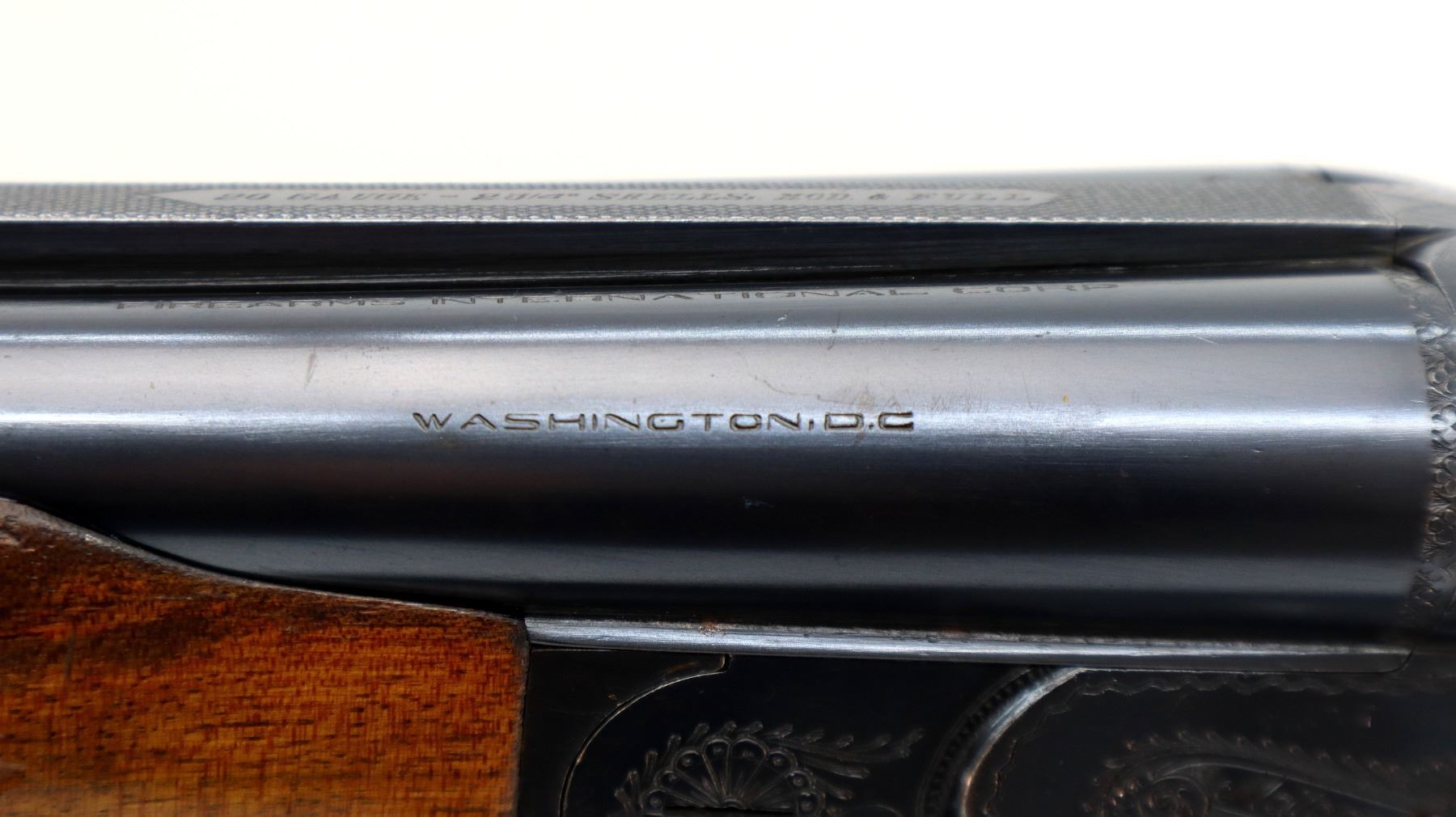 Main Description: White front and mid rib beads, blued finish, raised rib, engraved receiver, automatic safety, ejectors, single selective mechanical trigger. Two piece wood stocks, checkered Beavertail forearm and pistol grip, small chips behind receiver and tang, brown vented rubber recoil pad, 13.5" LOP, grip cap.