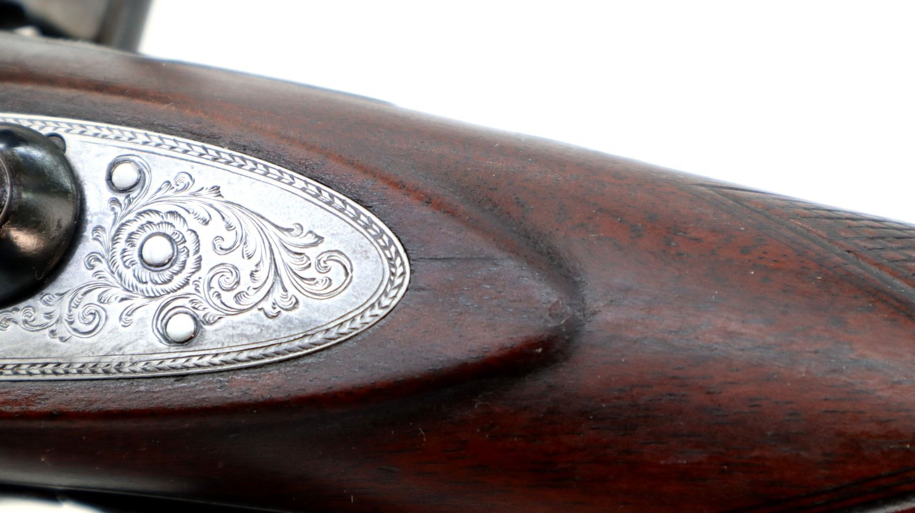Main Description: Blade front sight, adjustable u notched ladder rear sight with V notched four leaf folding express sight behind it, smooth barrels and rib with engraved breech plug and tang, Platinum blowout plugs. Engraved side locks (small cracks behind) with checkered spur hammers that function, replaced nipples. One piece half length wood stock, single forearm wedge, checkered forearm and straight grip with vanity plate, smooth steel butt plate, engraved patch box and finger rest trigger guard, swivel studs, wood ramrod with brass tip. Accessories include: Brass Minie .52 bore bullet mold, brass powder flask and oil bottle. Two piece wood cleaning rods, jag, nipple wrench.