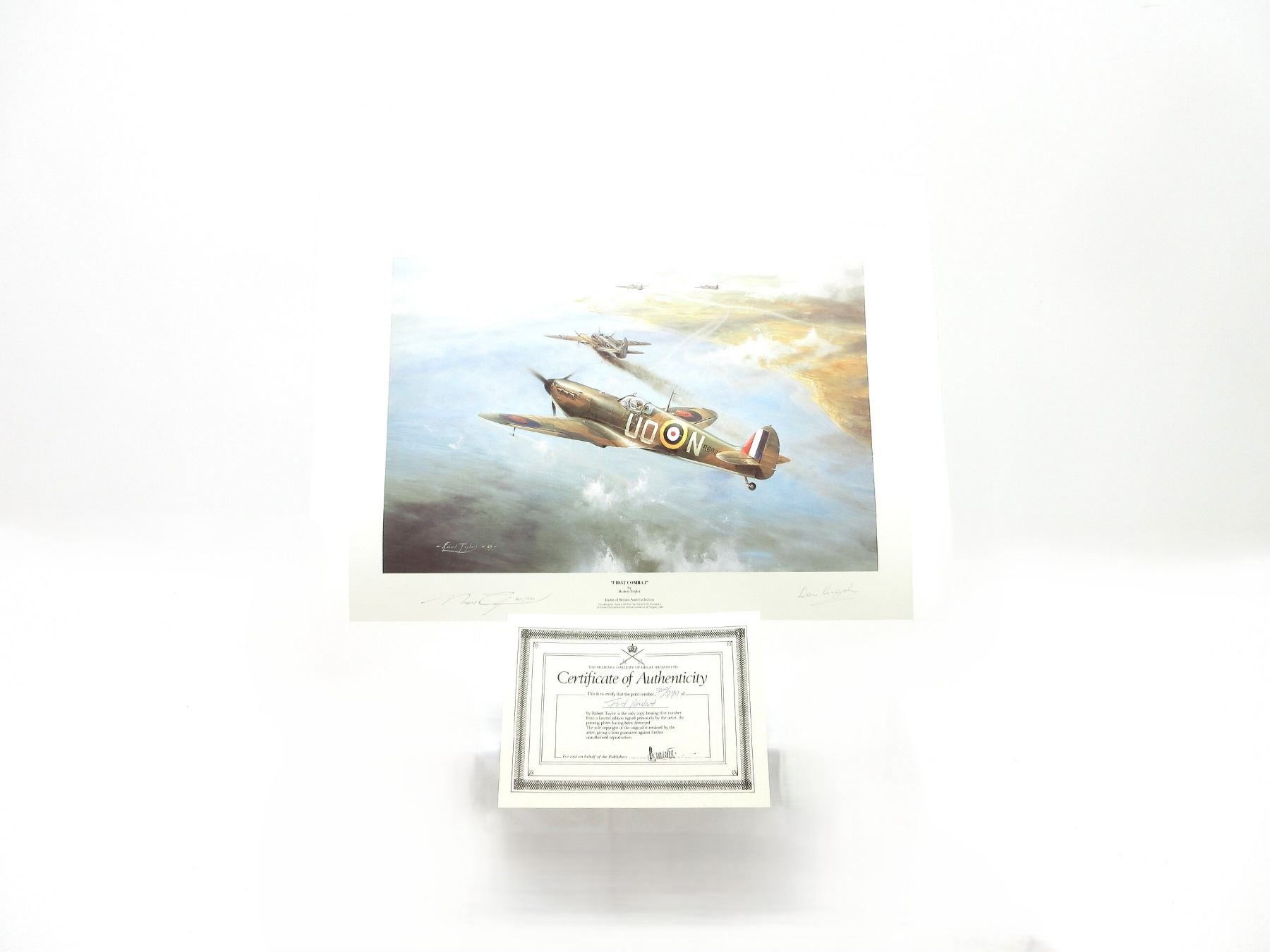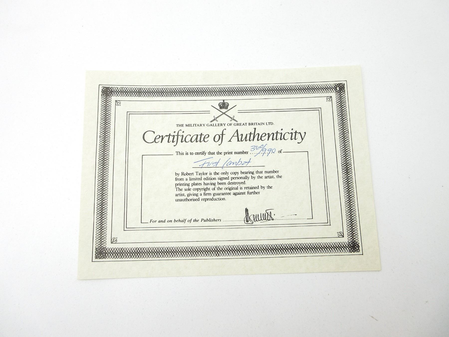 (1) BY ROBERT TAYLOR, VARIOUS SIGNATURES, PRINT NO. 360 / 990, WITH CERTIFICATE OF AUTHENTICITY, PUBLISHED BY THE MILITARY GALLERY, BATH, ENGLAND 1985, SMALL CREASE ON BACK & PRINT APPROX. 24" X 20". SEE PHOTOS.