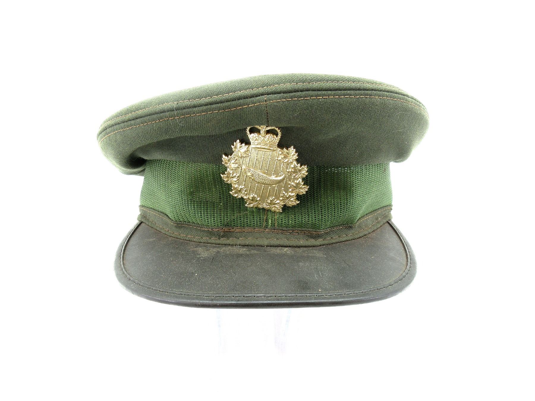 (1) GREEN FORAGE CAP WITH FISHERIES MANAGEMENT, DEPARTMENT OF FISHERIES & OCEANS CAP BADGE, CAP MARKED: "STOKES, CAP & REGALIA LTD., SCARBOROUGH-ONTARIO" ETC., LEATHER HEAD BAND (STIFF), MESH OUTER BAND, SHOWS AGE / WEAR. SEE PHOTOS.