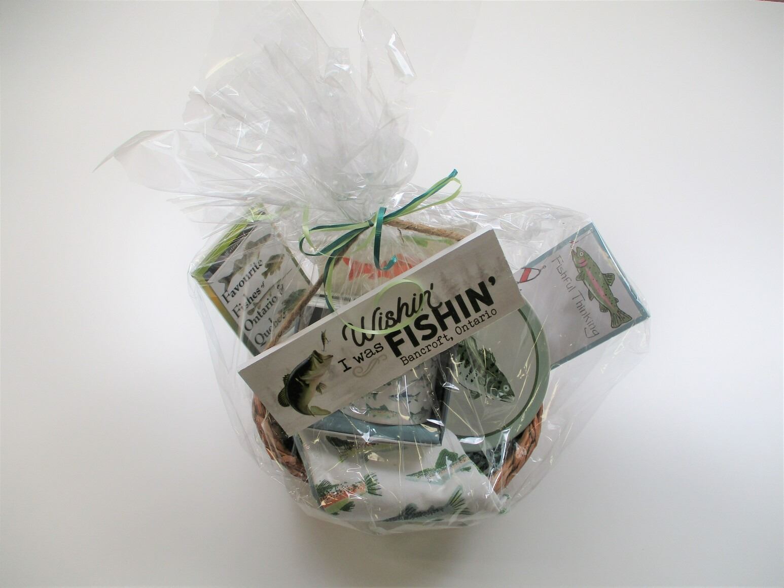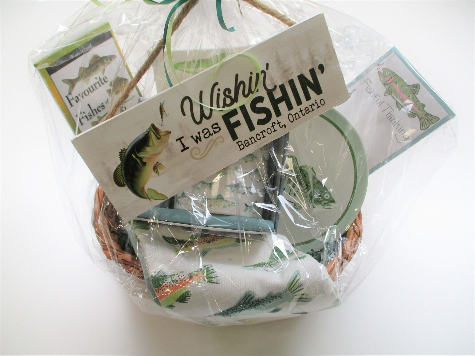 FISHFUL THINKING GIFT BASKET , FOR THE PERSON WHO LOVES FISHING THIS WOODEN SIGN, WATERPROOF GUIDE, COZY MUG, PLATE, DISH TOWELS & NOTEPAD , RETAIL VALUE $80, GENEROUSLY DONATED BY WEST WIND