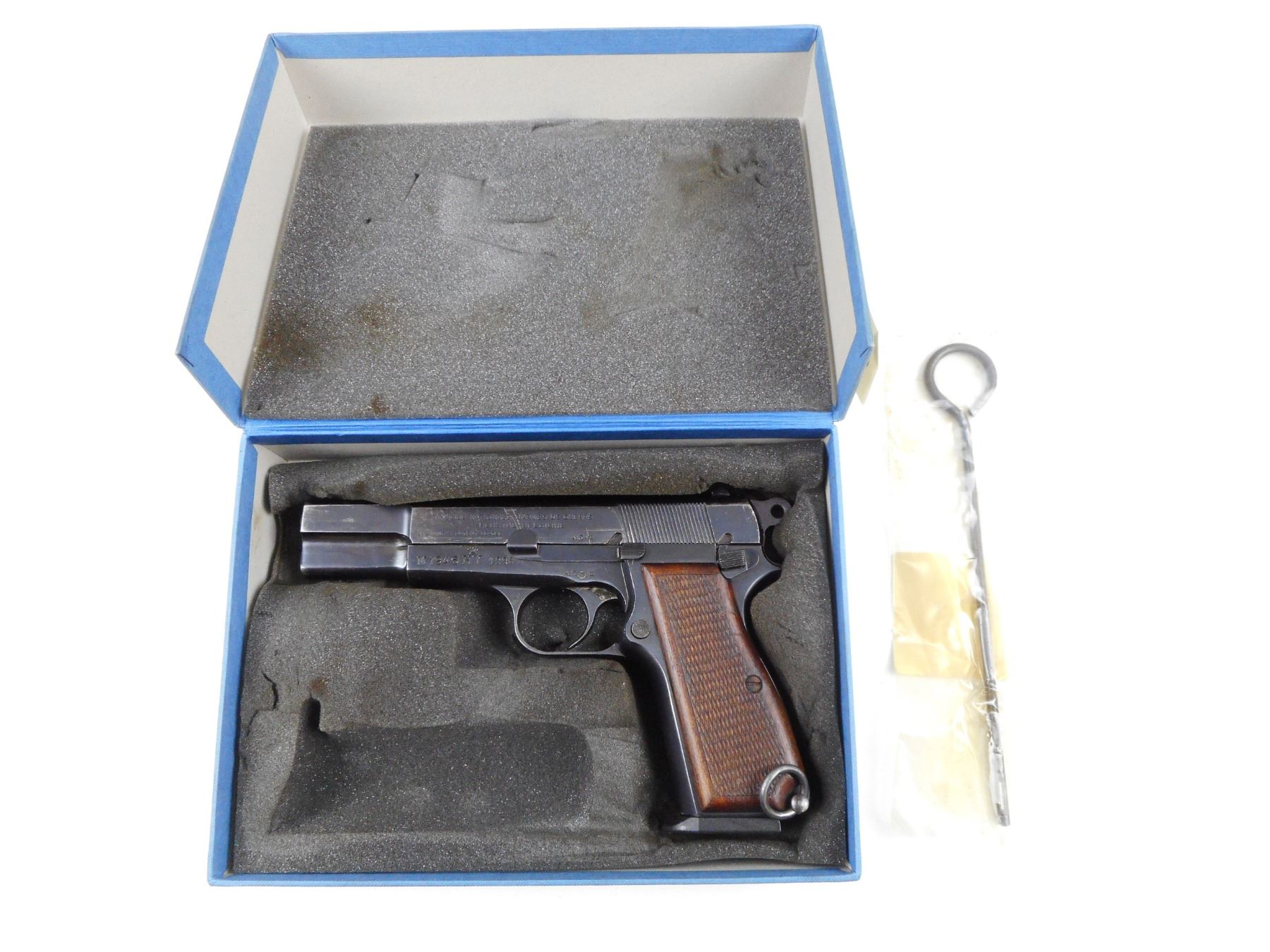 FN BROWNING , MODEL: HIGH POWER MODEL 1946 , CALIBER: 9MM LUGER , COMES WITH BOX AND A MAGAZINE, DANISH CONTRACT, BORE IS VERY GOOD, BLADE FRONT AND FIXED REAR SIGHTS, COMBAT HAMMER, CHECKERED WOOD GRIP PANELS, LANYARD LOOP AND RING, SHOWS SOME HANDLING MARKS , SERIAL # 1296 , STOCK # 4193 , ACTION: SEMI-AUTOMAIC HANDGUN , BARREL LENGTH: 117MM , CONDITION: 7/10 , CLASS: CANADIAN RESTRICTED CLASS