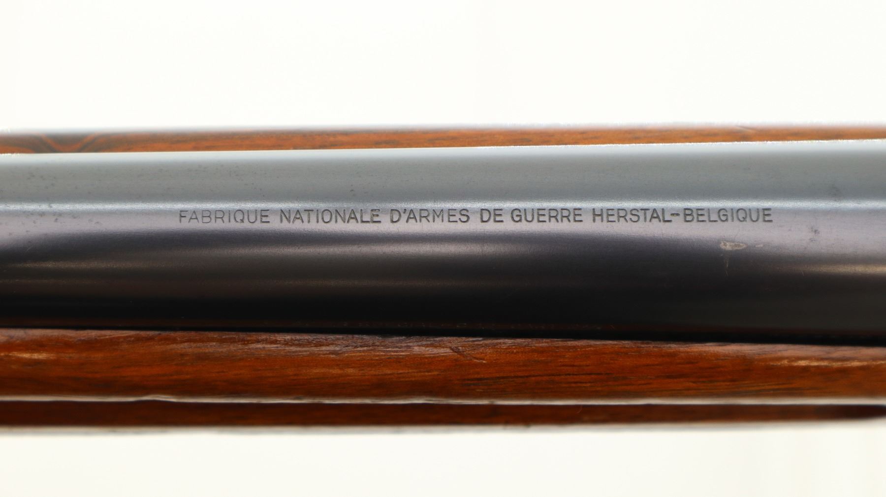 Main Description: Brass bead with ramp, polish blued finish, round barrel, checkered cocking handle, magazine tube cut off. Two piece wood stocks, finger grooved checkered forearm and pistol grip, FN Browning Automatic Logo Black polymer butt plate, sling swivels.