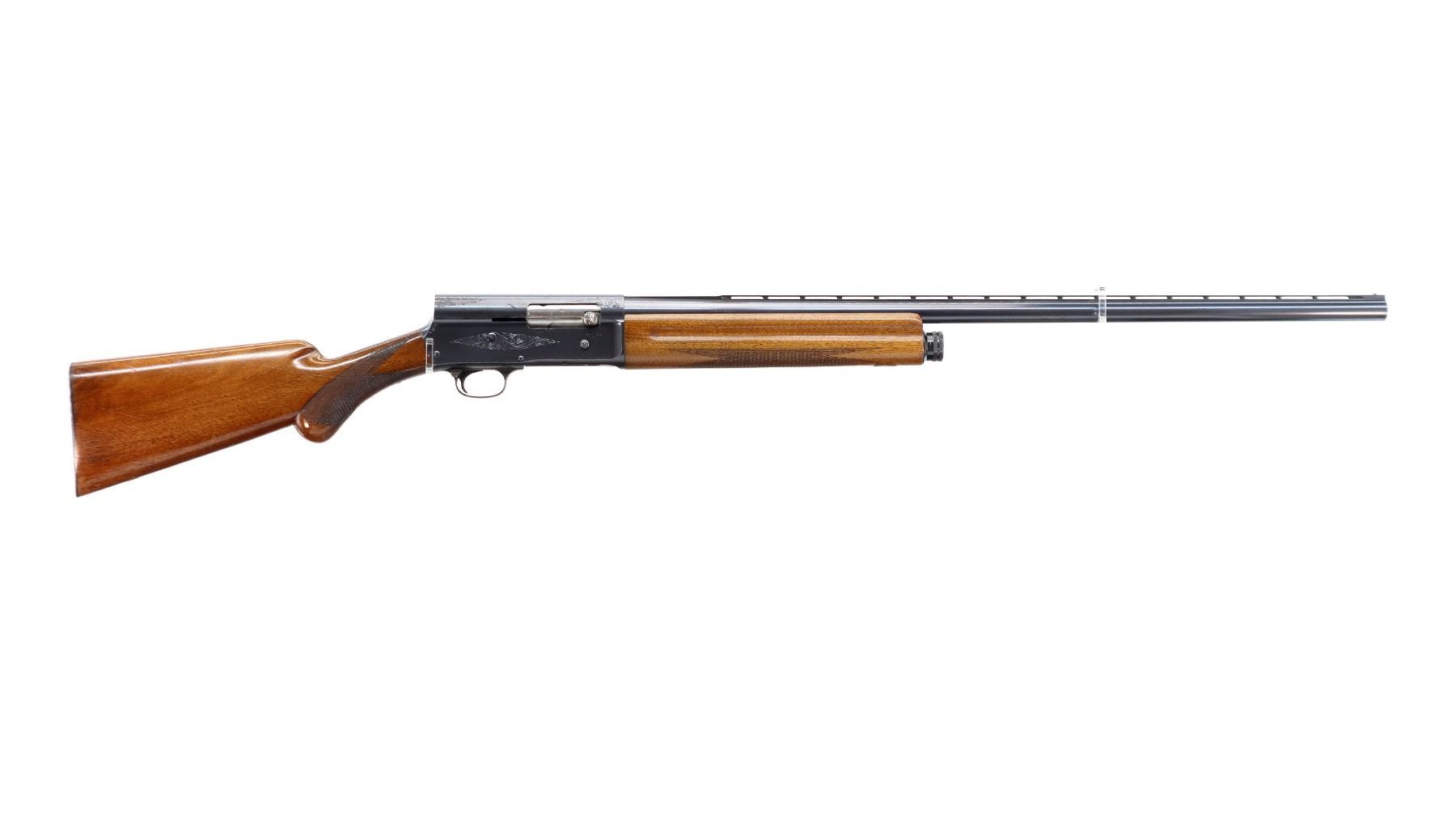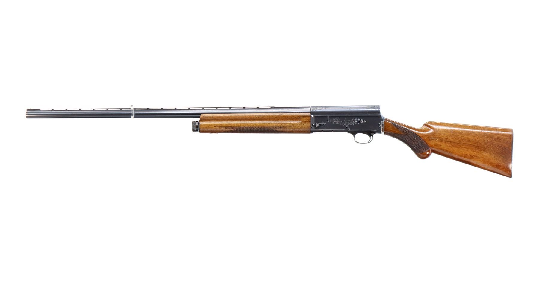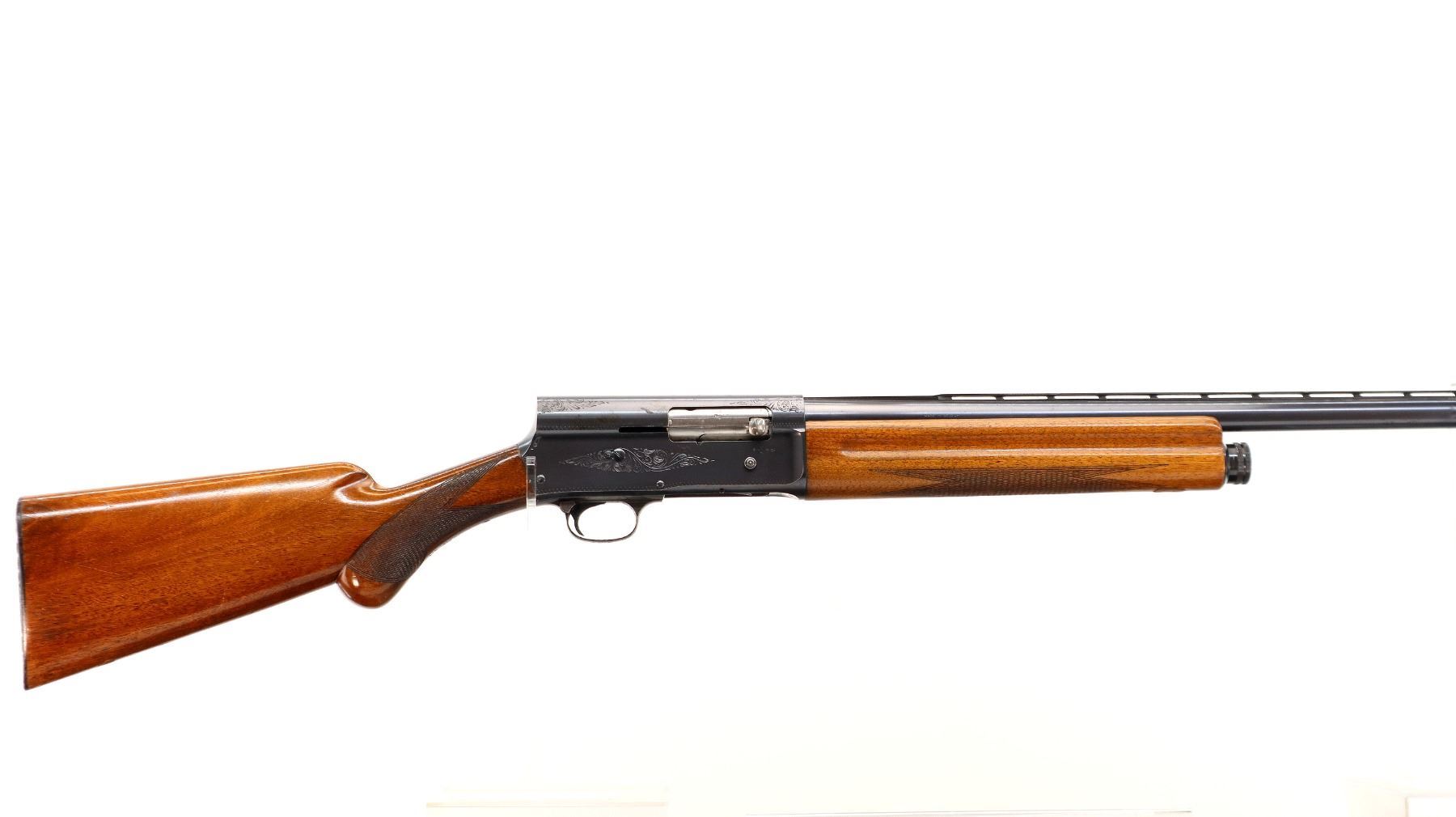 Main Description: Silver front and white mid rib beads, polish blued finish, vent rib, engraved receiver. Two piece wood stocks, finger grooved checkered forearm with repaired spot at front, checkered pistol grip, FN browning automatic black polymer butt plate. Repaired spot at toe.