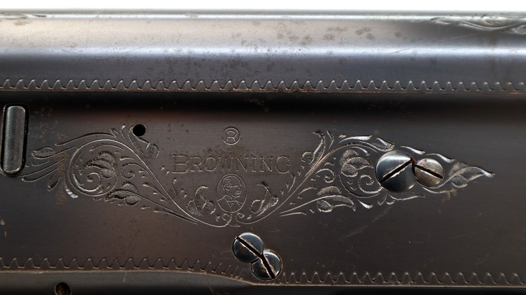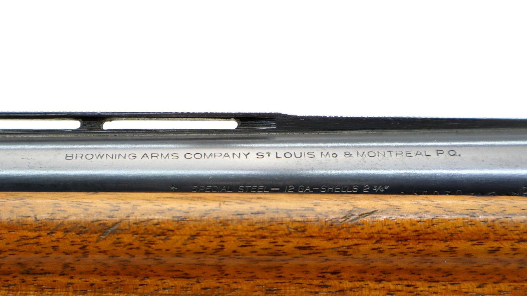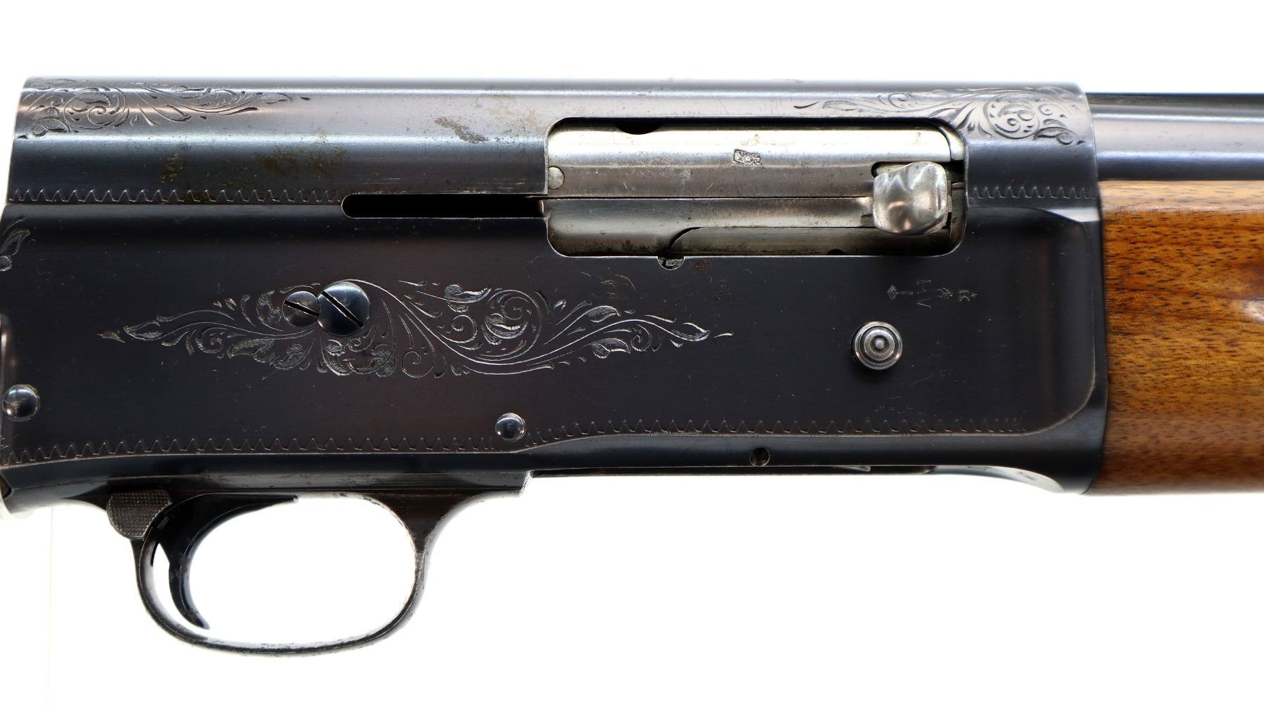 Main Description: Silver front and white mid rib beads, polish blued finish, vent rib, engraved receiver. Two piece wood stocks, finger grooved checkered forearm with repaired spot at front, checkered pistol grip, FN browning automatic black polymer butt plate. Repaired spot at toe.