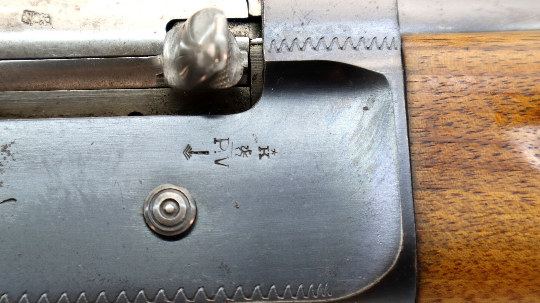 Wear: Metal finish shows some light rust speckles, scratches, handling marks and wear. Stocks show some marks, scratches and wear.