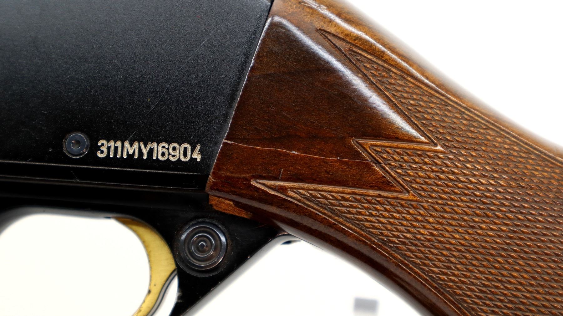 Main Description: Missing front and rear sights, threaded holes filled with plug screws, blued barrel, black alloy receiver with one piece scope rail, gold trigger. Two piece wood stocks, checkered forearm and pistol grip which is chipped and cracked, black vented rubber recoil pad, sling swivels.