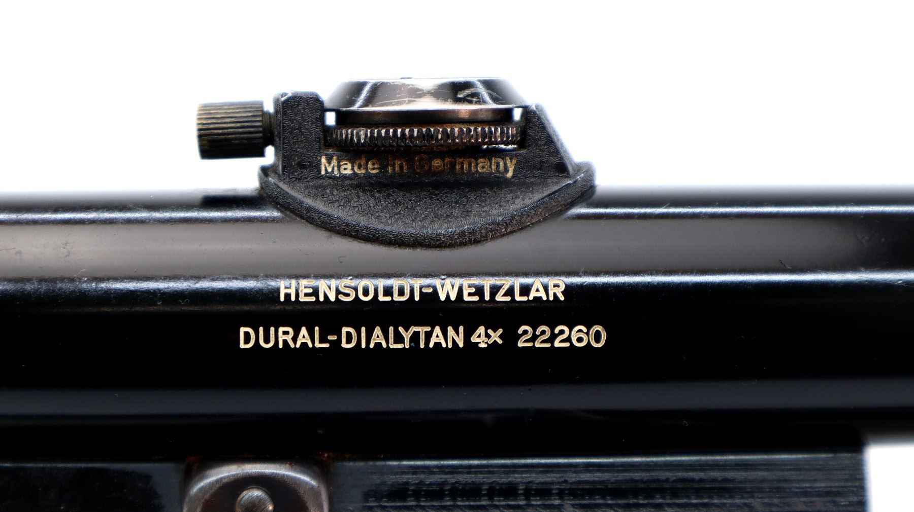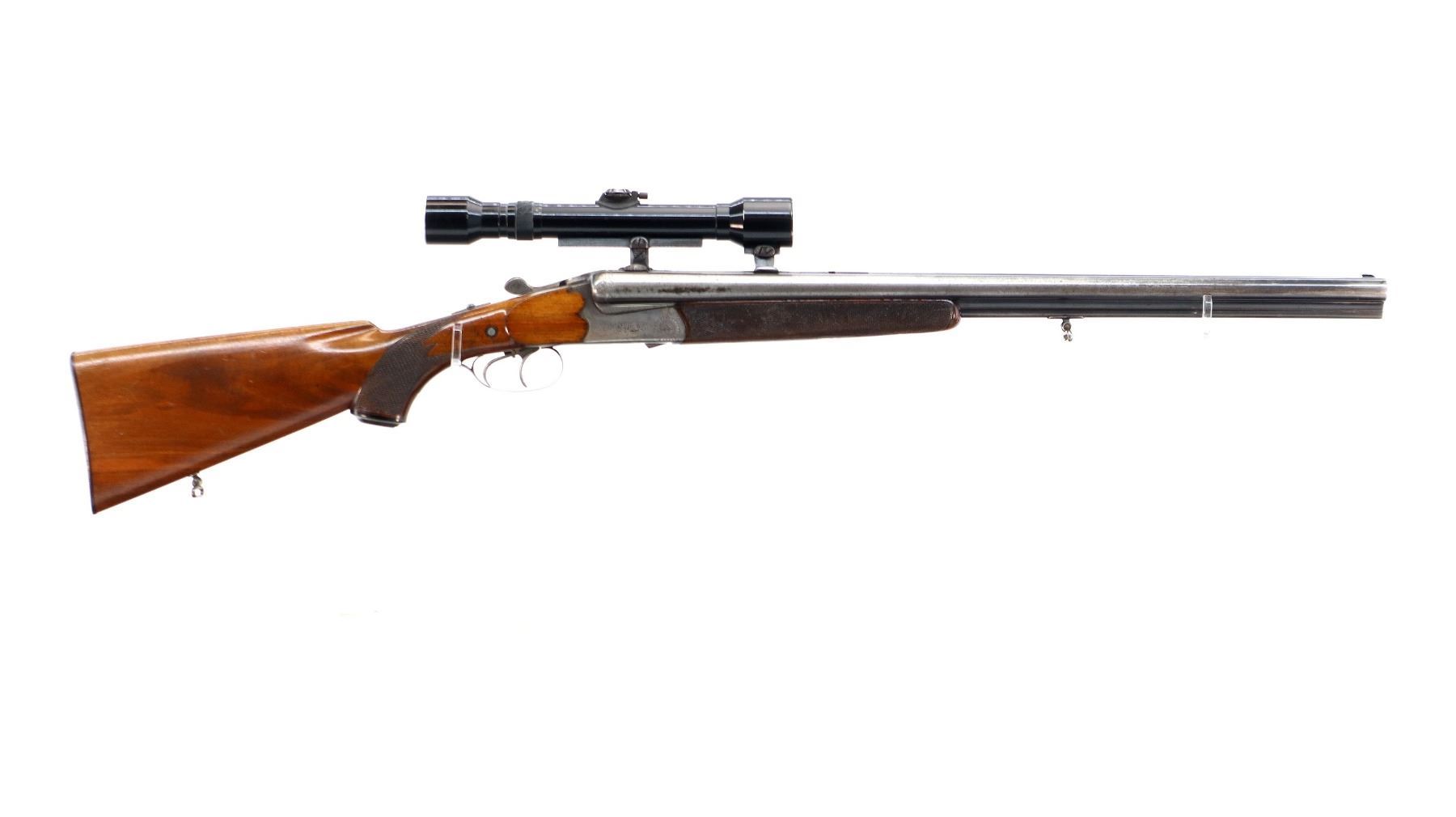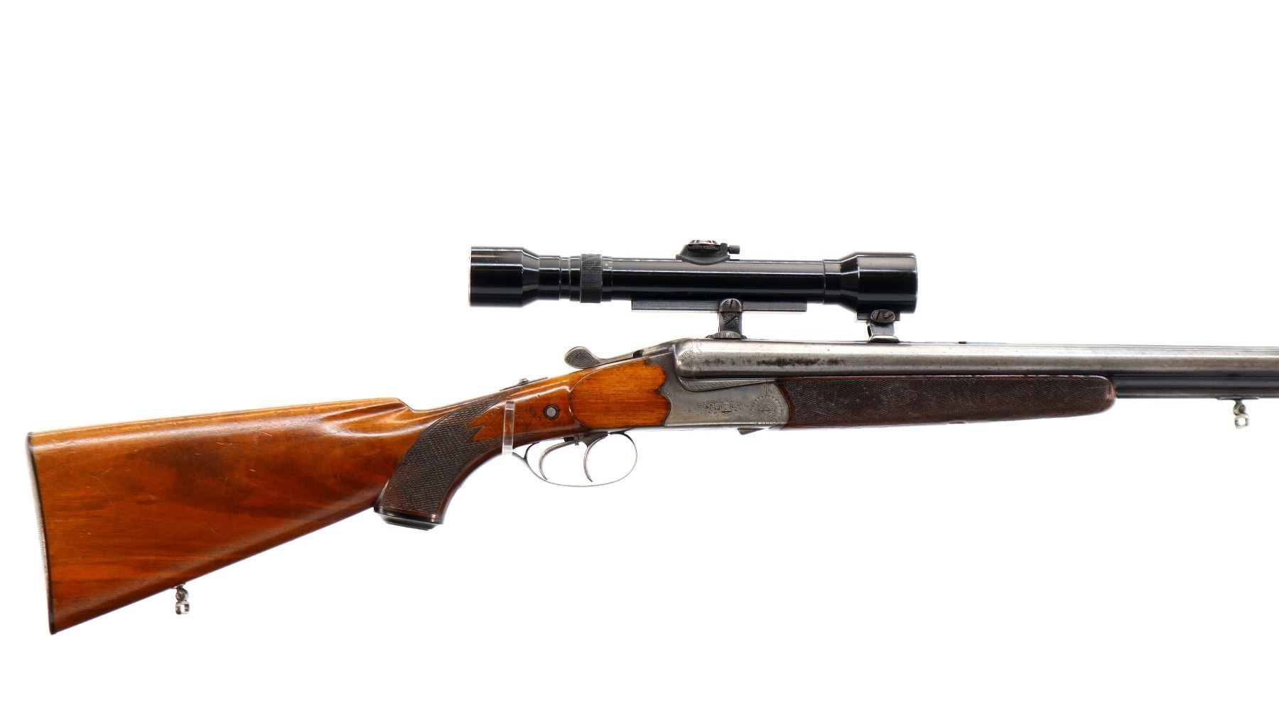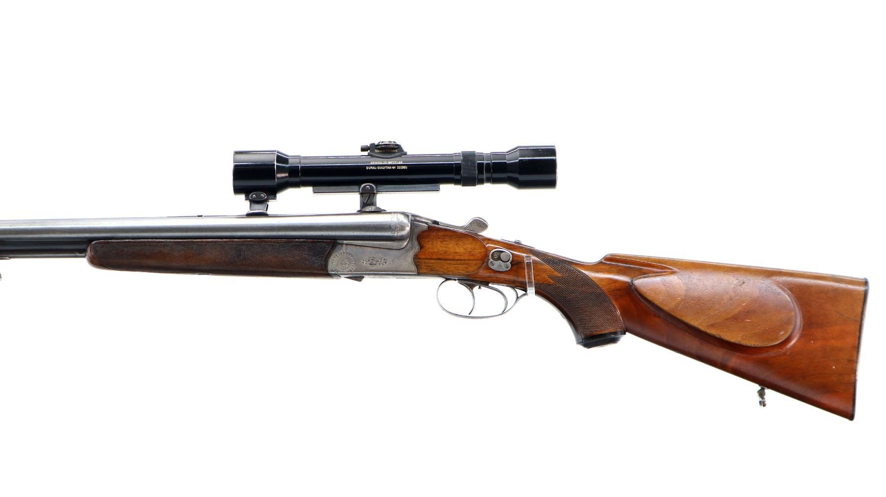 Main Description: Blade front sight, folding u notched rear sight activated by checkered button on upper tang, grooved rib with QD Claw mount bases with a Hensoldt Wetzlar Dural-Dialytan 4x scope installed, clear optics with German No1 Reticle. Safety on left side of stock, extractor, double triggers, engraved receiver. Two piece wood stocks, checkered forearm and pistol grip, small crack behind upper tang, European cheek rest, grooved horn butt plate, grip cap, sling swivels