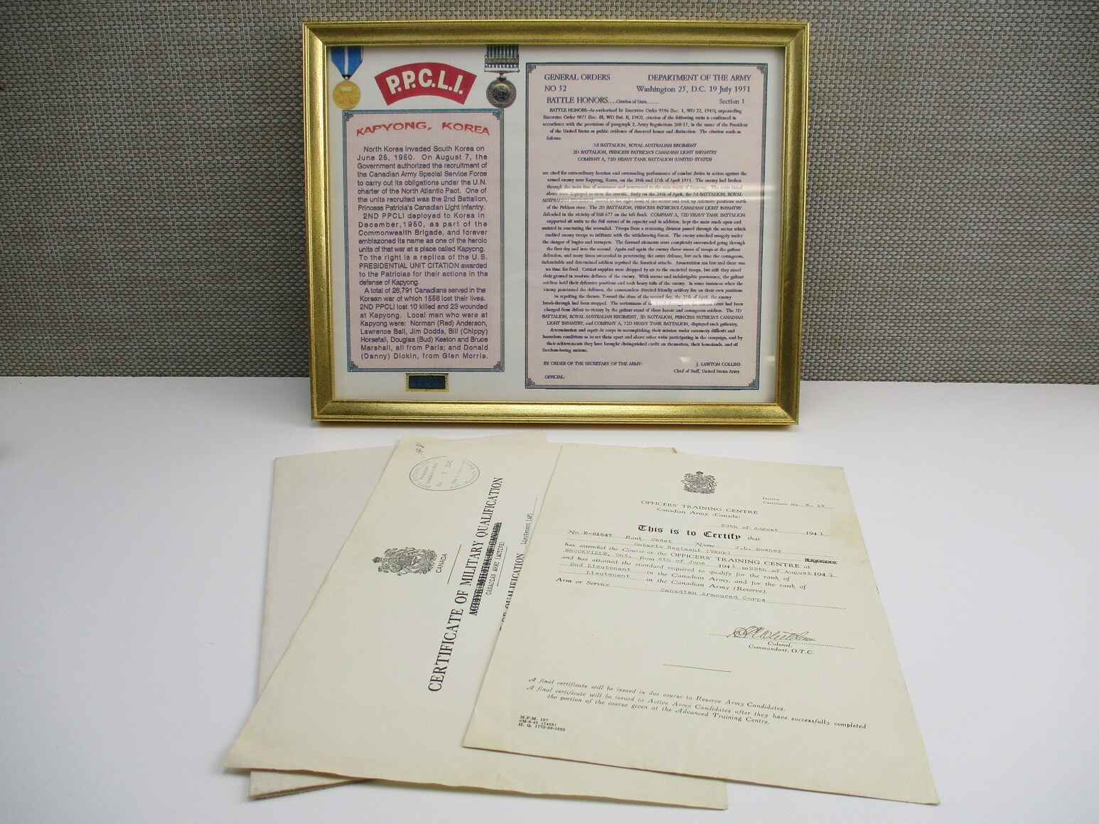 FRAMED GENERAL ORDER NO 52/JAMES LLOYD DOWNEY CERTIFICATES , (1) P.P.C.L.I FRAMED GENERAL ORDERS NO 52, DATED JULY 1951. (3) CERTIFICATES NAMED TO LIEUTENANT JAMES LLOYD DOWNEY, INCLUDING CERTIFICATE OF MILITARY QUALIFICATION, OFFICERS TRAINING CENTRE, OFFICER APPOINTMENT LETTER. NOTE: NO GUARANTEE ON GLASS SHIPPING.
