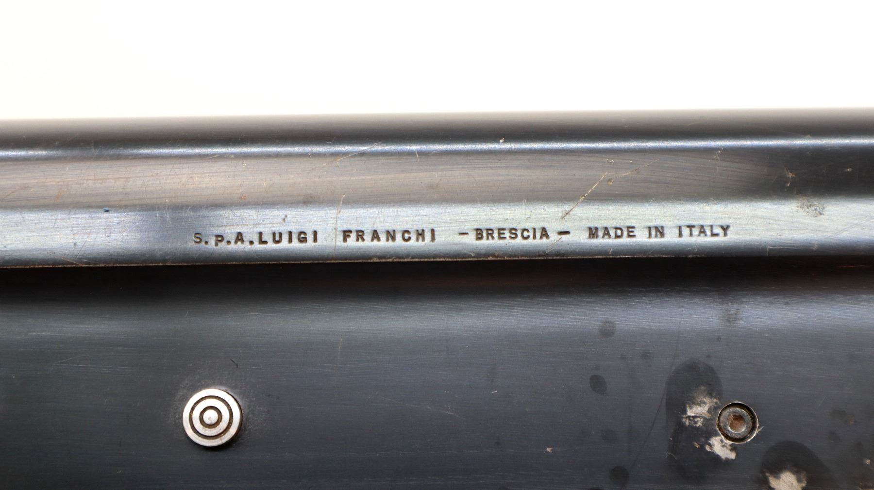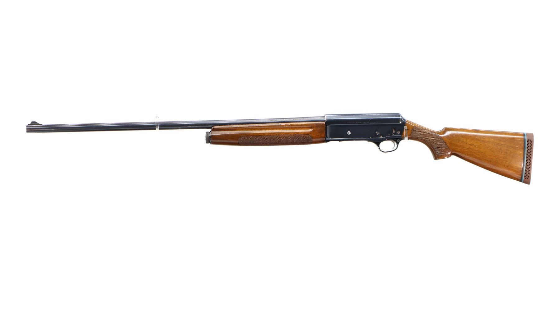 Main Description: Blade front sight, blued finish, round barrel. Two piece wood stocks, finger grooved checkered forearm which is cracked, checkered pistol grip chipped, cracked and loose behind receiver, brown vented rubber recoil pad.