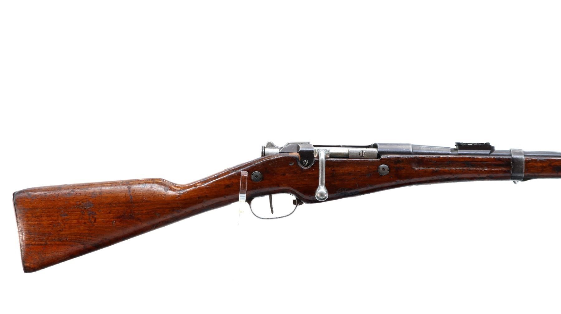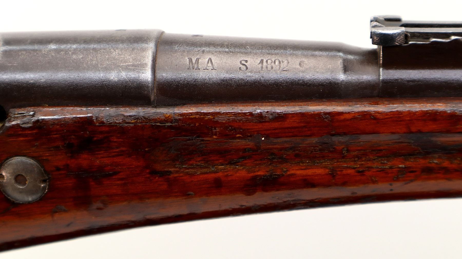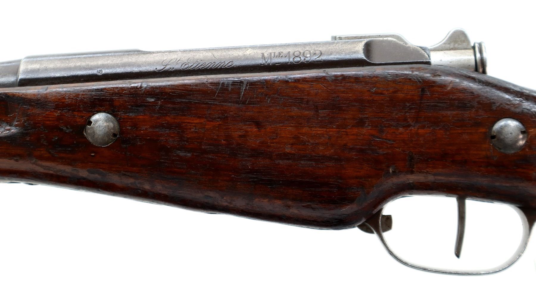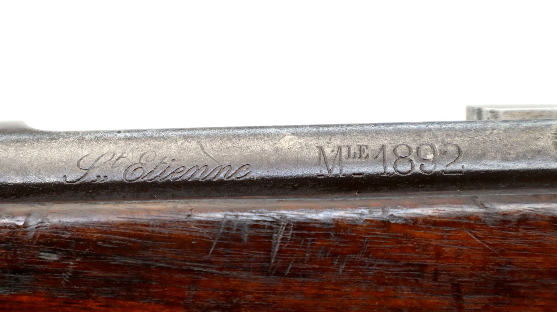Main Description: Manufactured by St Etienne 1892, visible serial numbers match. Blade front sight with ramp, adjustable u notched rear sight, silver bolt with turned down handle and flat bottomed knob, uses three round stripper clip. One piece full military wood stock, finger grooved forearm, straight grip, smooth steel butt plate, sling swivels, stock has small arsenal repairs, stacking hook, bayonet lug.