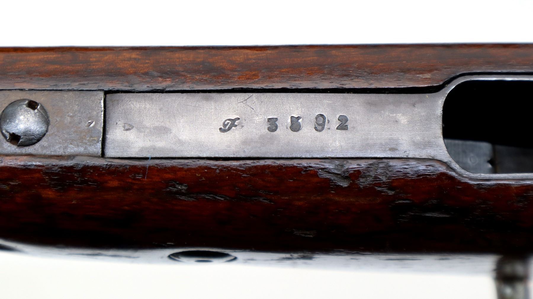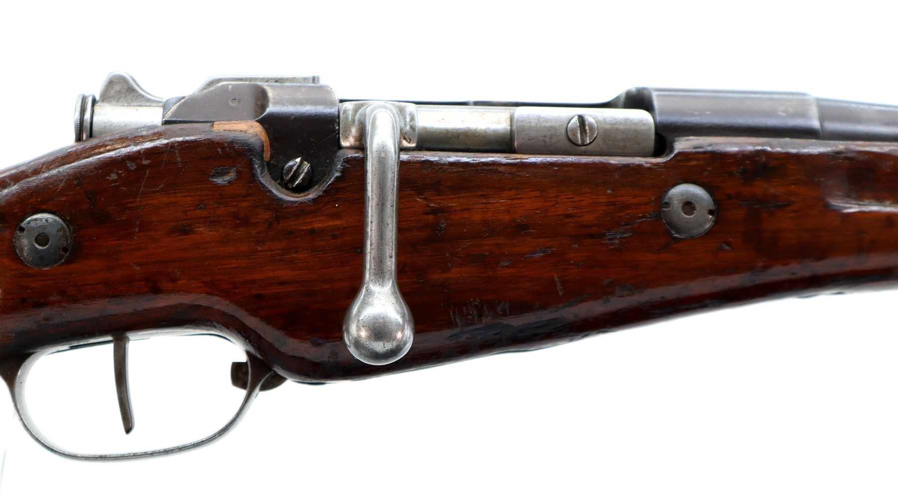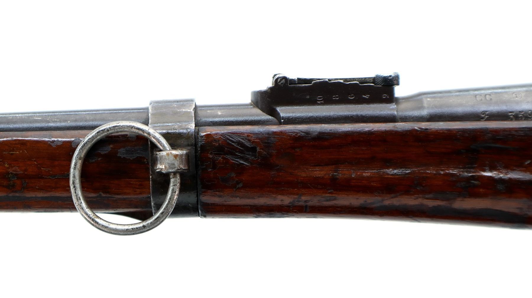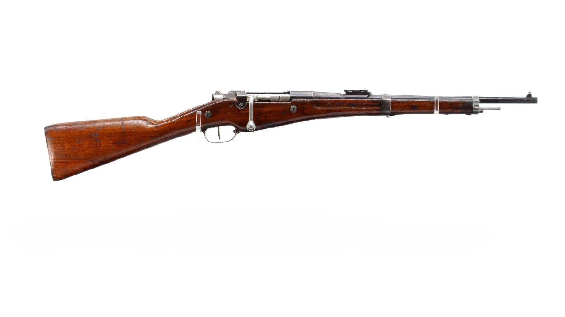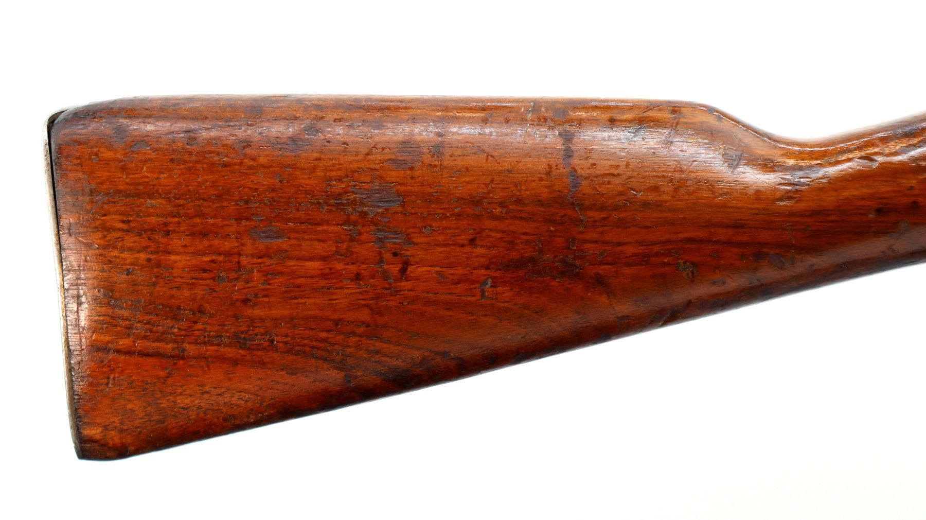Main Description: Manufactured by St Etienne 1892, visible serial numbers match. Blade front sight with ramp, adjustable u notched rear sight, silver bolt with turned down handle and flat bottomed knob, uses three round stripper clip. One piece full military wood stock, finger grooved forearm, straight grip, smooth steel butt plate, sling swivels, stock has small arsenal repairs, stacking hook, bayonet lug.